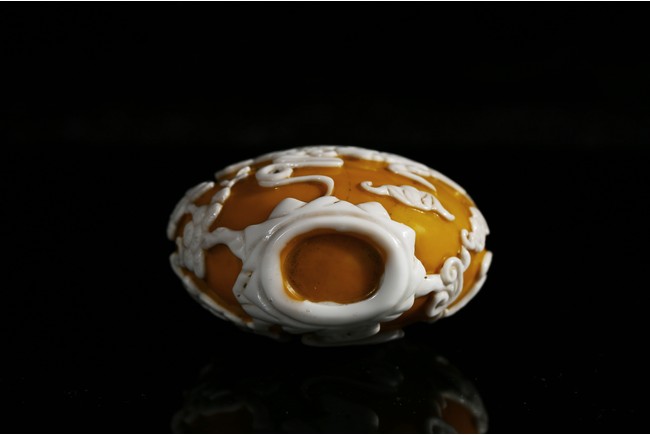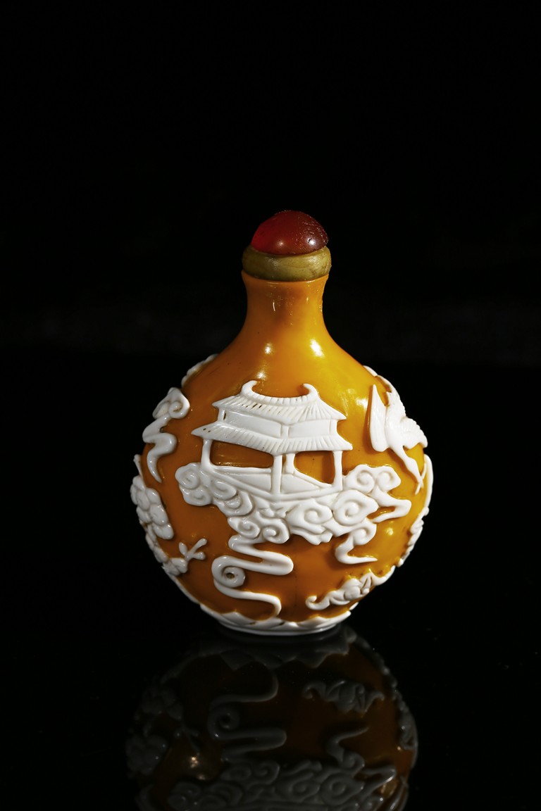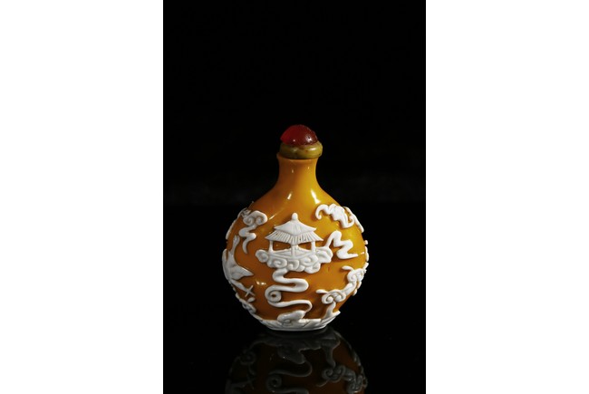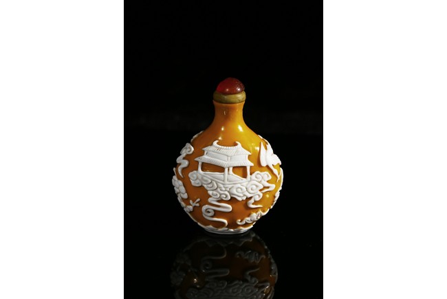 Of flattened-pear shaped form, finely carved with white glass overlay egg-yolk yellow glass, depicting scenes of heavenly palace upon clouds and auspicious bats and crane in flight. Qing Dynasty period.