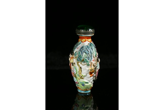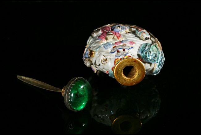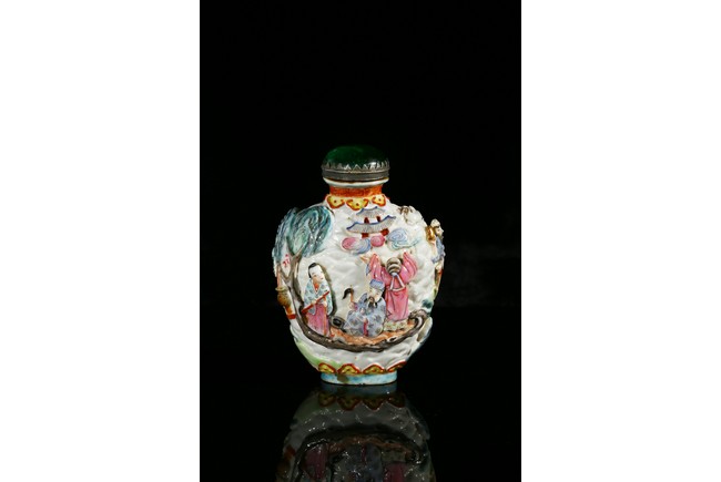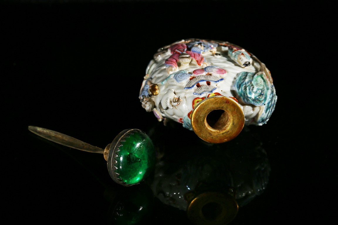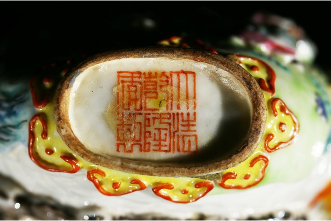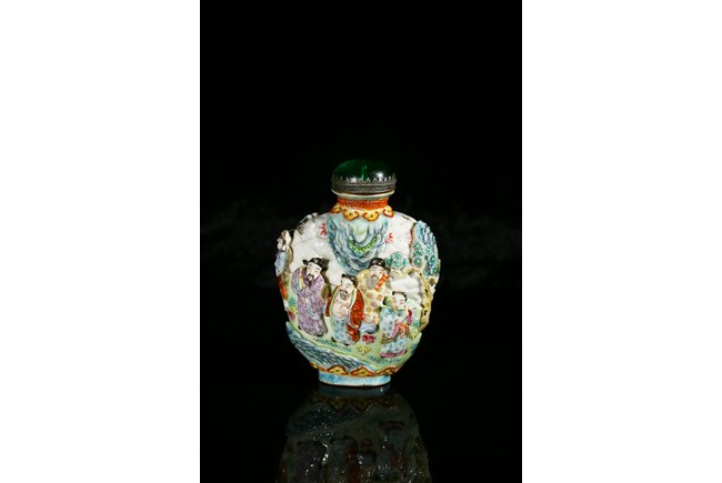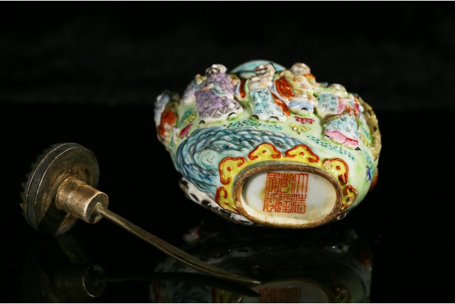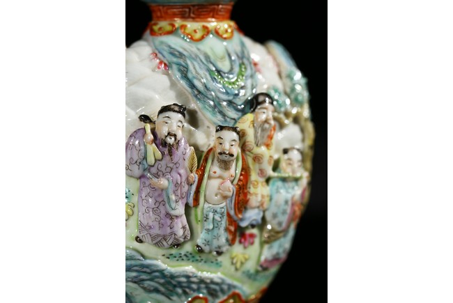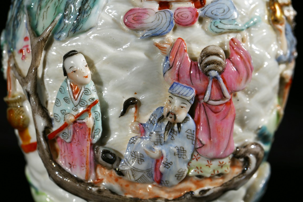 Moulded in high relief with a continuous scene of the Eight Immortals crossing the sea and arriving on the land, all highly detailed with facial features and wearing elaborate robes, further carved with pine tree and rockwork, all finely enamelled in various colours of red, green, blue, yellow, purple and orange on a white ground. The mouth gilt painted. The base with six character 'QIANLONG' mark. Qing Dynasty Qianlong Period.