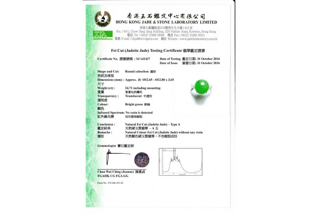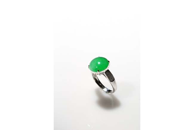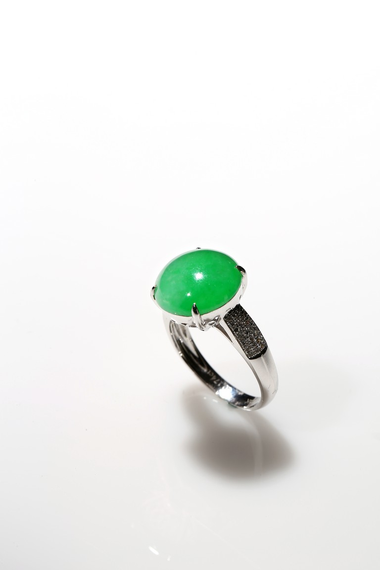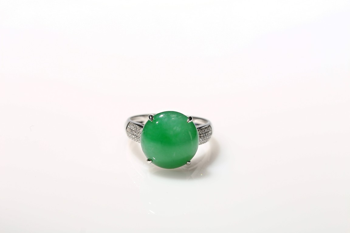 正圓形蘋果綠翡翠蛋麵戒指,色澤陽俏均勻款式高檔,蛋麵約12.65 x 12.80毫米。大氣,罕見,高貴,帶香港玉石鑑定中心證書保證A貨。