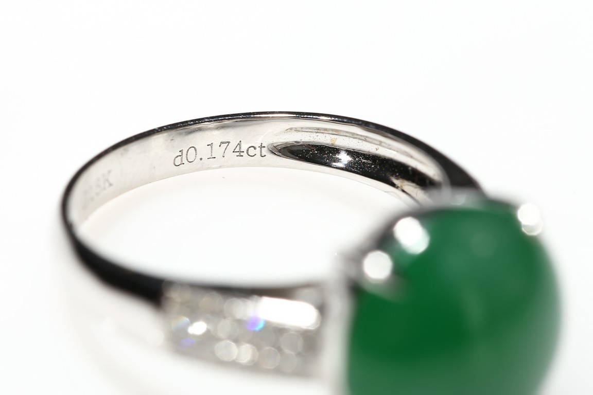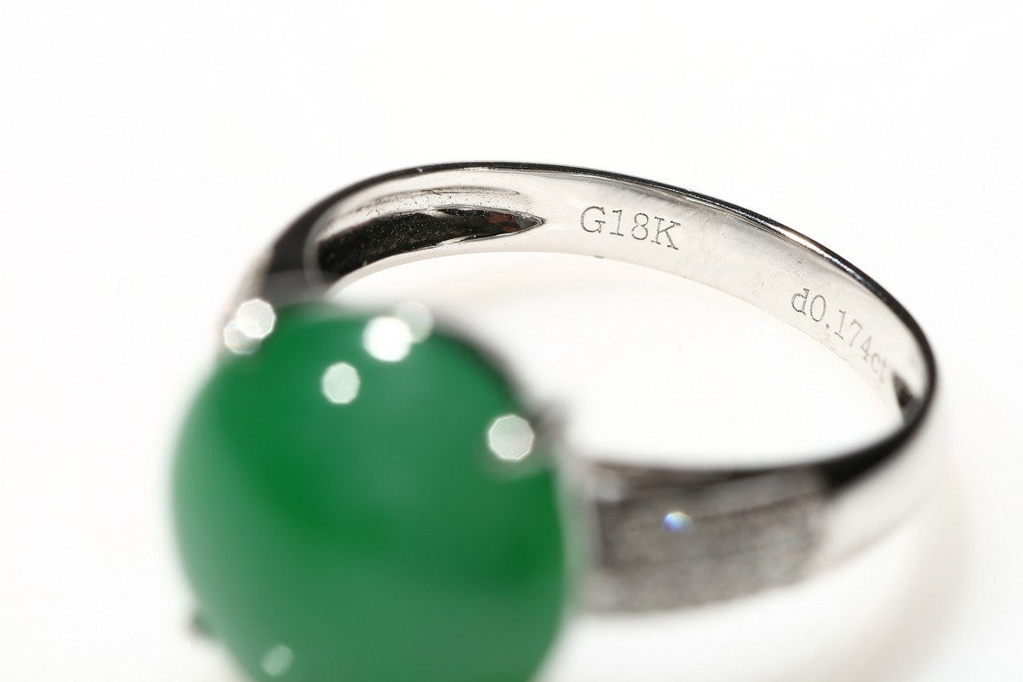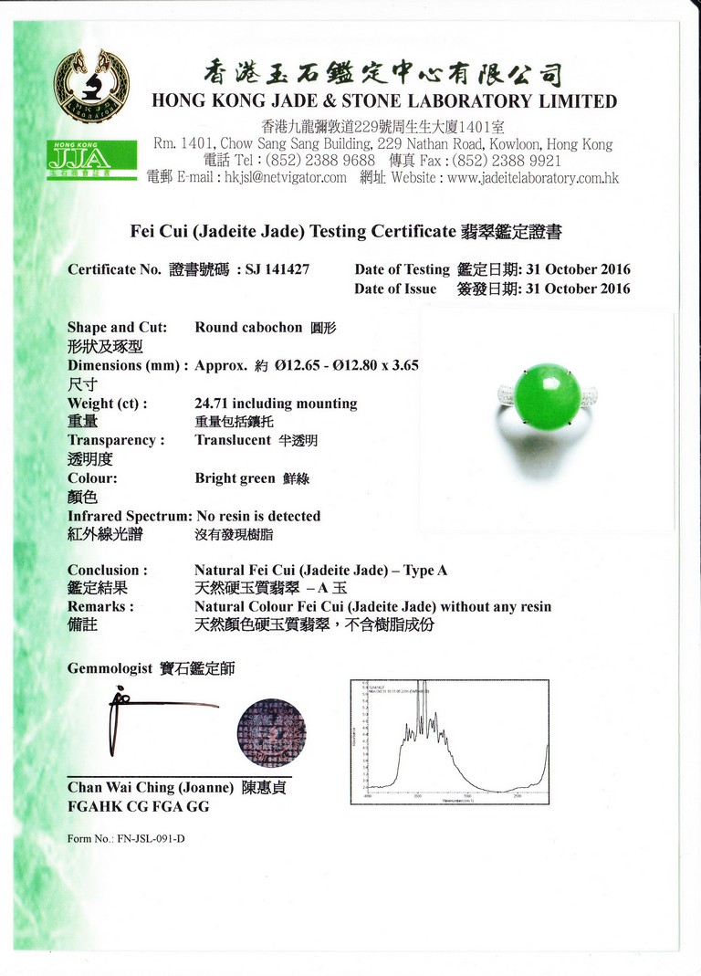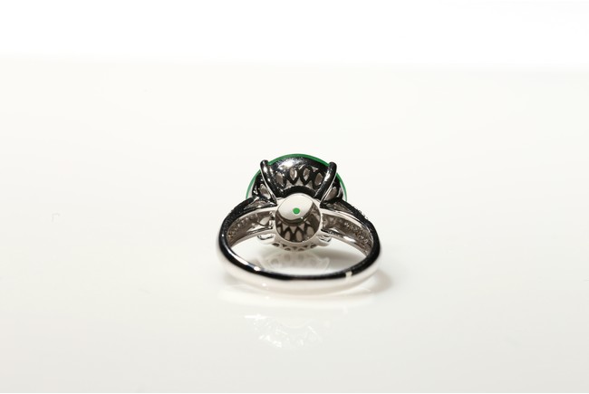 The jadeite cabochon in bright green coloration, set in 18 K white diamond. This jadeite jewelry is a perfect for all occasions. Accompanied by a Hong Kong Jade & Stone Lab certificate no resin detected.