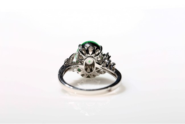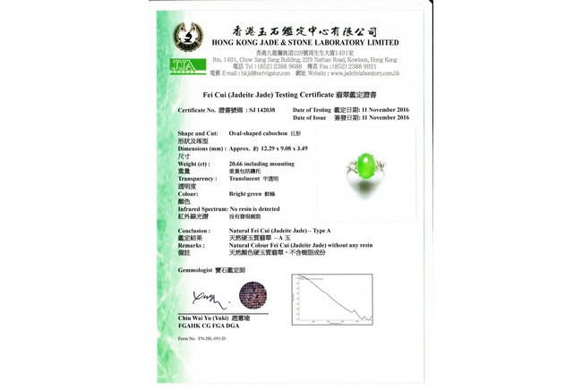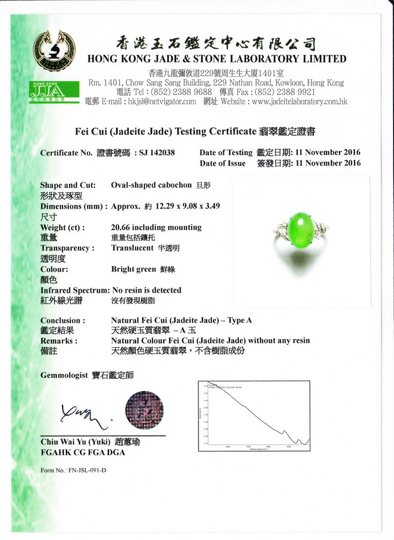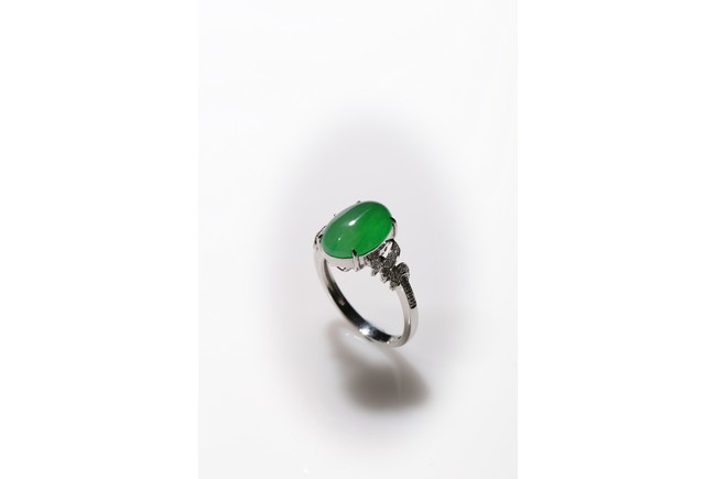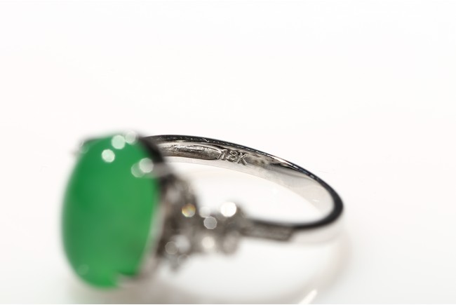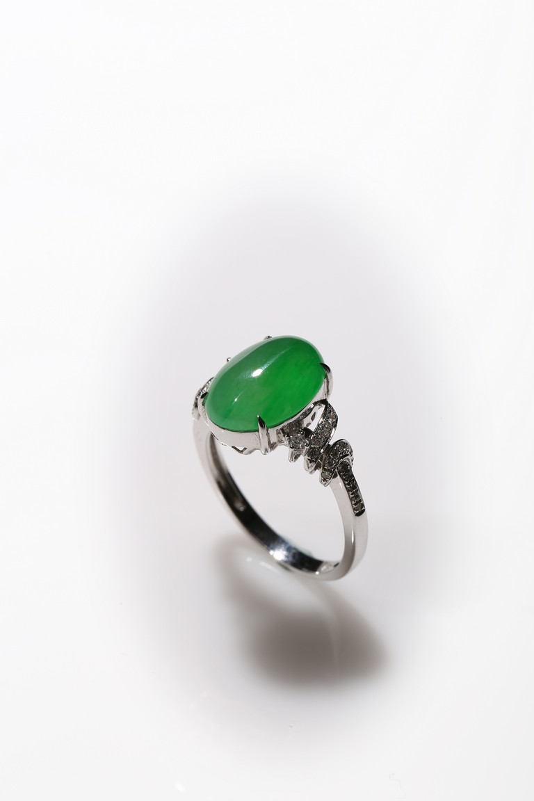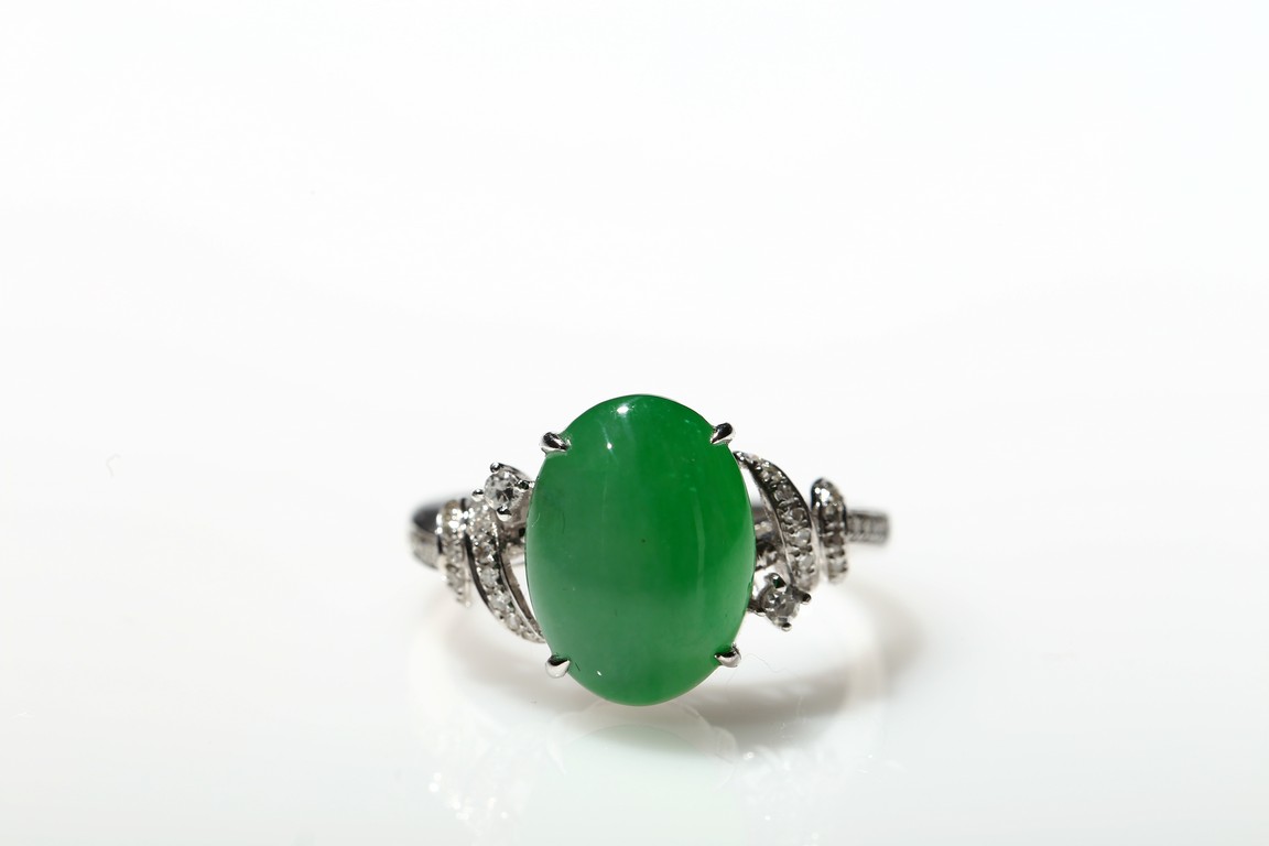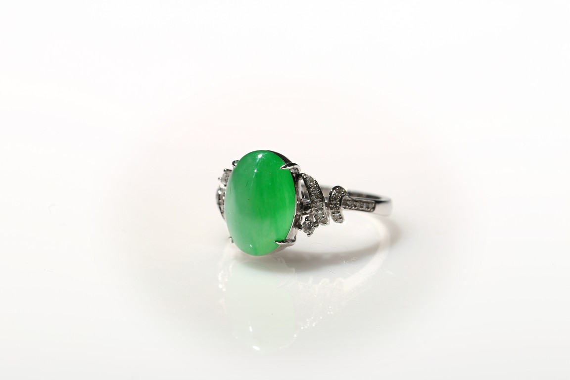 The main stone jadeite jade cabochon is a translucent apple green coloration, and the ring is artistically designed with diamond and 18K white gold. Accompanied by a Hong Kong Jade & Stone Lab Type A with no resin detected. Certificate indicating natural Jadeite Jade