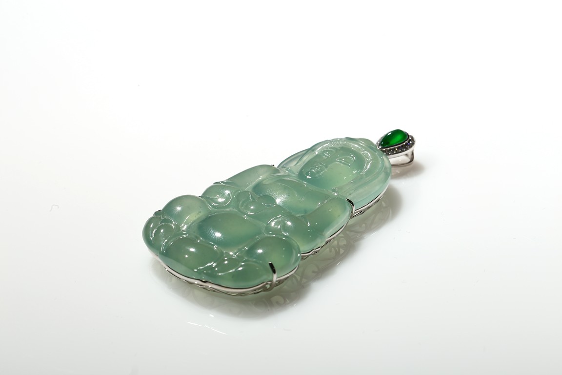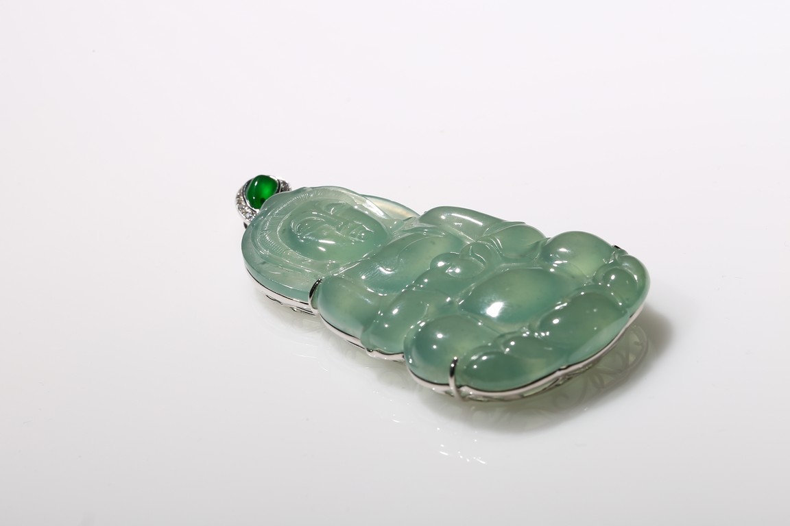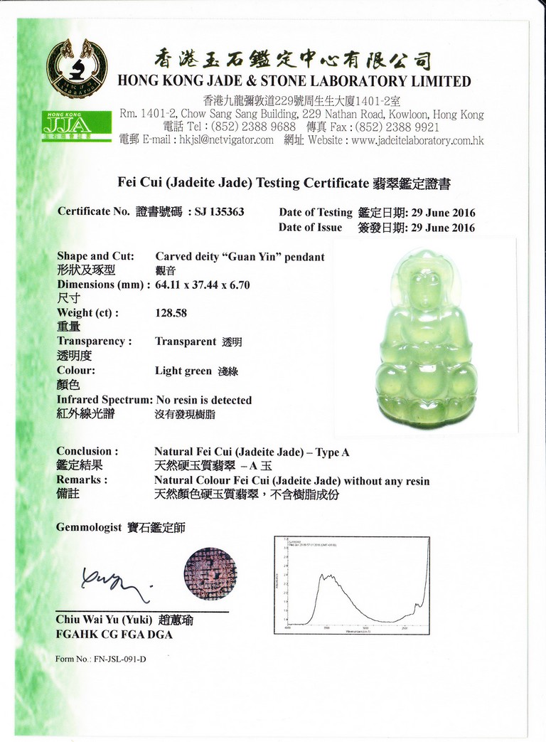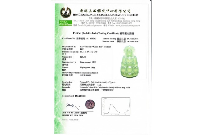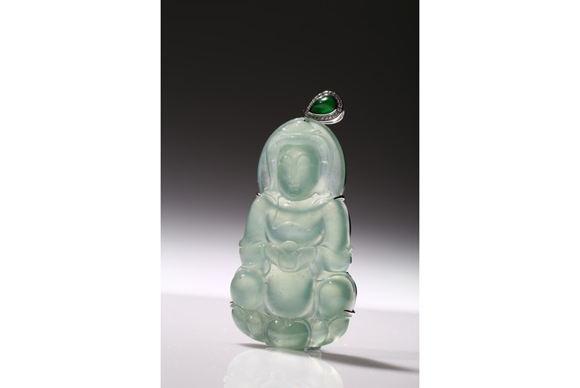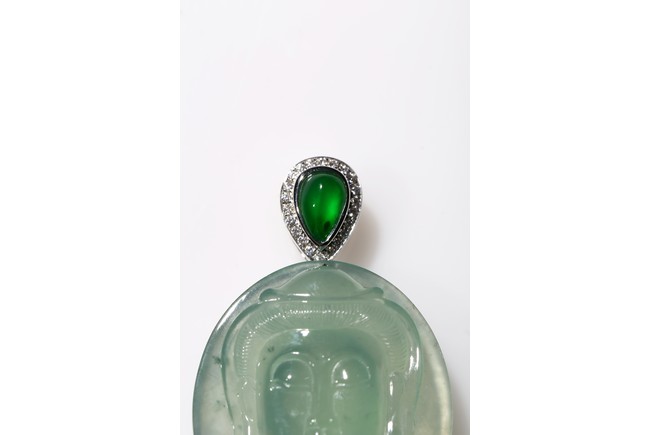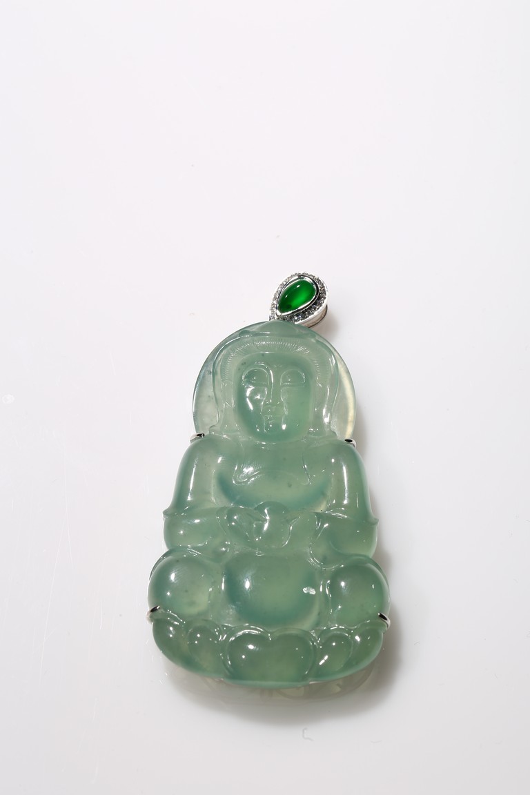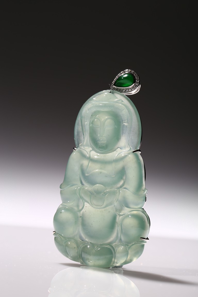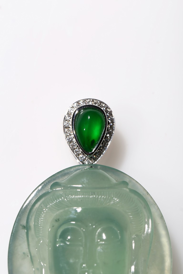 A large and fine beautiful full green jadeite jade Guanyin at unbelievable low price, with even coloration and glassy texture. Accented with diamond and a natural emerald green jadeite cabochon. Accompanied by a certificate from Hong Kong Jade & Stone Lab indicating natural type A jadeite jade with no resin detected.