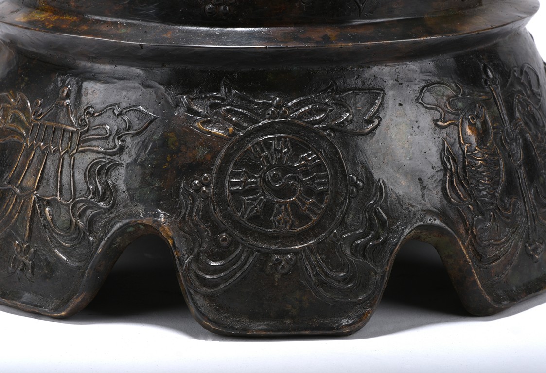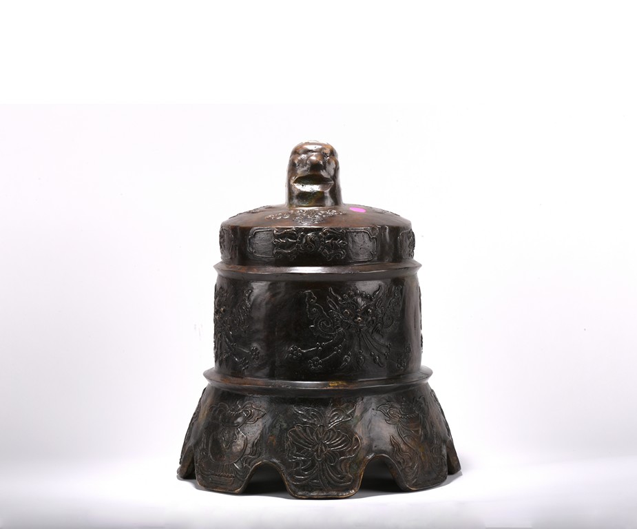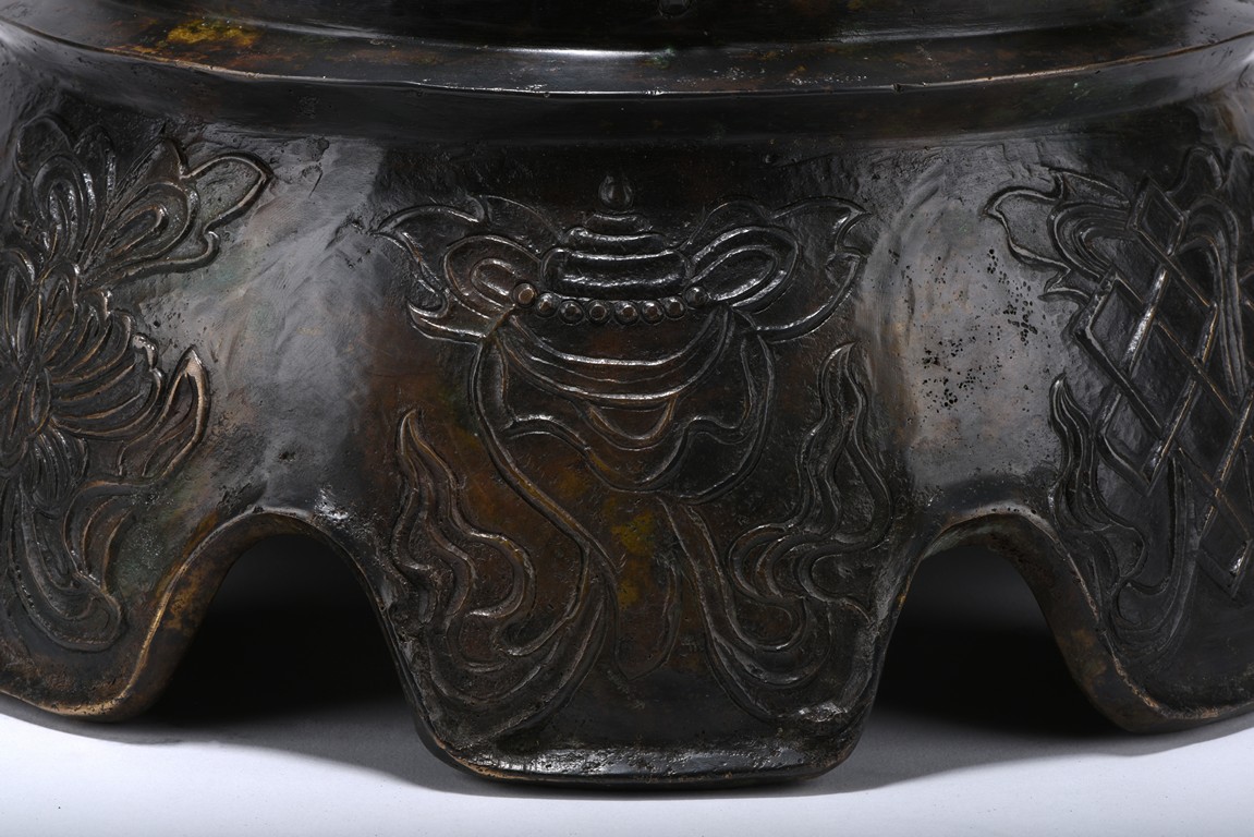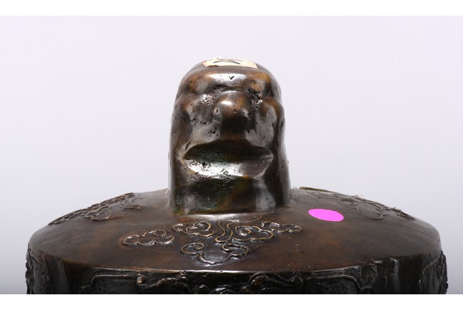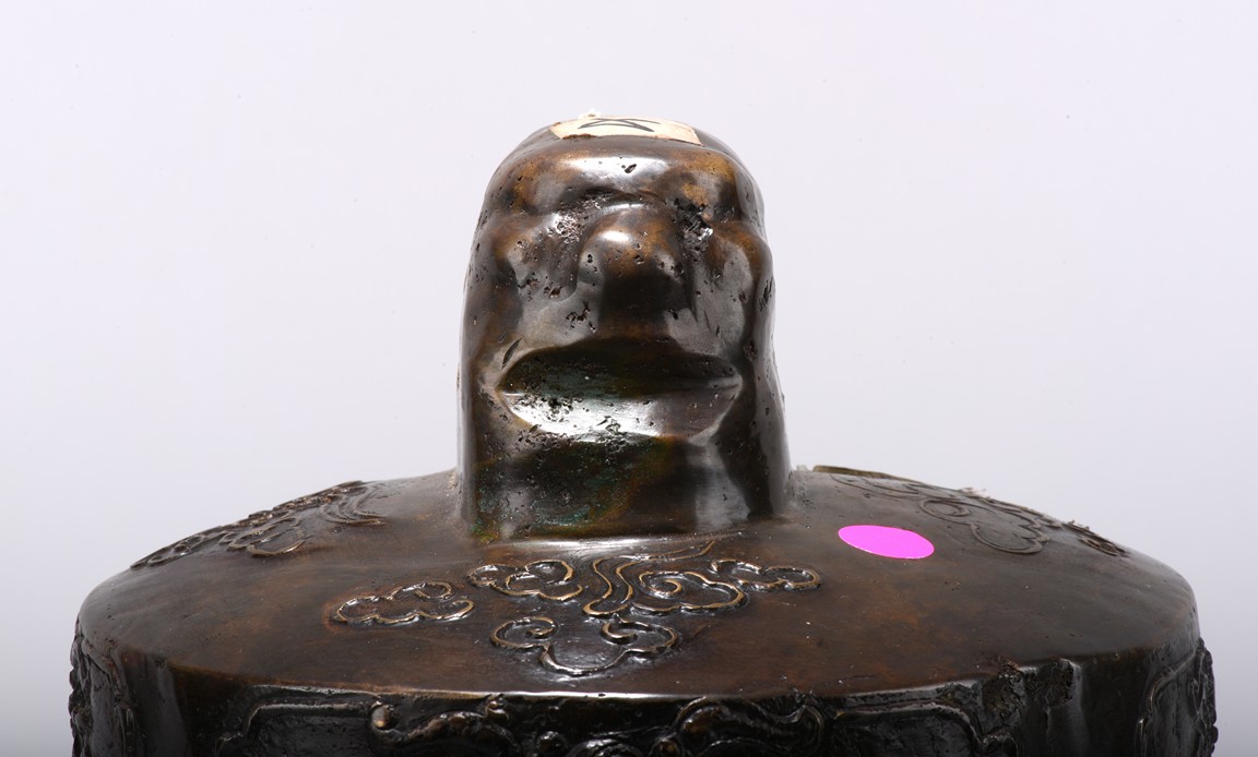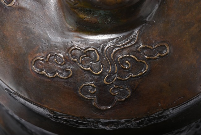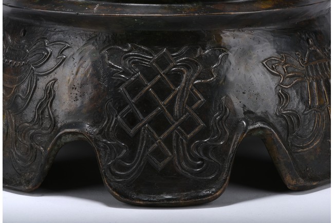 The domed form having an arched loop at the top and an undulating bottom rim, with the main body with an mythical beast band, the lower bottom with alternating bajixiang motif. Qing Dynasty period.