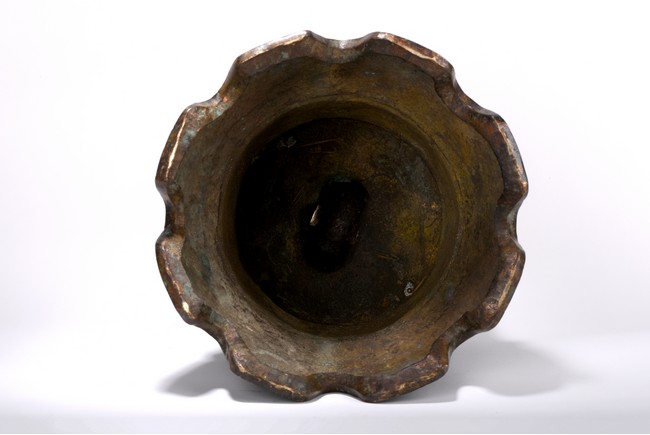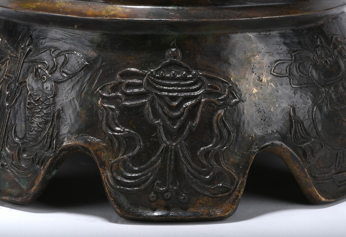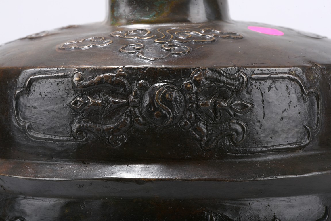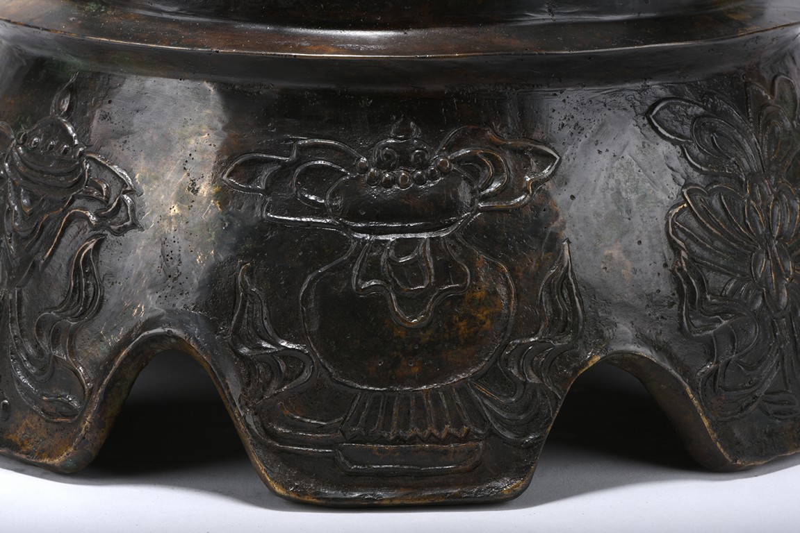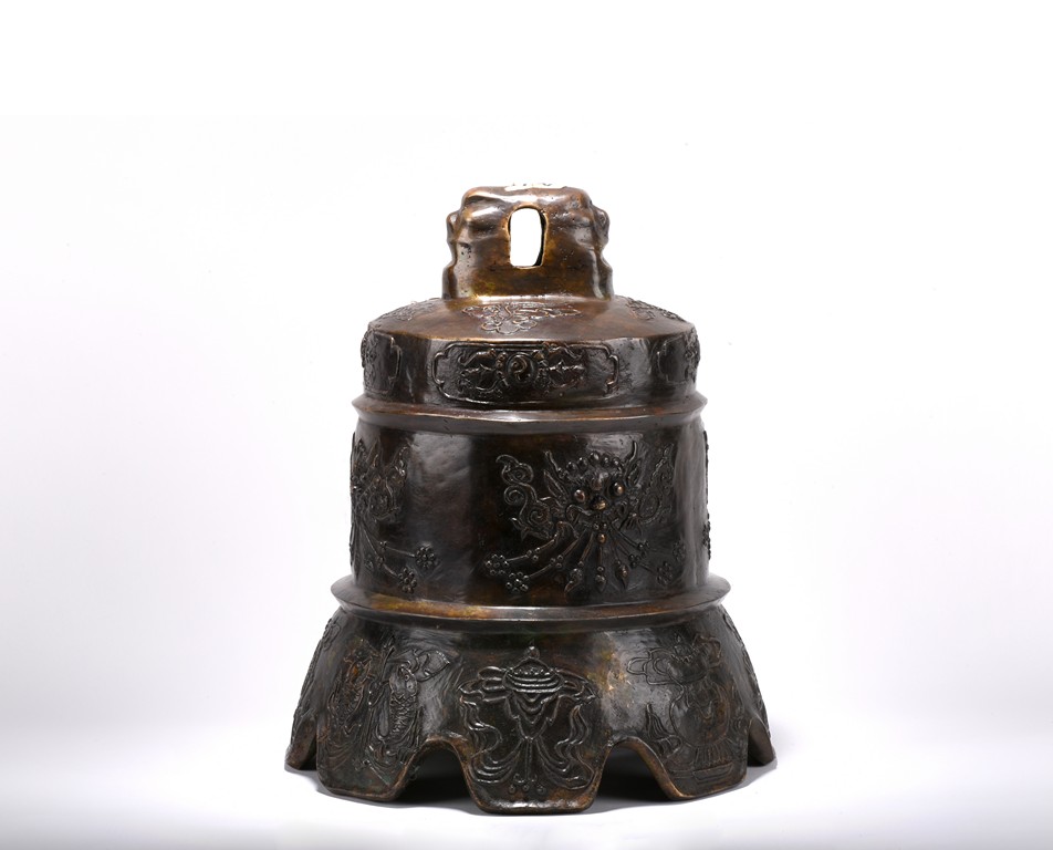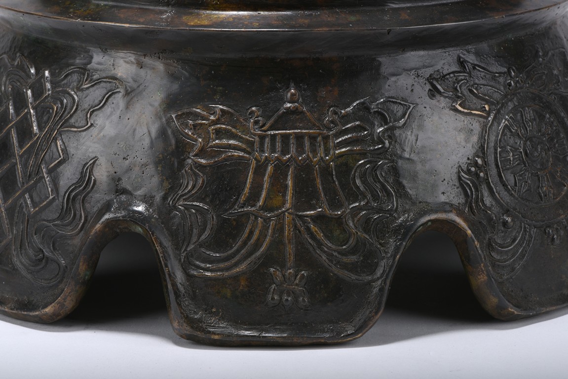 The domed form having an arched loop at the top and an undulating bottom rim, with the main body with an mythical beast band, the lower bottom with alternating bajixiang motif. Qing Dynasty period.