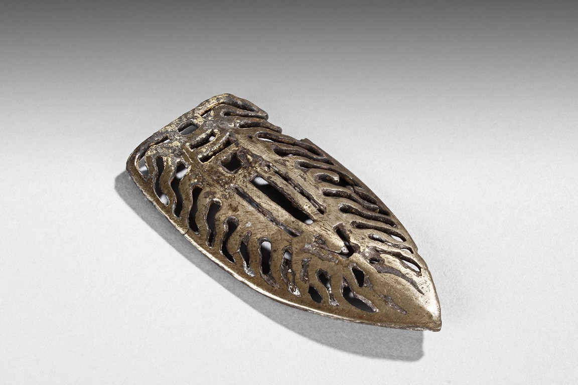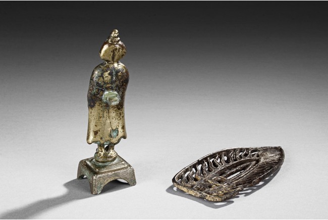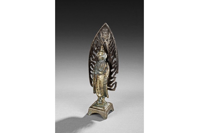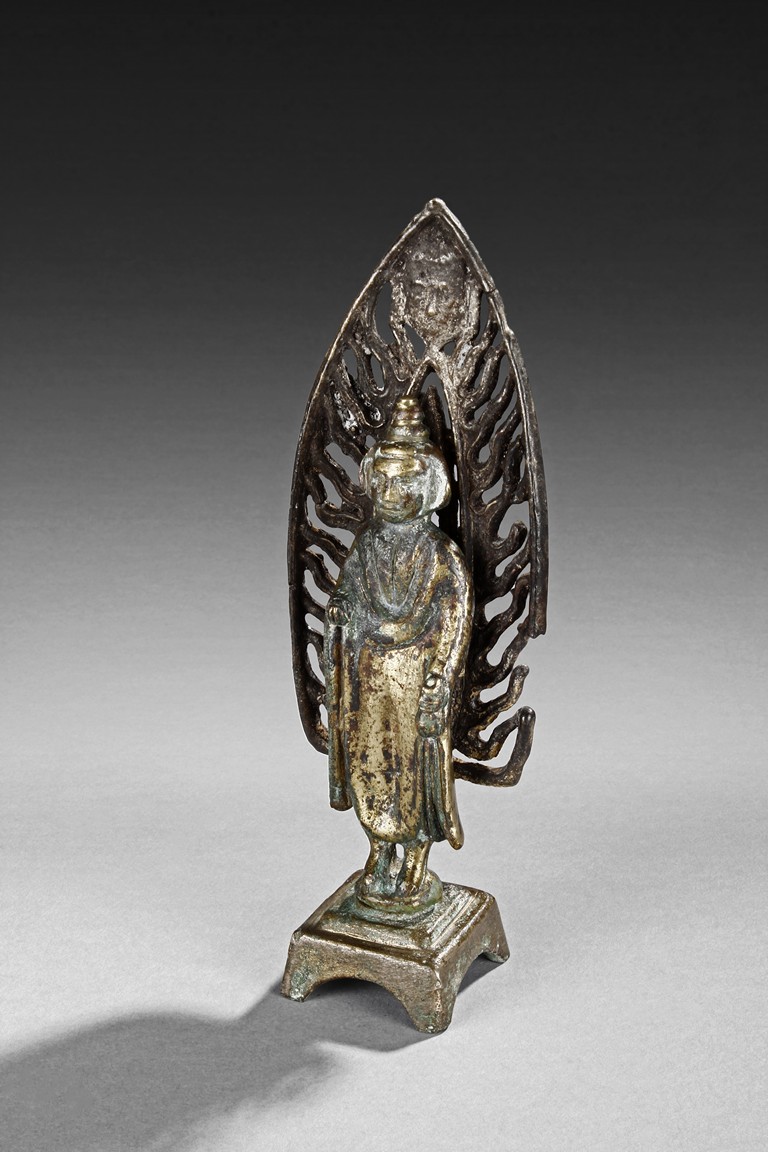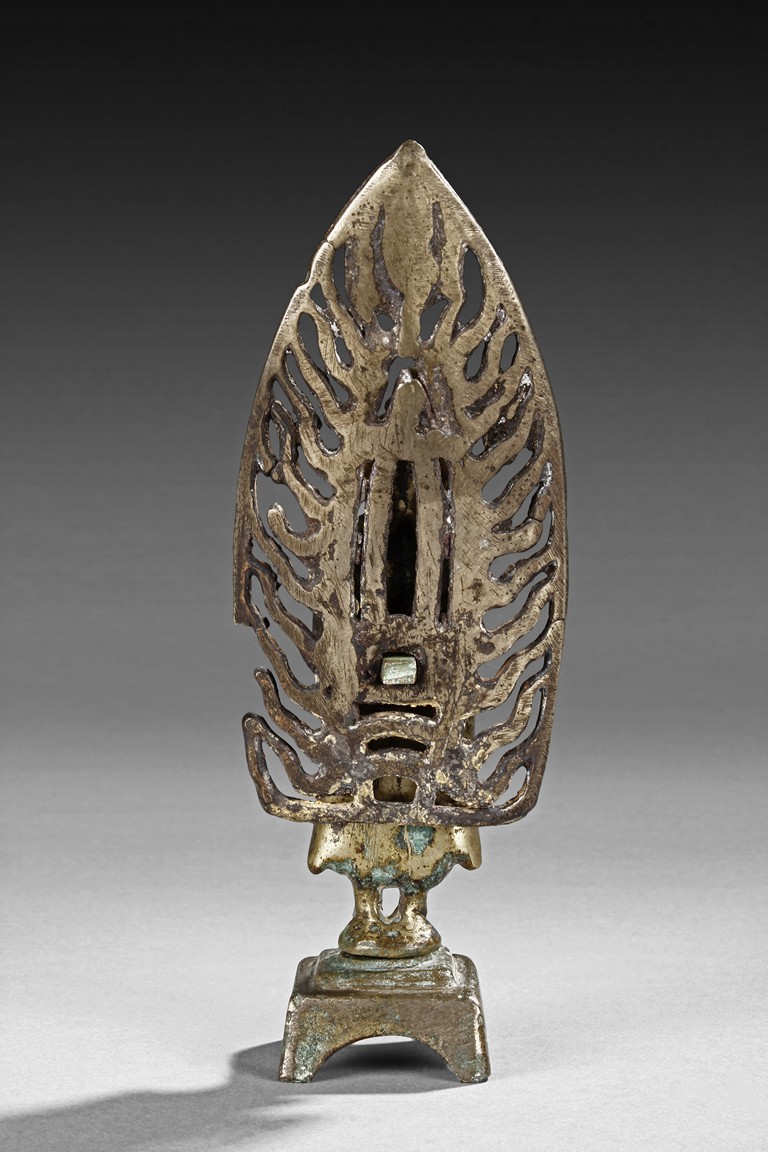 The slender figure is shown standing with right hand raised and left hand pendant while standing in front of a flame-shaped mandorla on top of the openwork base with four legs. 16th century, Kingdom of Dali.