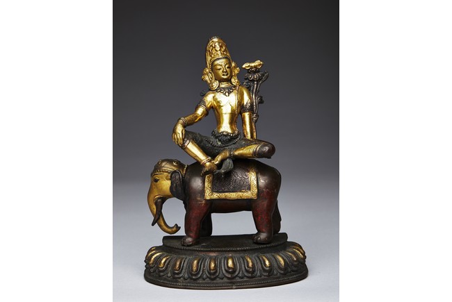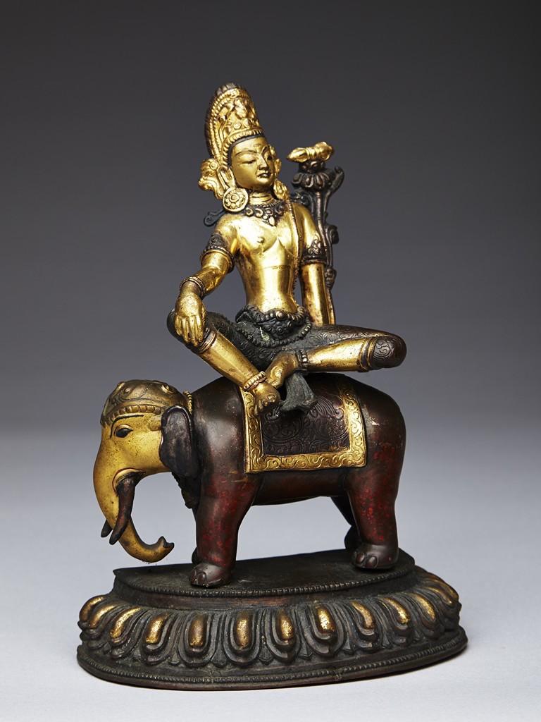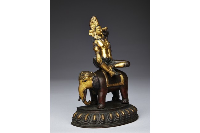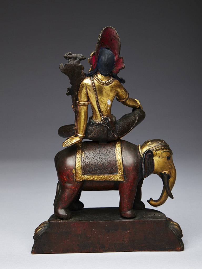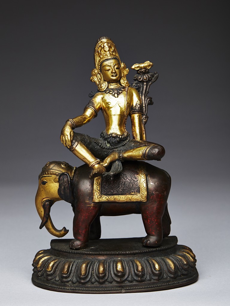 The deity is shown seated in royal ease upon elephant, his right hand rested on right knee, wearing short dhoti and adorned with necklace, his face with serene expression; the elephant standing foursquare on lotus throne. Qing Dynasty period.