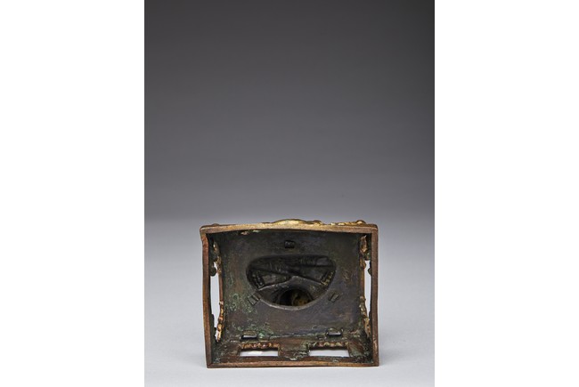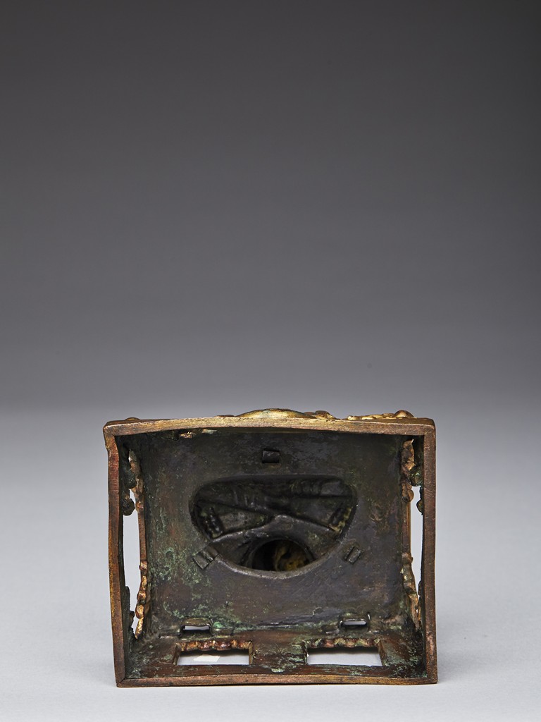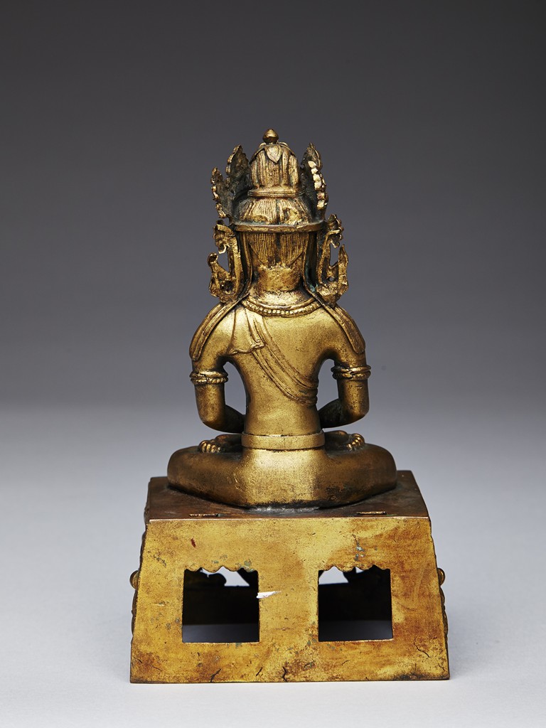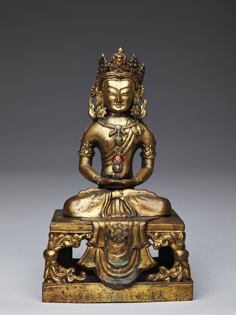 Shown seated in dhyanasana with the hands in dhyanamudra, wearing a dhoti tied over the left shoulder and adorned with beaded jewellery, the head crowned by pointed tiara, all supported on a tapering rectangular throne above the Qianlong reign mark. Qing Dynasty period.