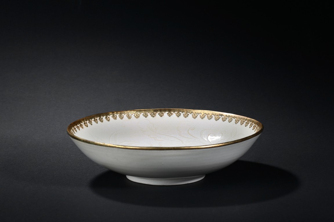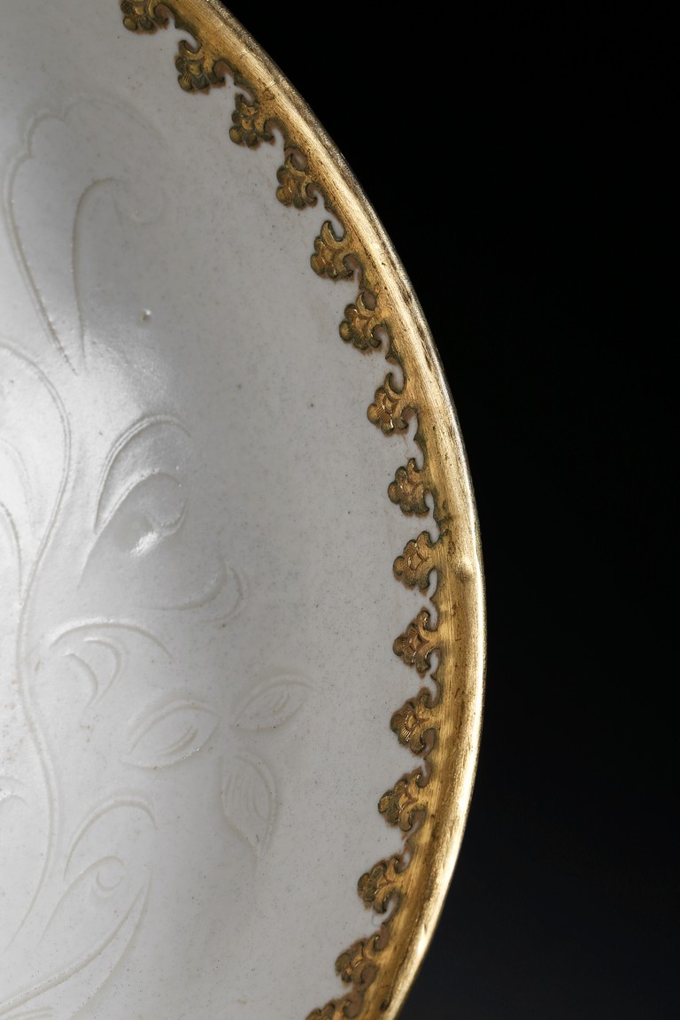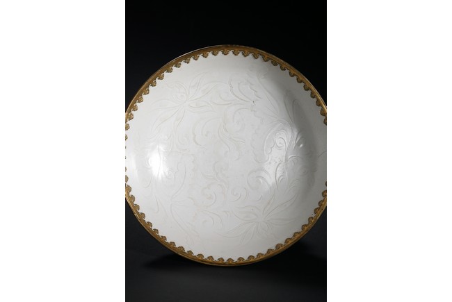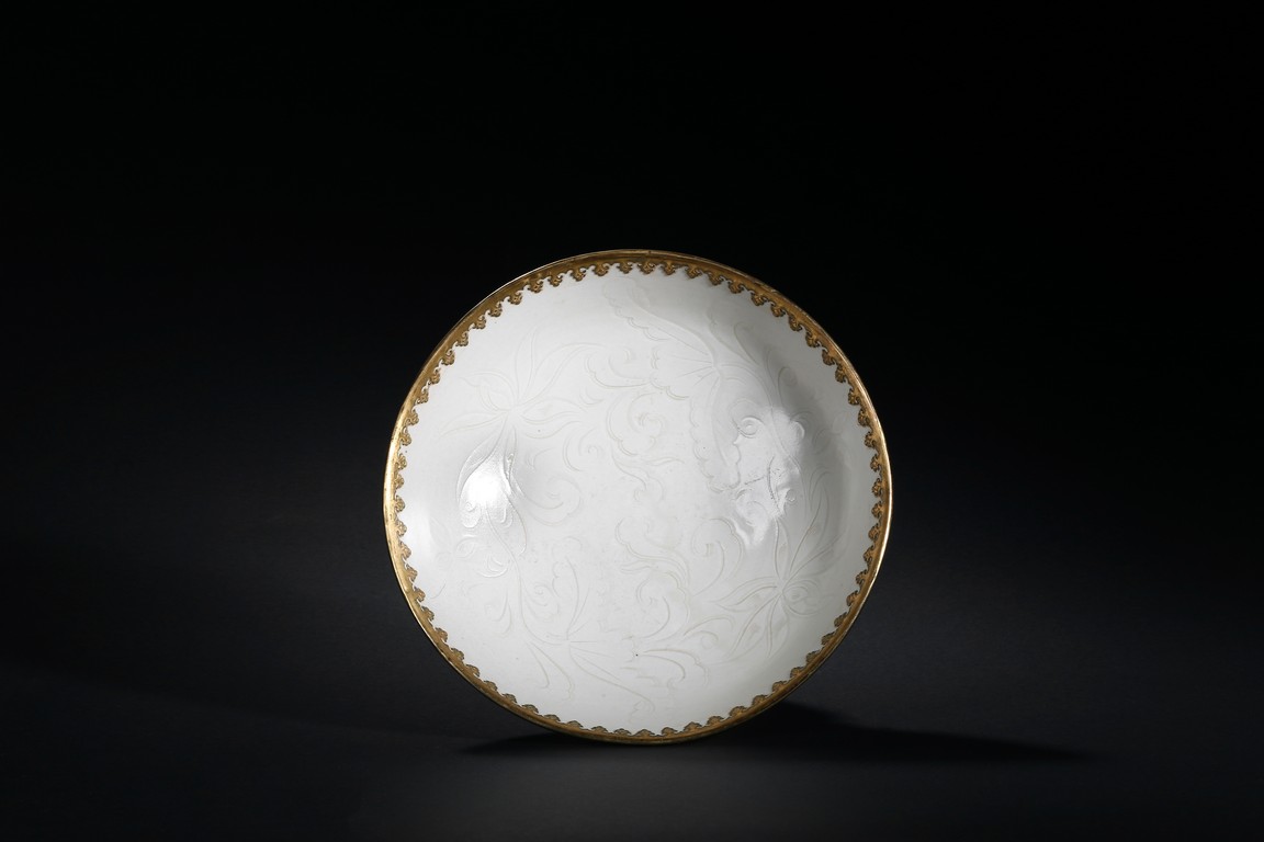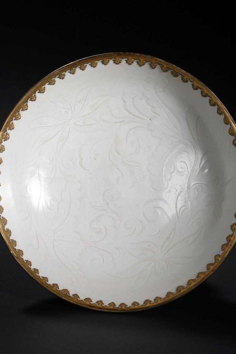 The finely potted body rising from a short foot, deftly carved to the interior with scrolling leafy lotus sprays, the rim bound in gilt ruyi-lappet metal,, applied overall with an even ivory-colored glaze. Song Dynasty period.