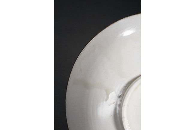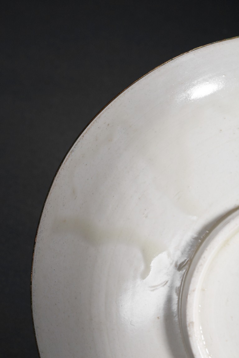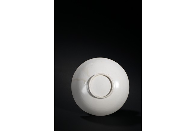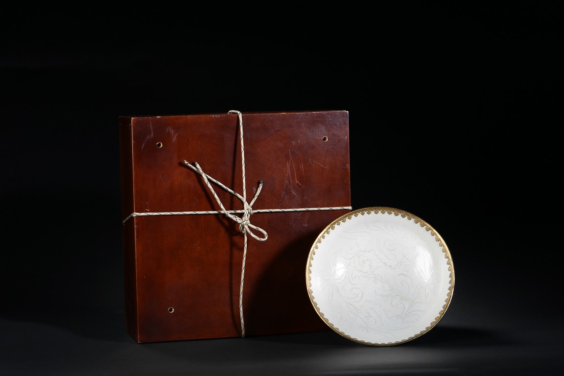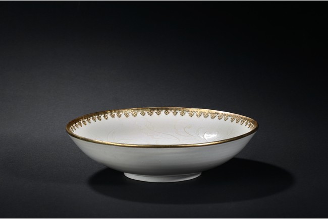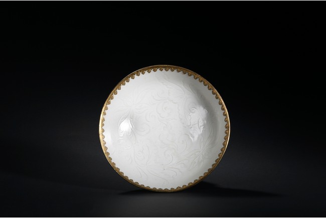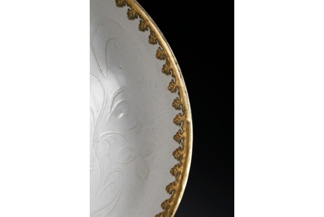 The finely potted body rising from a short foot, deftly carved to the interior with scrolling leafy lotus sprays, the rim bound in gilt ruyi-lappet metal,, applied overall with an even ivory-colored glaze. Song Dynasty period.