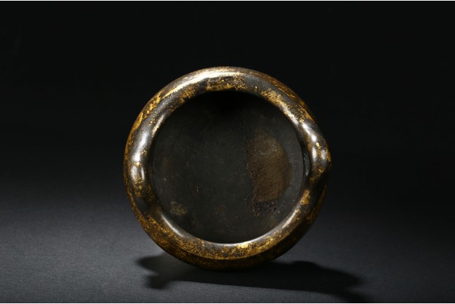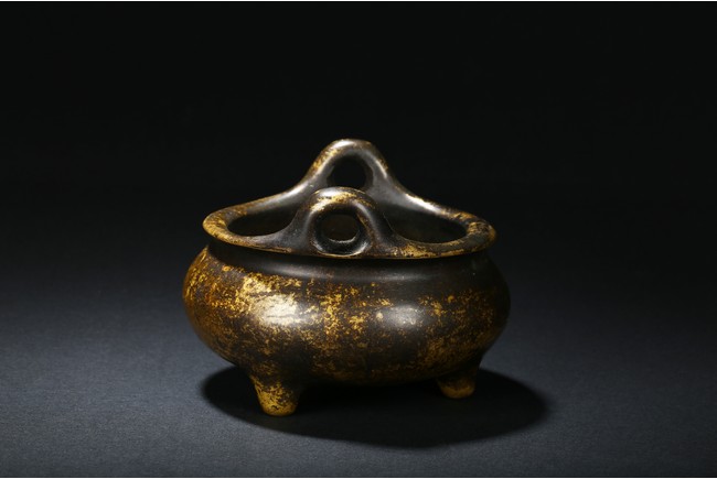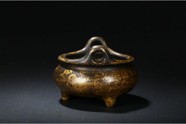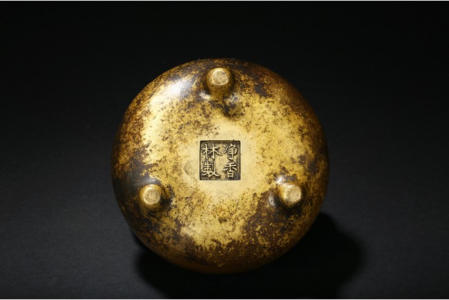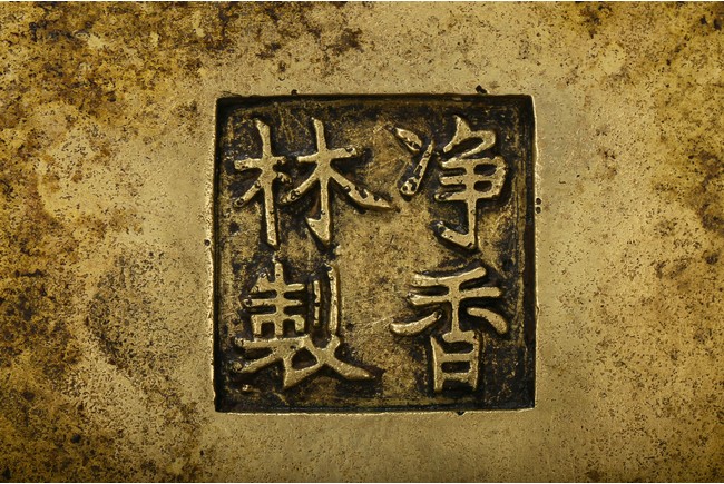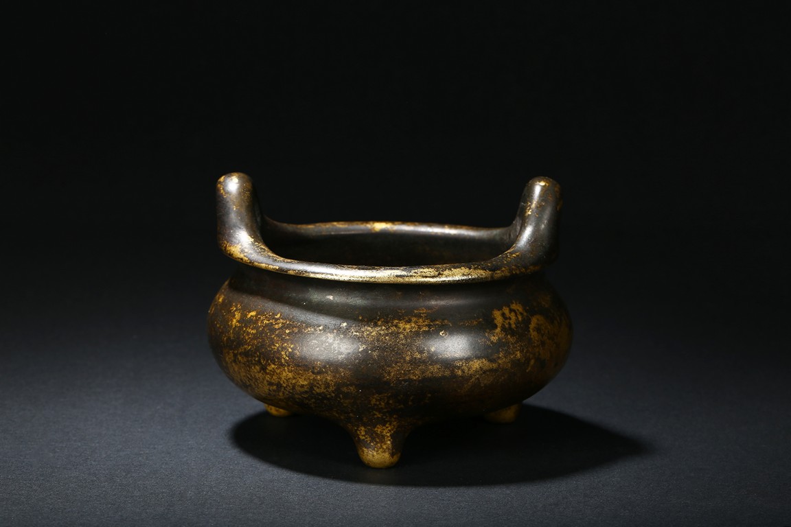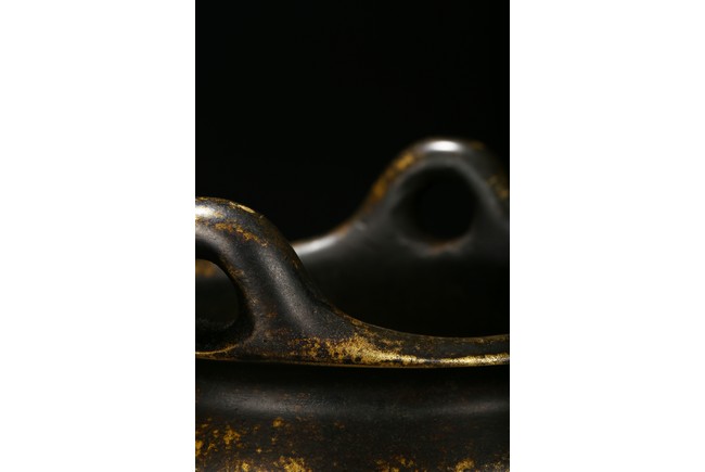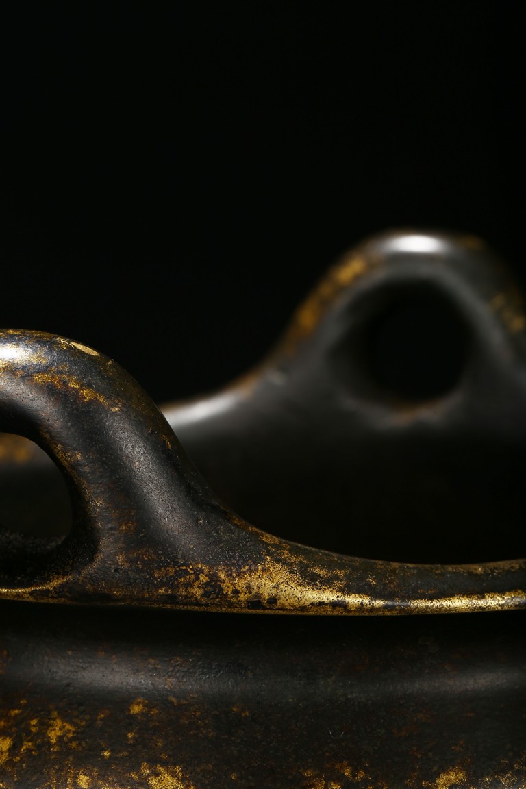 Of compressed globular form, with two raised handles to the mouth rin, overall in russet and yellow patina, base with four character Jing Xiang Lin Zhi. Qing Dynasty period.
