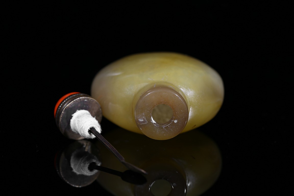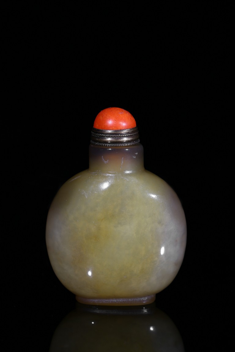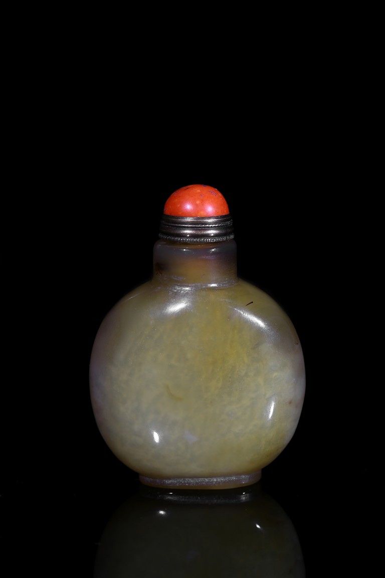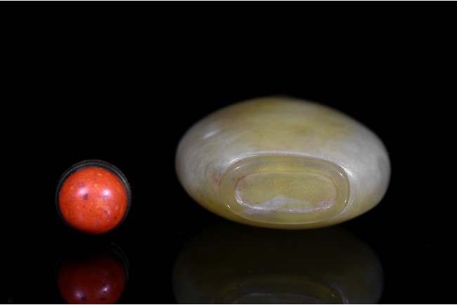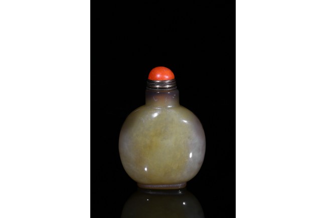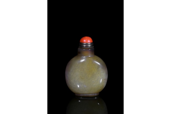 Of compressed circular form, with a straight cylindrical neck, flat lip, and an oval foot ring.