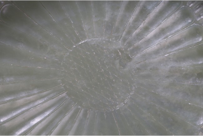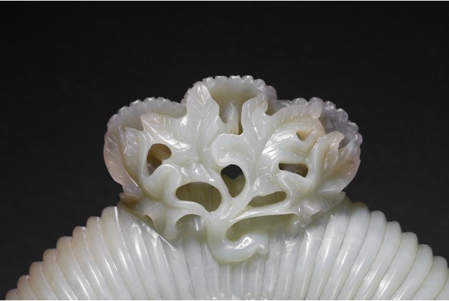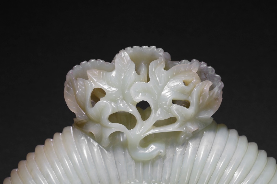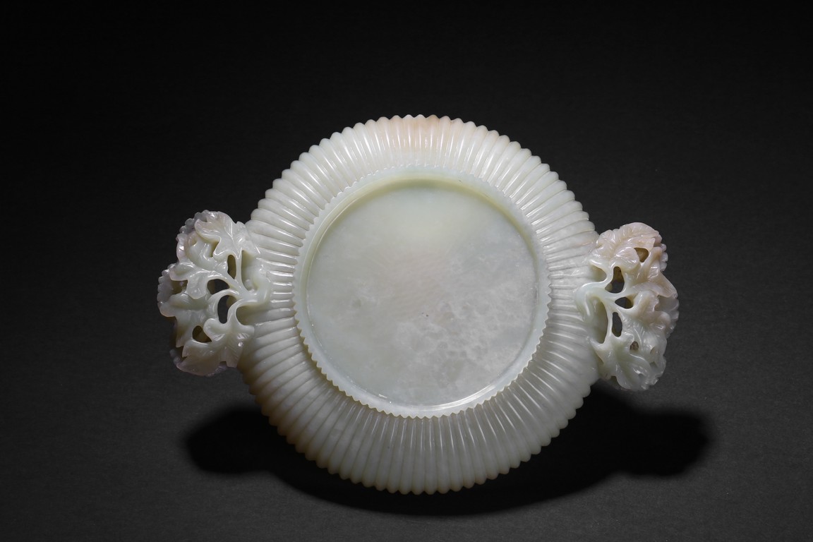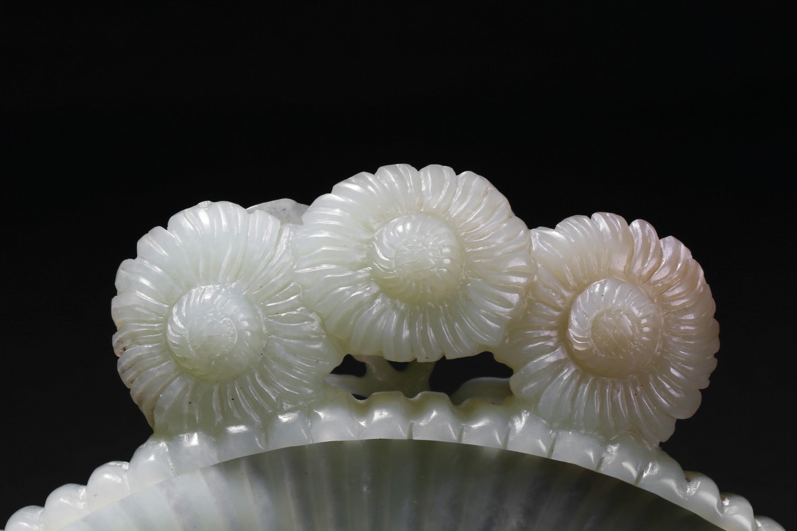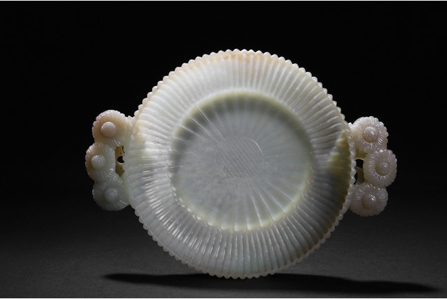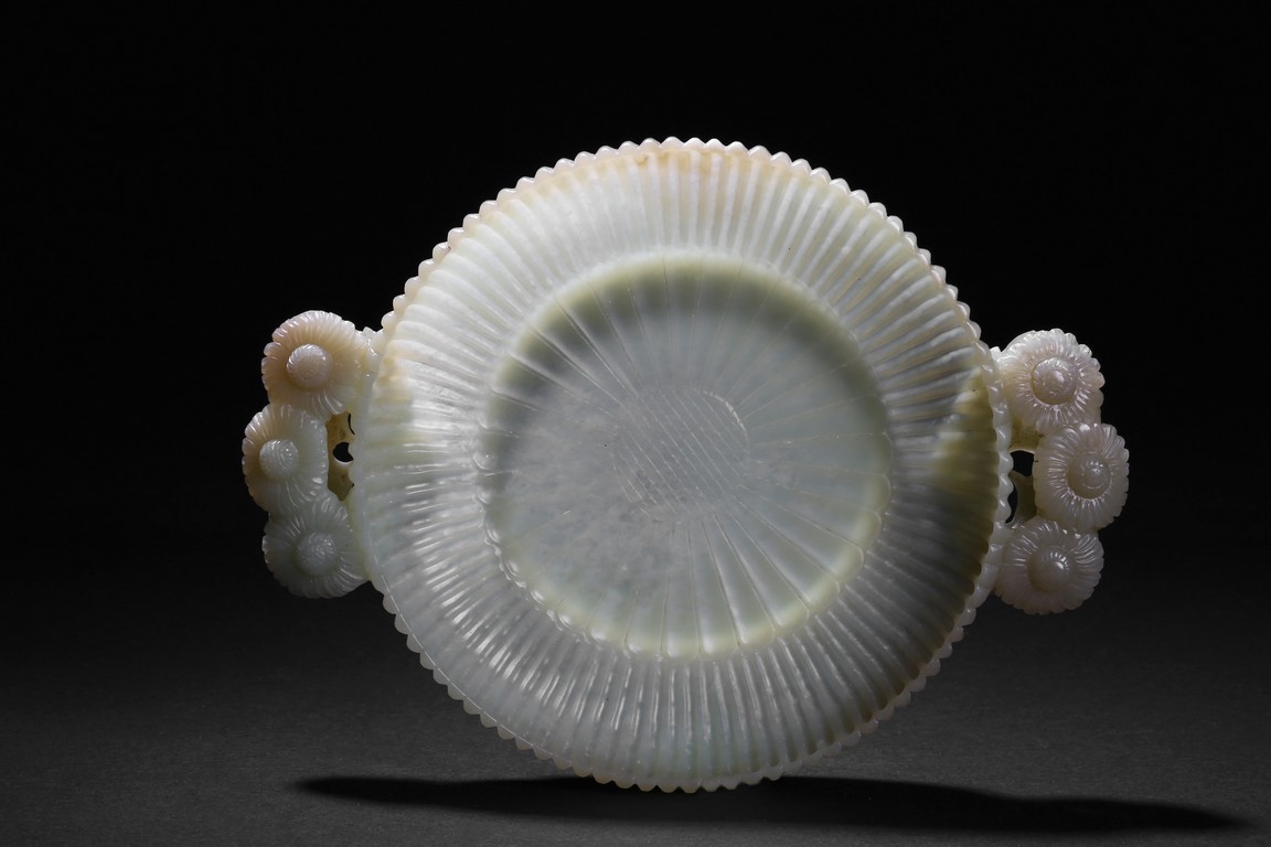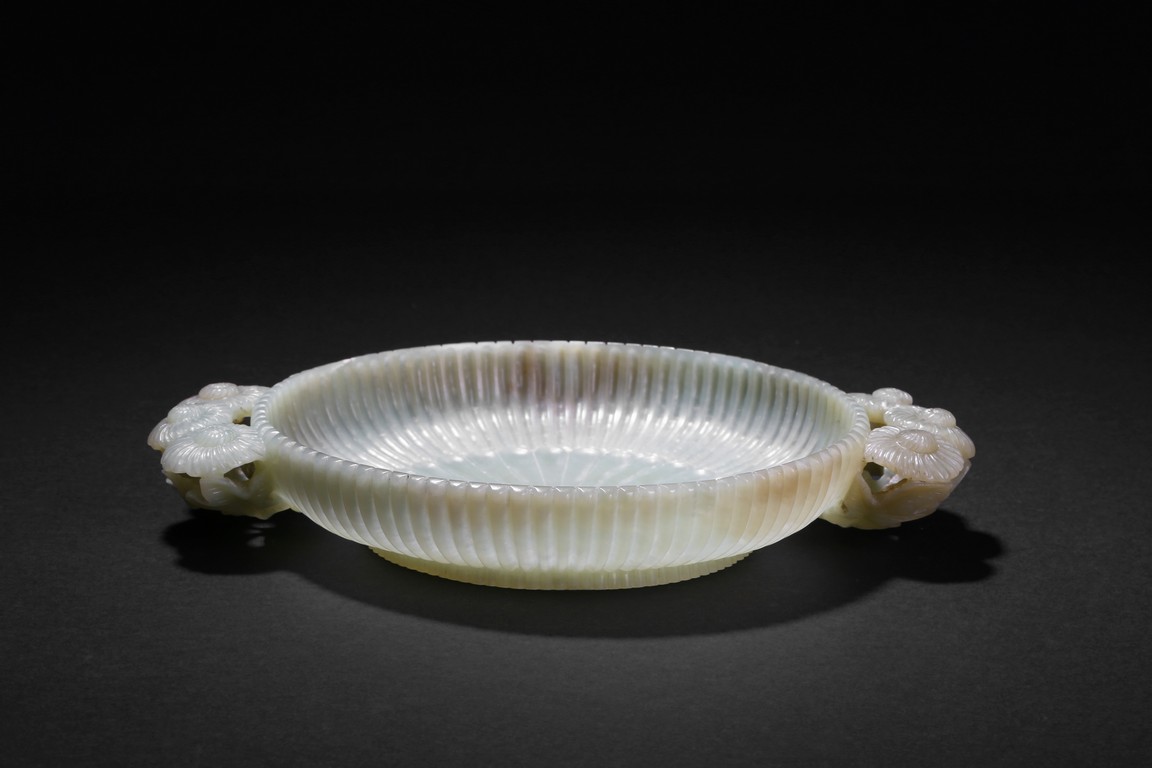 Crisply and thinly carved from translucent light yellow stone with two rows of slender petals radiating from the central roundel with cross- hatched pattern. The underside also worked with petals with one row forming a thin foot. On the opposite sides of the dish rim, a pair of three-head chrysanthemum handles was carved, each completed with stylistic leaves. Late Qing Dynasty period.