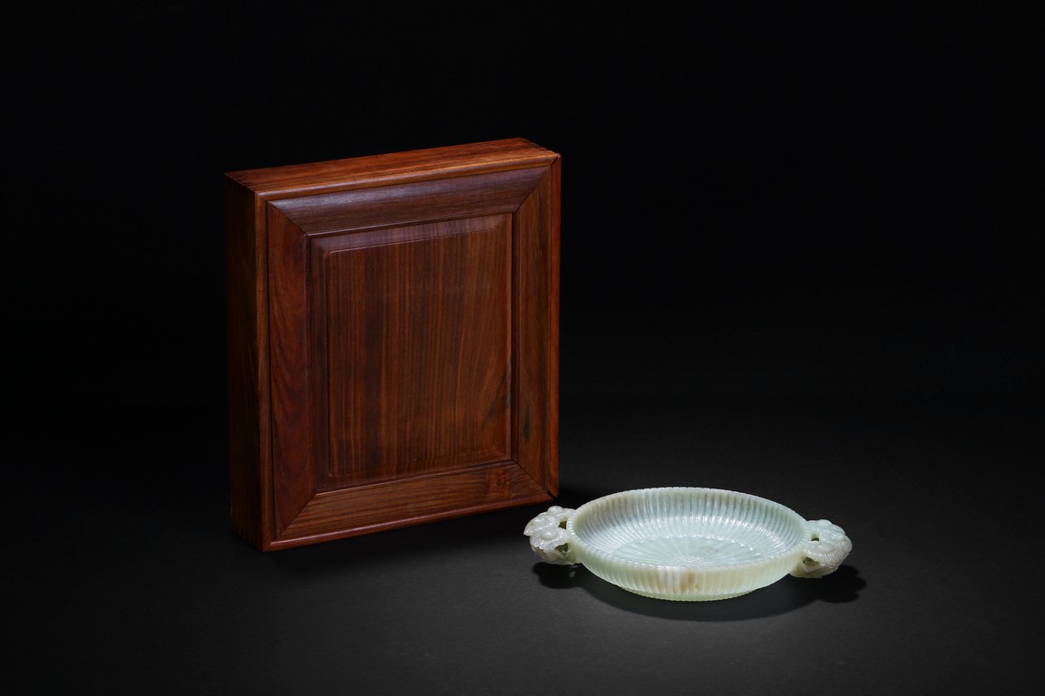 來源:香港洛杉磯沈氏家族珍藏 Provenance: The Shum Family collection, Hong Kong/Los Angeles 此和阗黃玉菊瓣花耳盤為圓形直口, 盤壁由凸雕邊陵的葡瓣紋組成,盤中為凸雕菊瓣紋, 而盤心部位雕刻成細密網絡紋. 雙耳為透雕寫實的菊花式. 此盤採用優質的新疆和阗玉料, 雕功精良, 為難得的一件玉器。