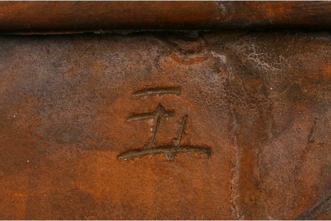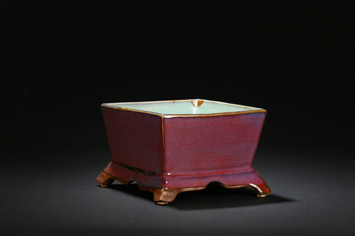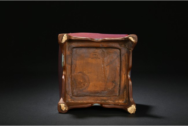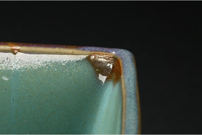 The deep-sided square censor resting on an unglazed foot rim. The four exterior walls covered overall in a lavender glaze, while the interior walls under a creamy-blue glaze, with worm marks in some areas. The numerical “five” was carved under the base. The unglazed foot rim and the base burned to a brownish-buff color.