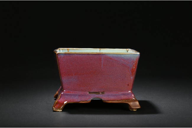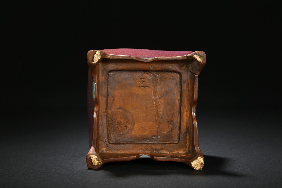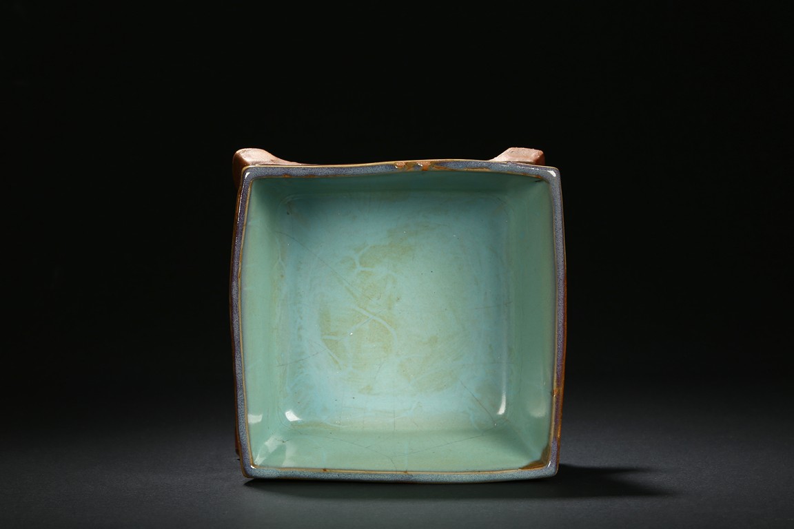 來源:香港洛杉磯沈氏家族珍藏 Provenance: The Shum Family collection, Hong Kong/Los Angeles 香爐作正四方型. 方口, 深直斜壁, 平底, 下承四足托泥. 胎骨厚重, 造型規矩. 通體罩施濃釉, 釉質乳濁具光澤, 釉表氣泡稯眼明顯. 器内釉色天青泛白, 釉面有蚯蚓走泥紋, 器外則是葡萄紫釉. 施釉至底足, 足邊積垂厚釉, 稜邊縮釉處與底足露胎處皆成褐黃色. 底刻有數目字 “五”。