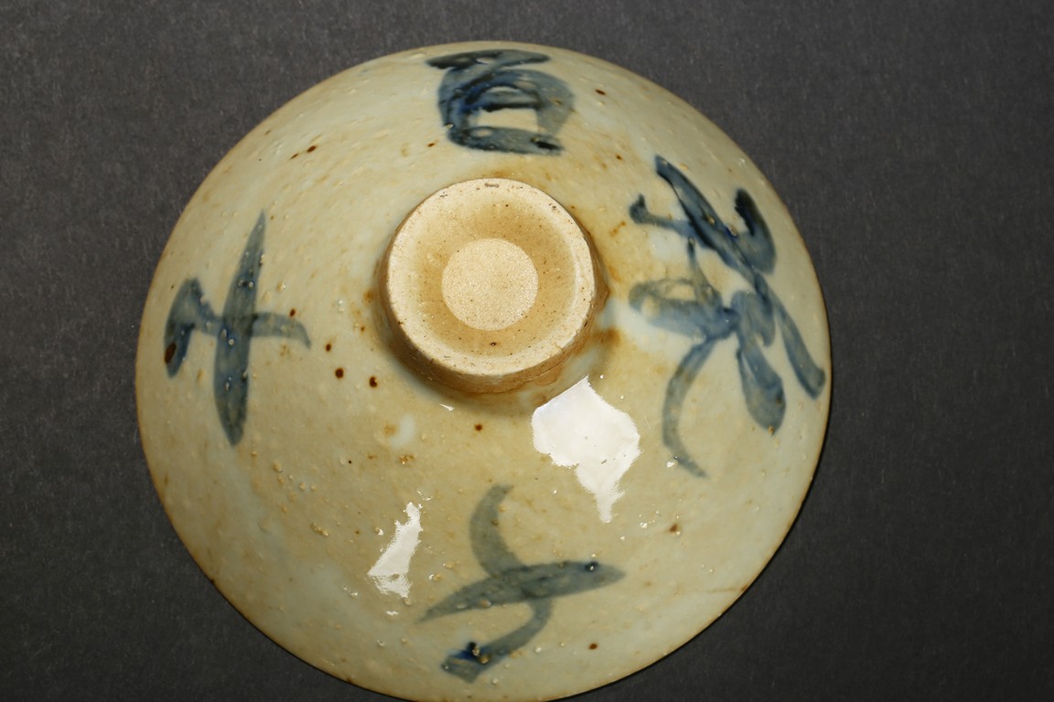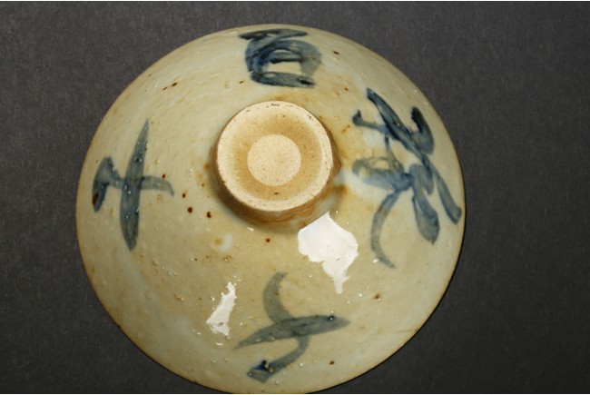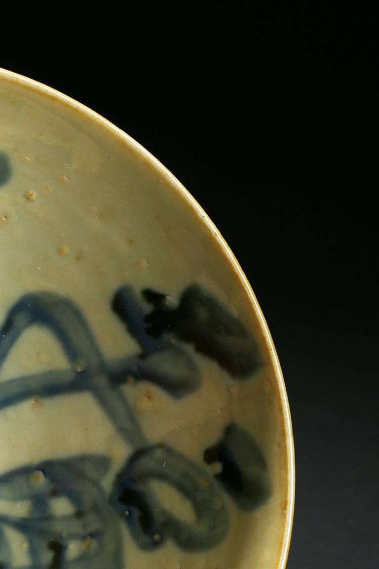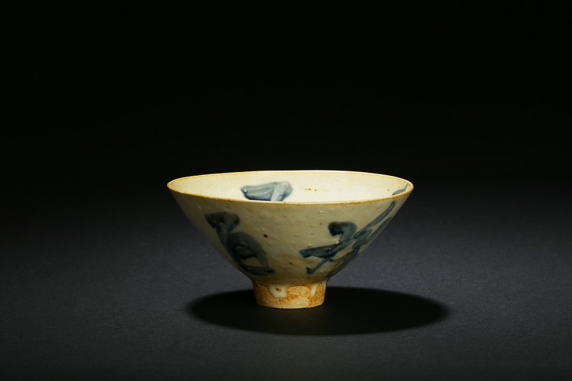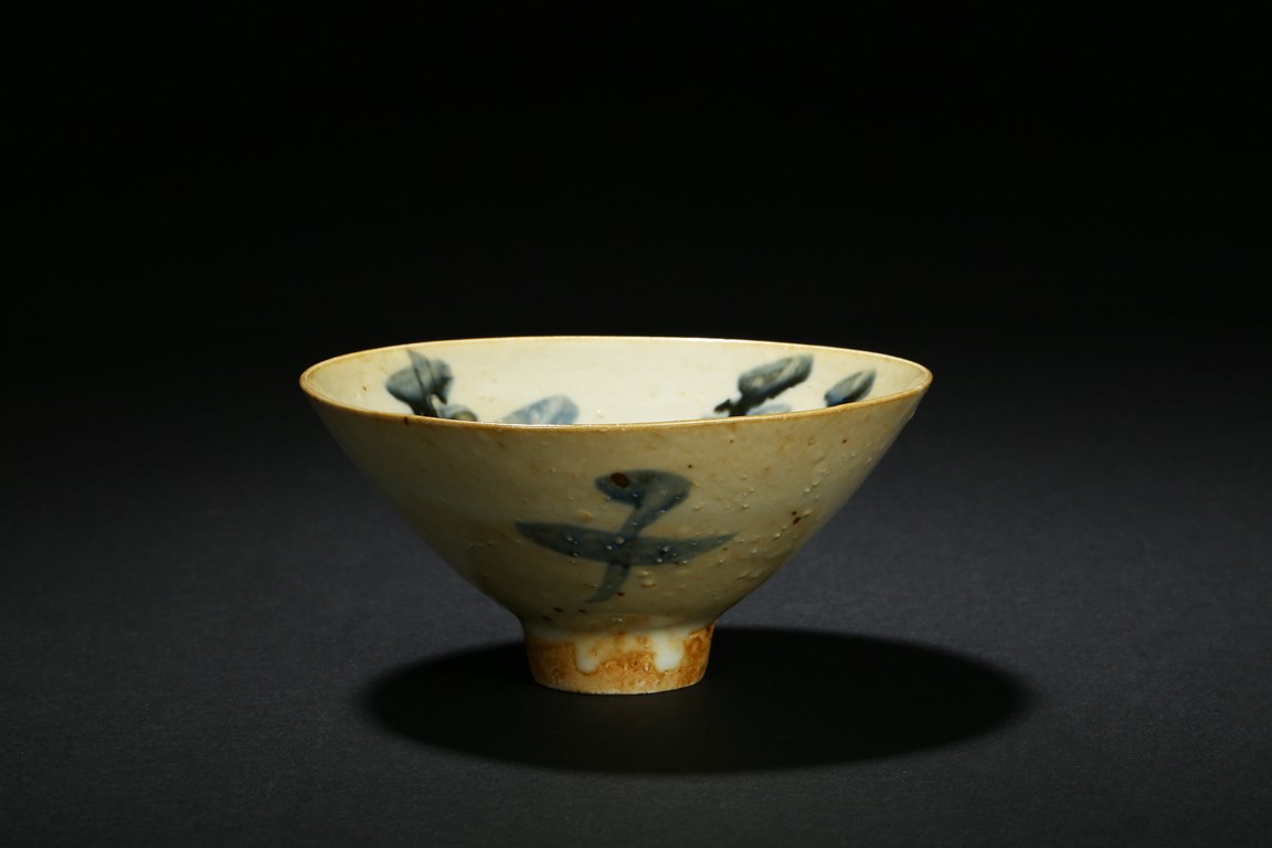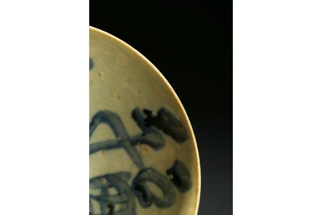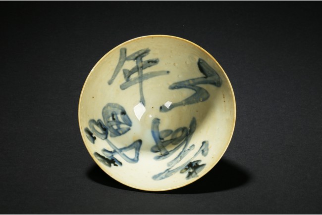A conical shape bowl with high foot ring of fired body. The interior and exterior covered with high-fired glaze. The four-character calligraphy on the outer wall, in semi-cursive style, loosely translated as “hundred sons and thousand grandchildren”, and the calligraphy on the interior wall loosely translated as “prosperity and longevity for a thousand years”. Yuan Dynasty period.