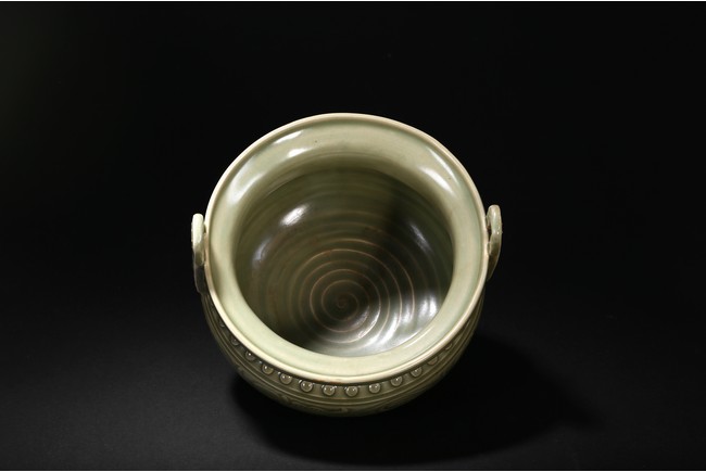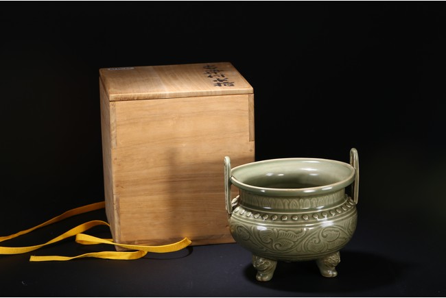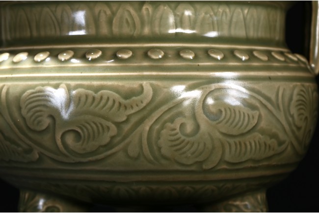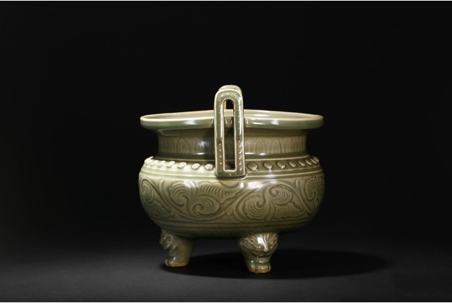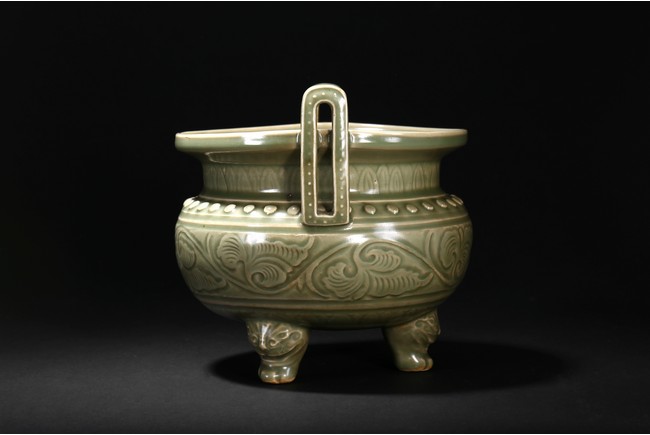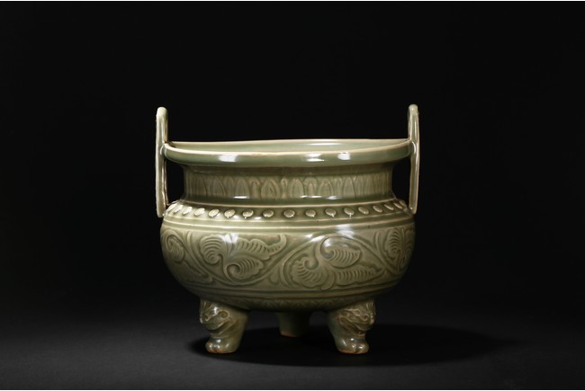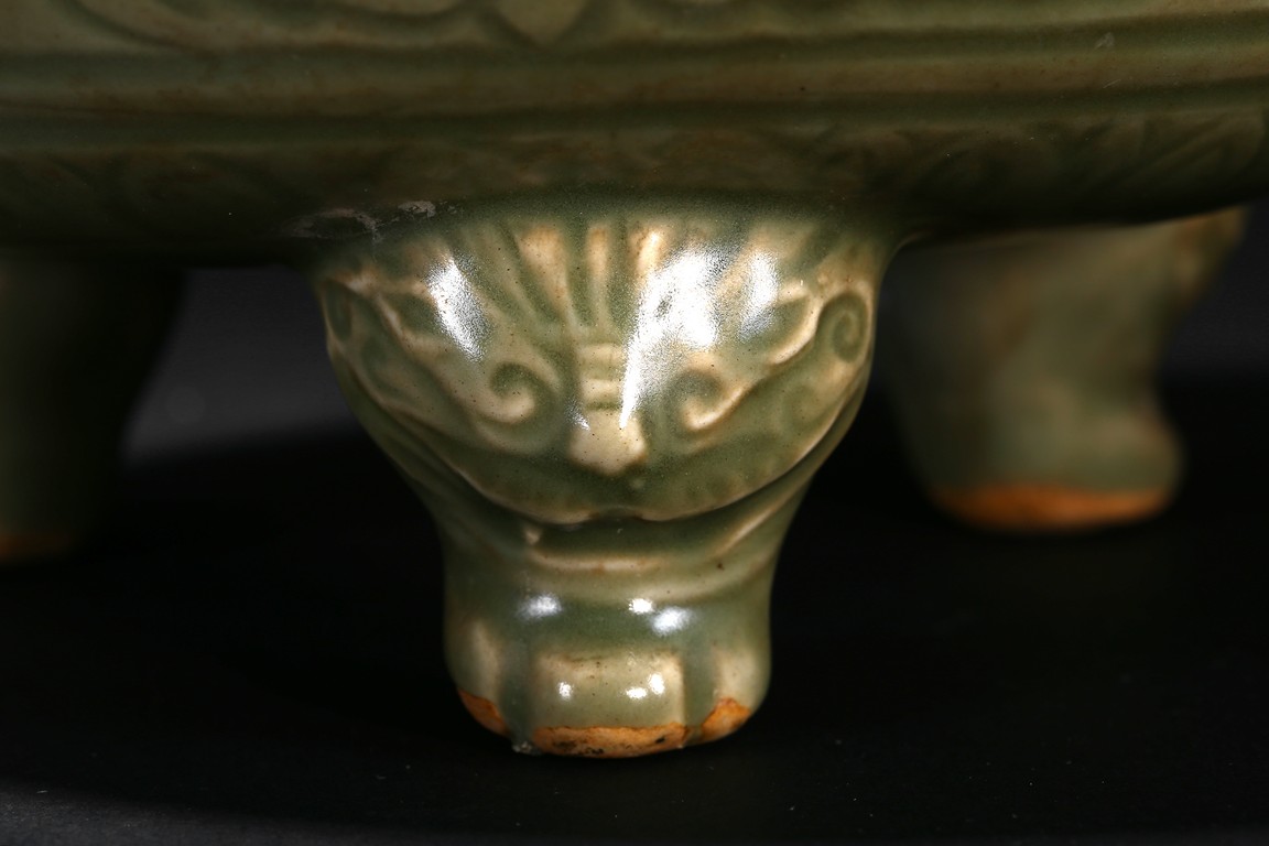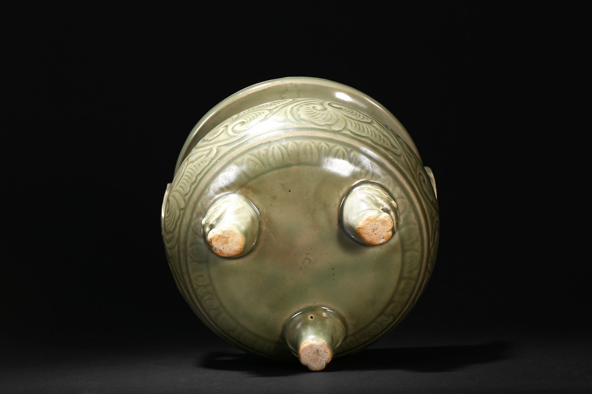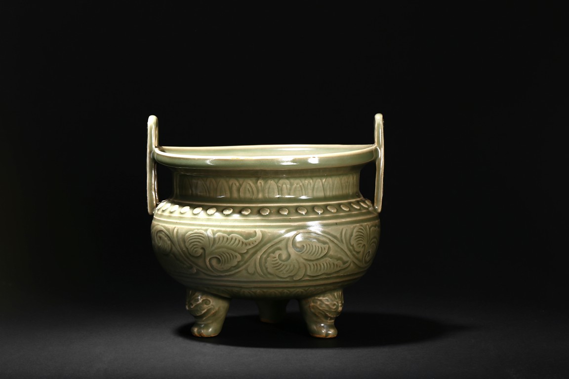 來源:香港洛杉磯沈氏家族珍藏 Provenance: The Shum Family collection, Hong Kong/Los Angeles 香爐圓口, 平沿, 高頸, 口沿與肩部貼雙附耳, 扁圓腹, 肩部有一圈凸稜. 深壁, 平底, 下承三獸足, 底足露胎, 呈火石紅色. 胎厚釉濃, 造型端正, 通體罩施粉青釉, 釉色厚润青翠, 質洁細膩, 頸下流汁積垂. 頸部飾蓮瓣紋, 肩部飾一圏鼓釘, 腹部飾纏枝牡丹花紋, 與環底飾蓮瓣紋, 中間以雙弦線紋相隔. 該器胎釉結合緊密, 刻绘紋飾嫻熟流暢, 采用了斜刀手法以增強紋飾的立體感。整體造型豐滿渾厚, 穩重大方, 是不可多得的龍泉窯珍品。