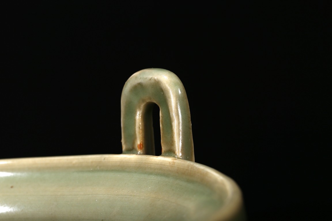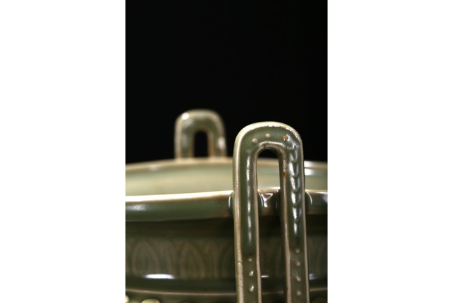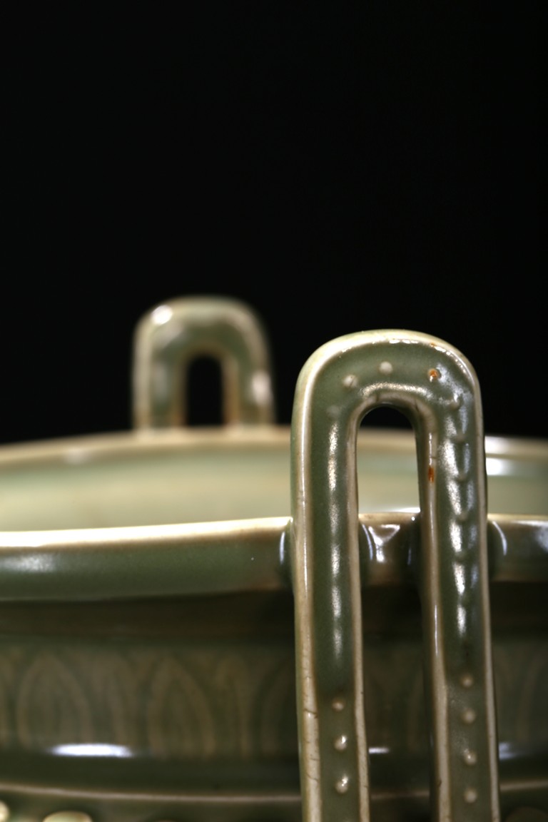 In an archaic bronze “ding” form, this piece has a round body and a straight and tall neck, which is slightly overhung by a broad rim. Two circular upright handles rest upon the shoulder. The three animal-like foot are surmounted by monster masks. The censor is covered overall with a lustrous olive-green glaze, except for the bases of the foot, which are unglazed. Early Ming Dynasty period.