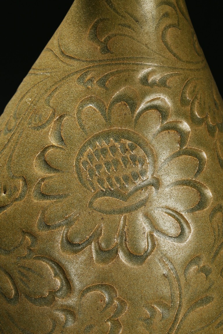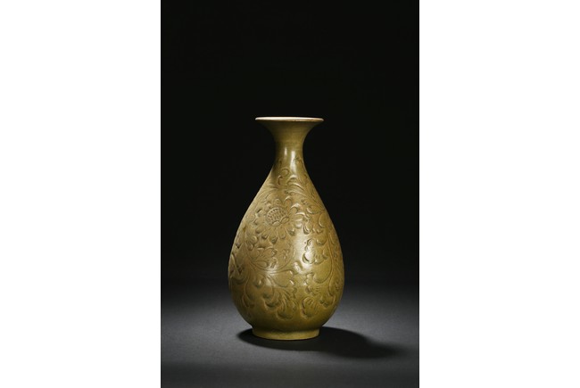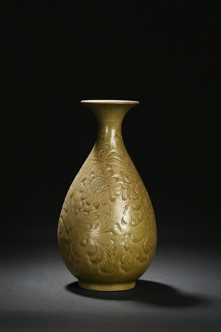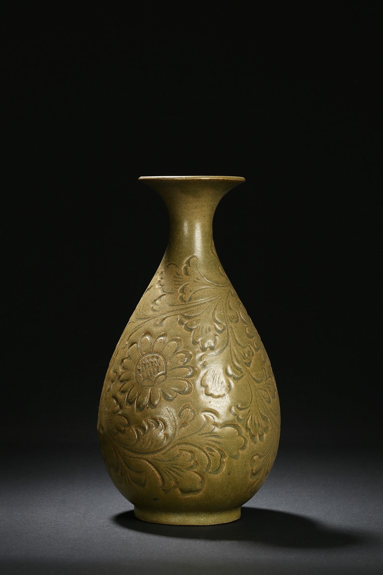 來源:香港洛杉磯沈氏家族珍藏 Provenance: The Shum Family collection, Hong Kong/Los Angeles 此玉壺春瓶圓口外撇, 束頸, 斜肩, 圓腹下垂, 呈垂胆狀. 矮圈足. 器身精刻纏枝菊花紋. 通體施橄欖青色釉. 釉面光洁瑩, 瓷胎細膩致密, 紋飾線條流暢, 式樣簡潔明快, 不失為宋耀州窯之佳作.