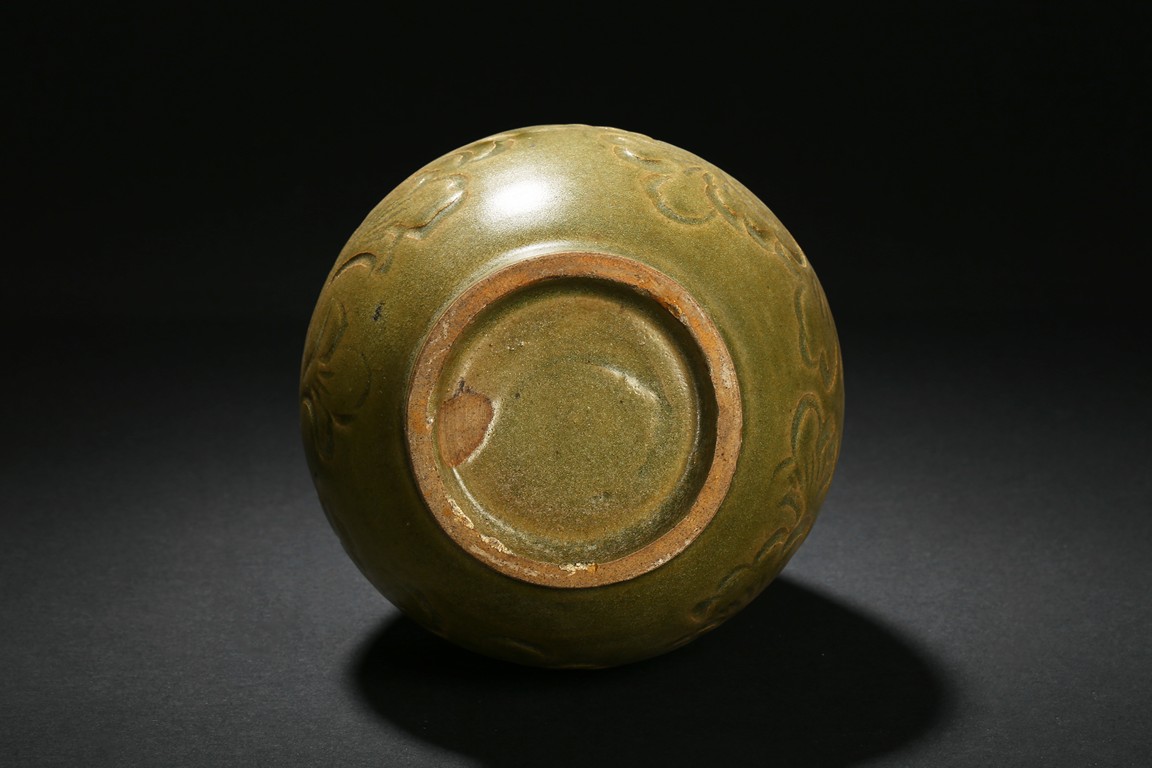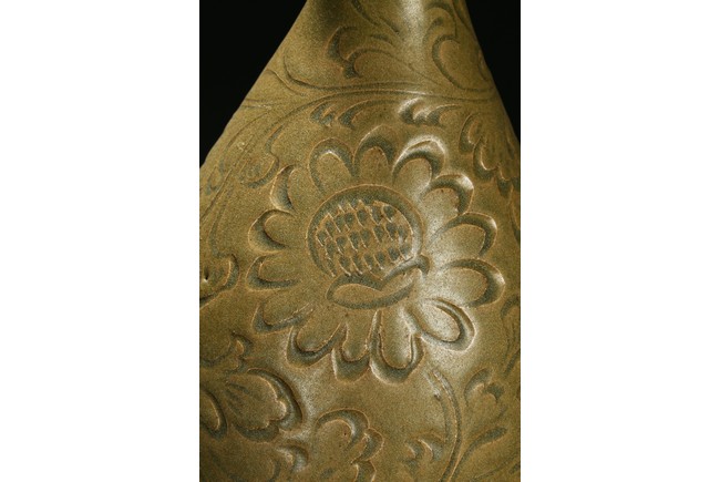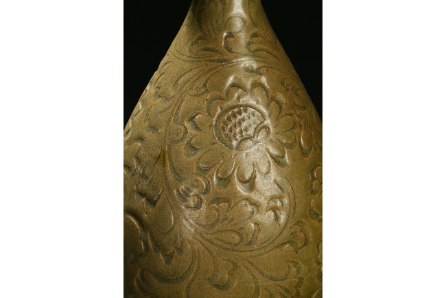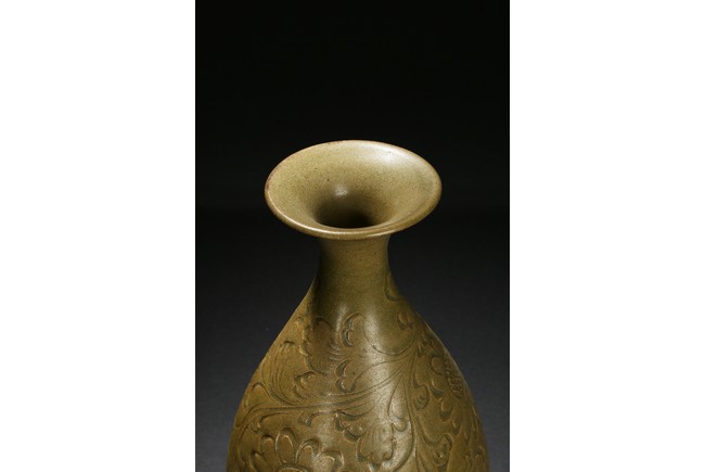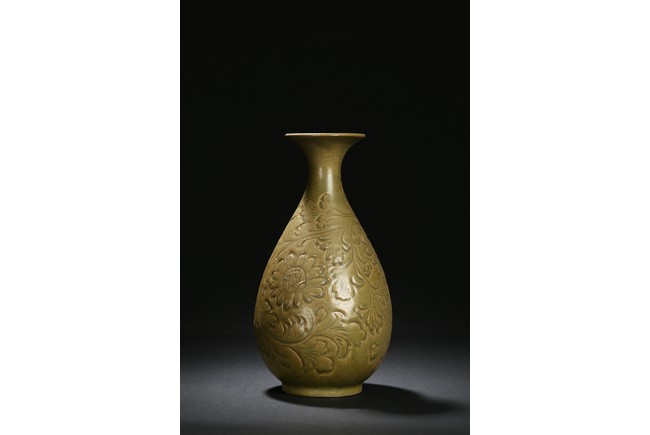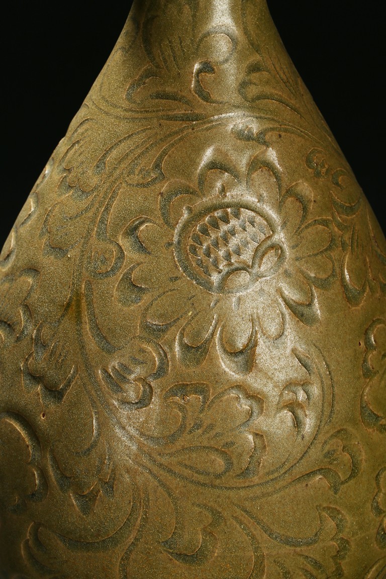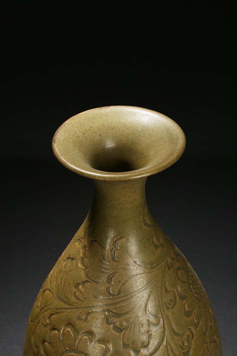 Small flared mouth, fine neck, drum belly and ring foot compose this yuhuchunping shaped vase. It is covered overall with a thick and lustrous olive-green glaze, and outer wall carved with peony motifs, their blossoms full and open and with luxuriant branches and leaves. Song Dynasty period.