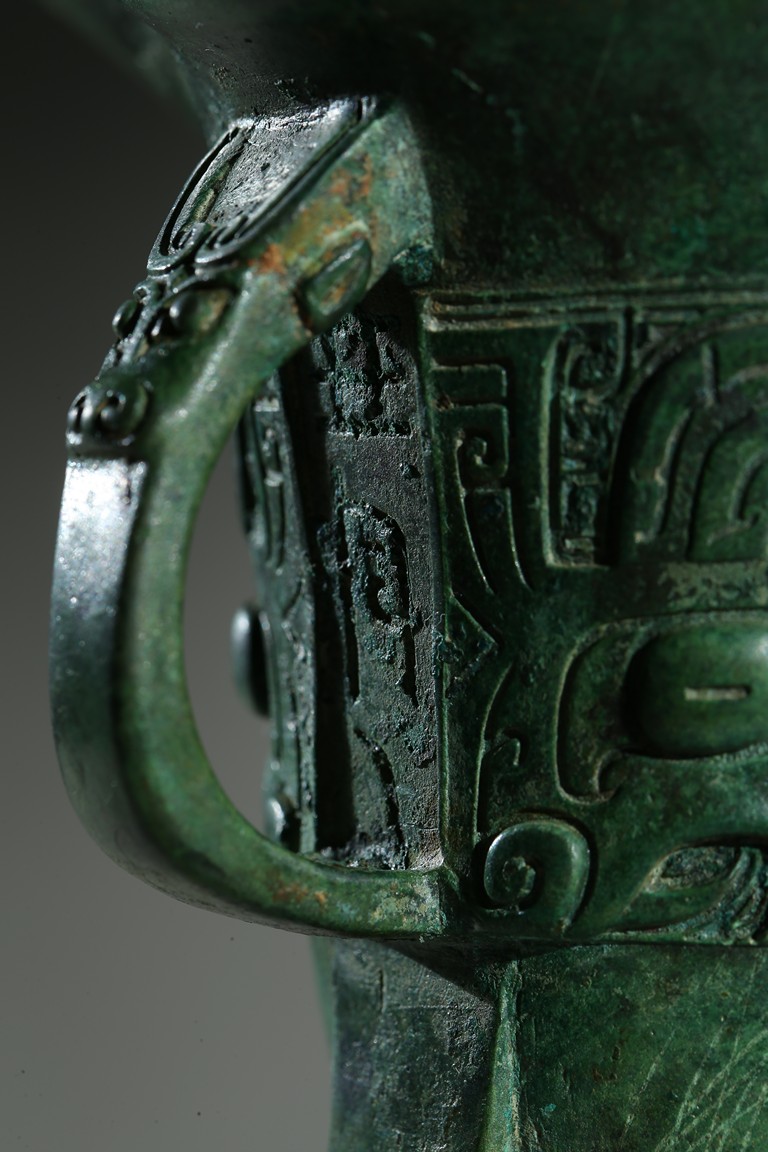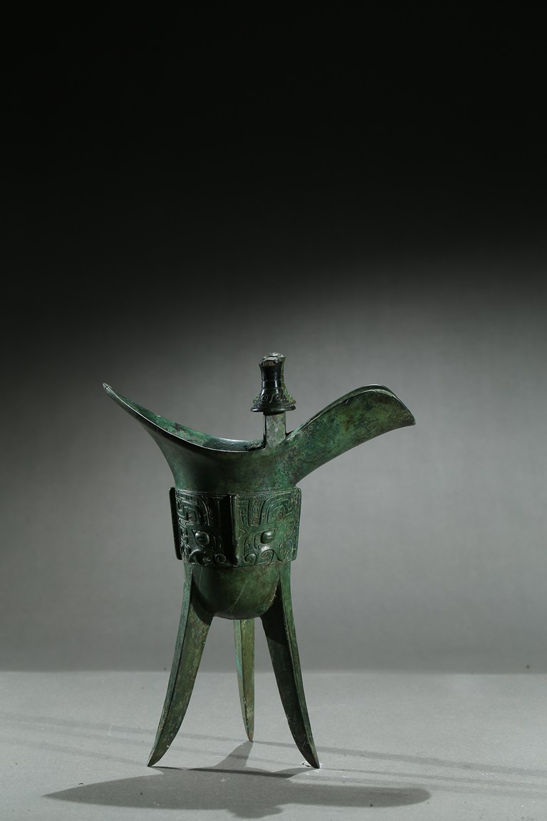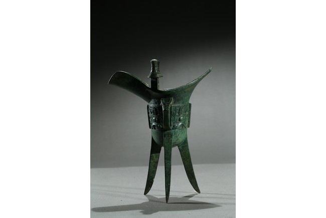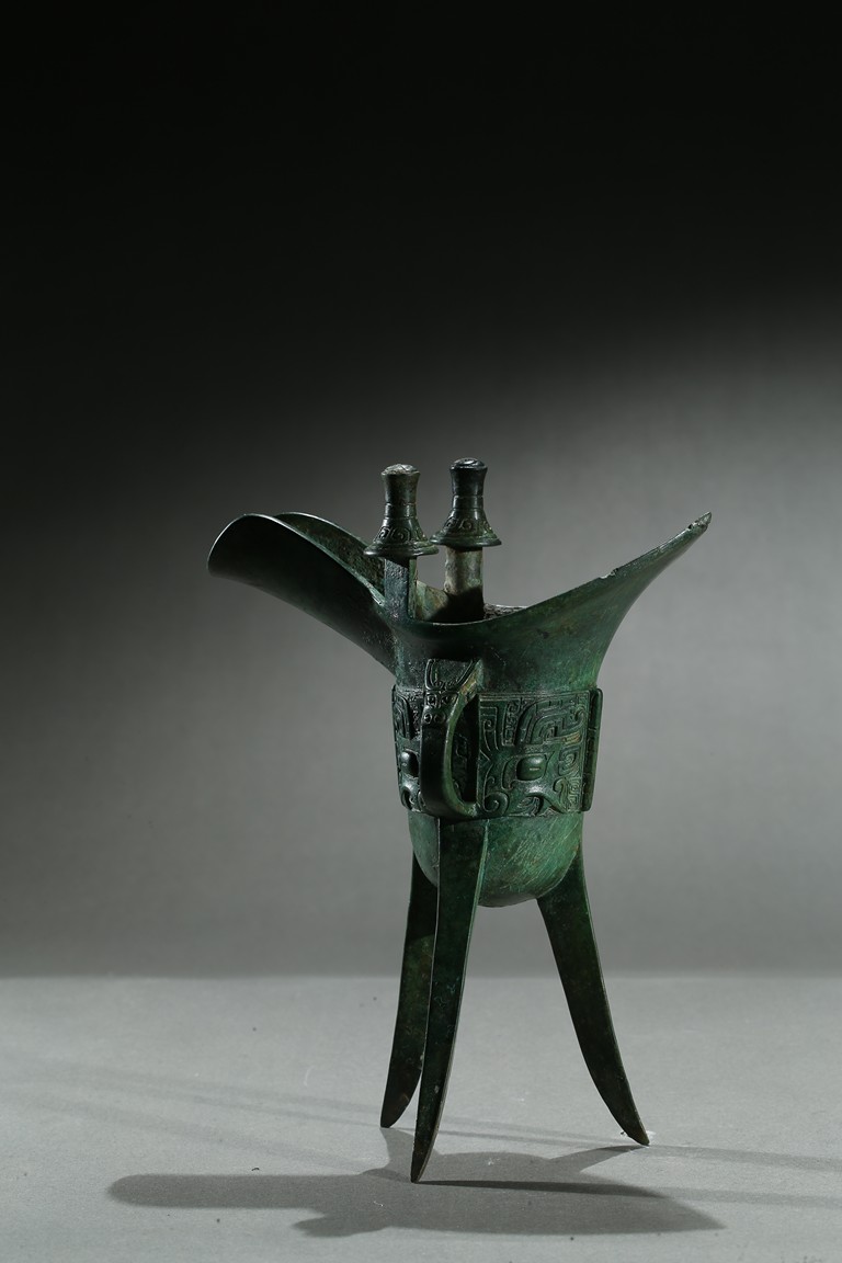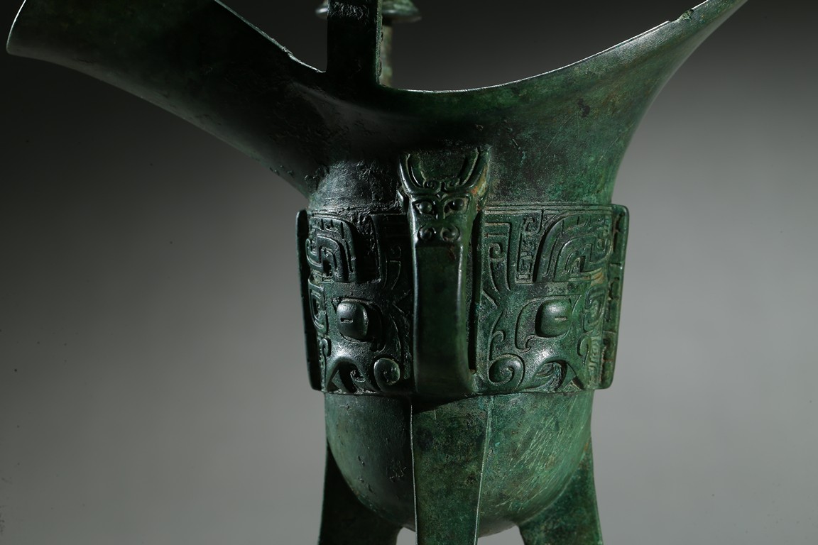 The U-shaped body rising from three tall blade legs to an open mouth set to one side with a pointed rim and to the other with a spout flanked by a pair of tall posts, cast around the body with a band of taotie masks reserved on a dense leiwen ground and divided by three flanges and a loop handle, with two pictograms or characters underneath the handle. Late Shang Dynasty period.