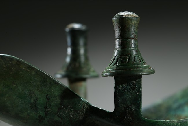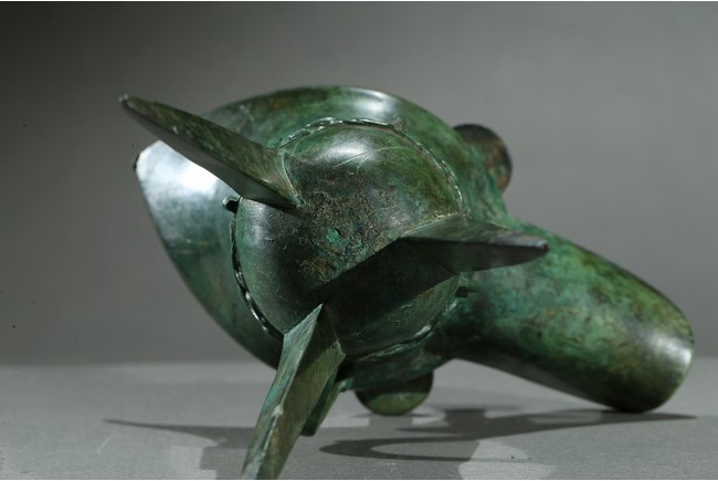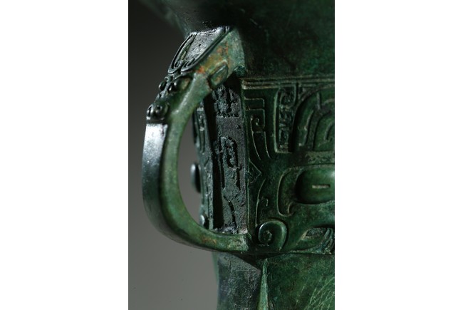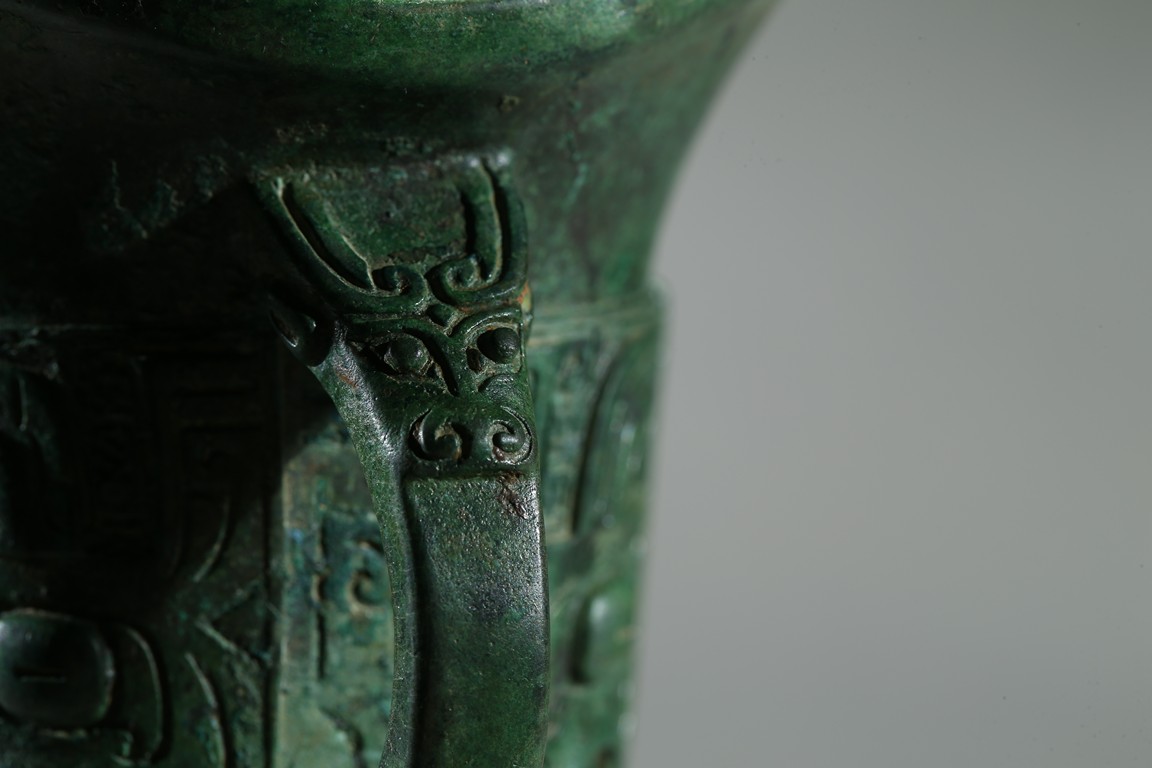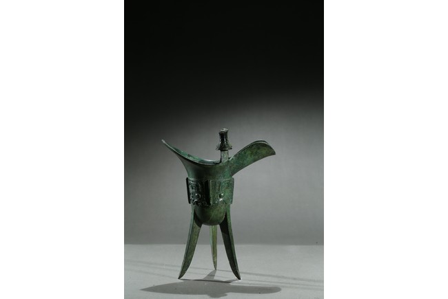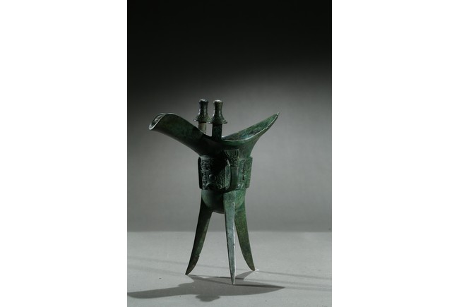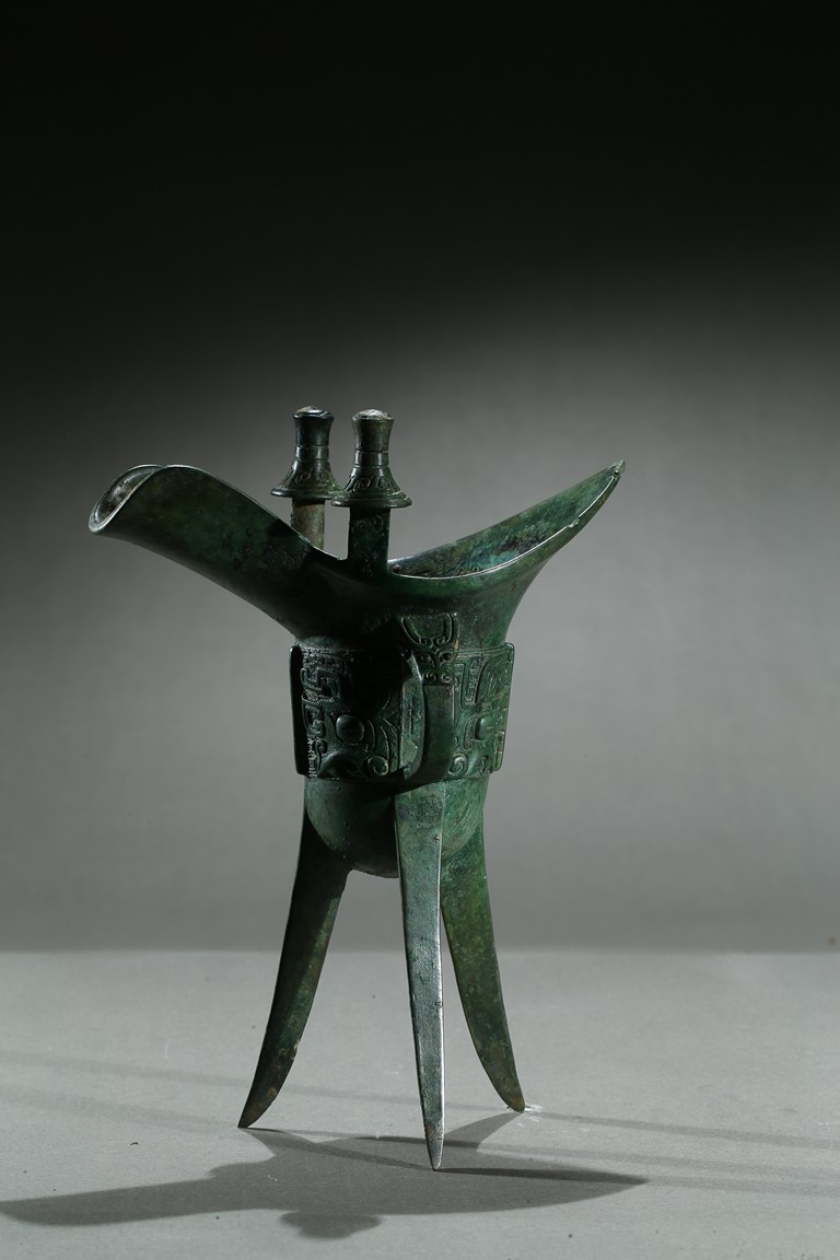 The U-shaped body rising from three tall blade legs to an open mouth set to one side with a pointed rim and to the other with a spout flanked by a pair of tall posts, cast around the body with a band of taotie masks reserved on a dense leiwen ground and divided by three flanges and a loop handle, with two pictograms or characters underneath the handle. Late Shang Dynasty period.