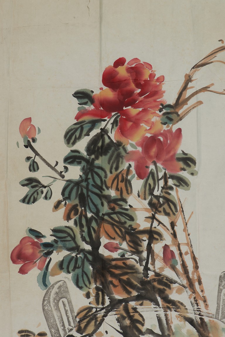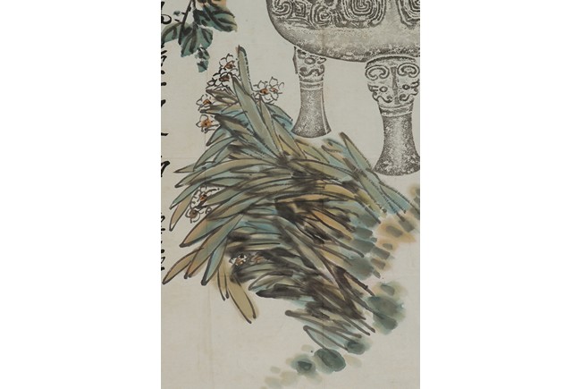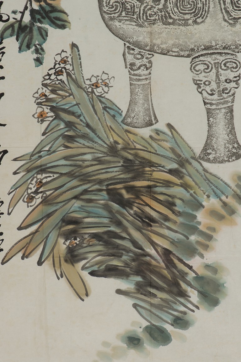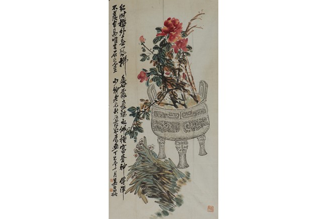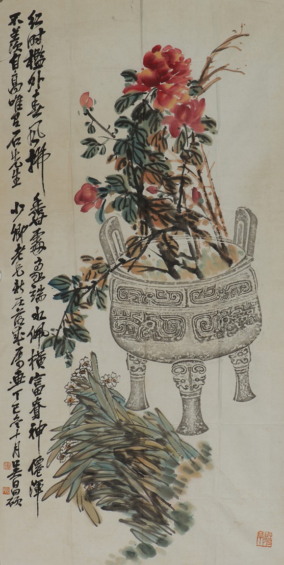 Color and ink on paper. Unframed. Inscribed and signed Wu Changshuo, dated to 1917 winter, with three seals of the artist.
