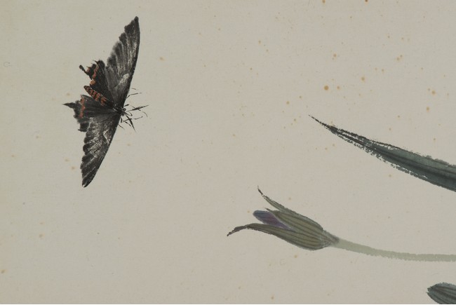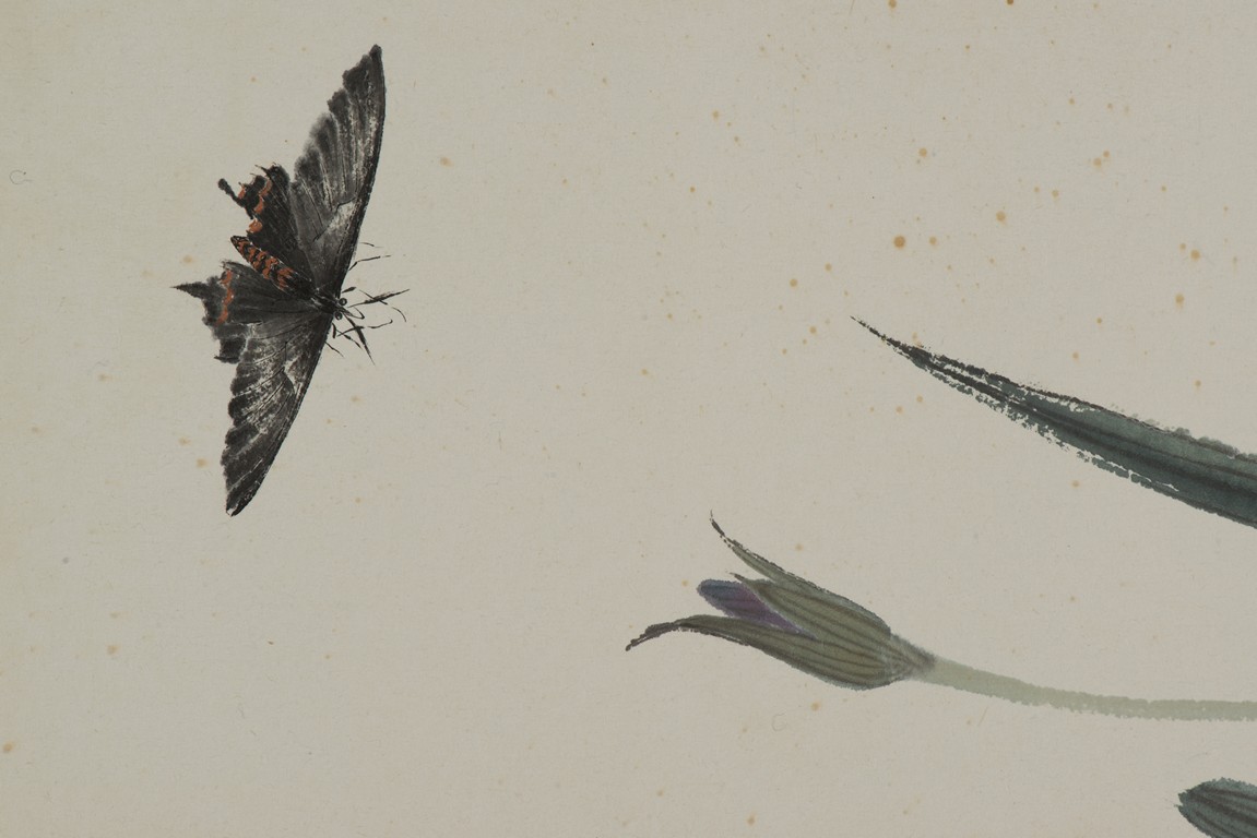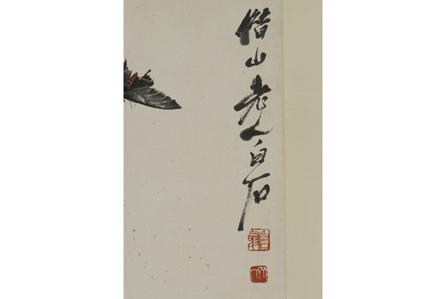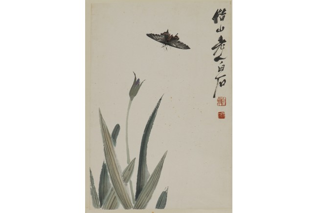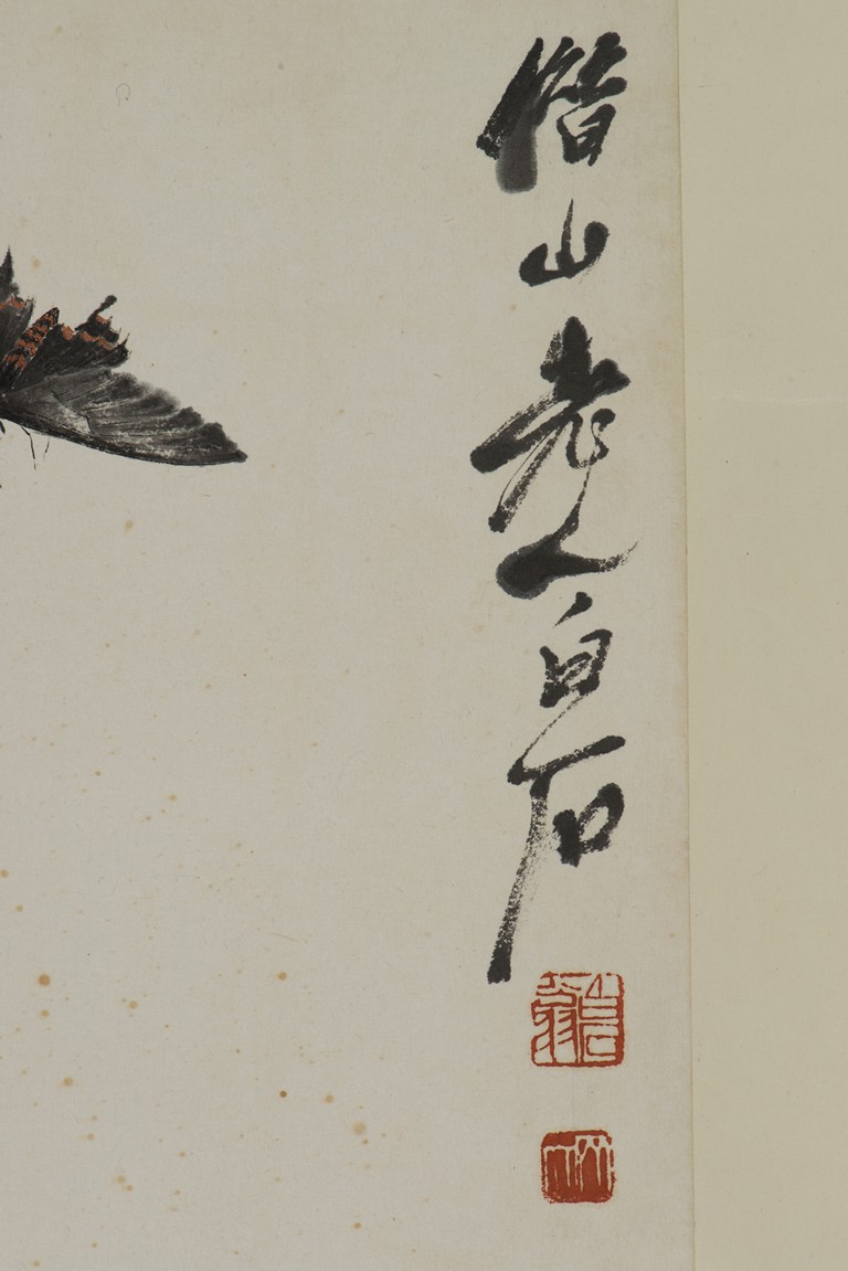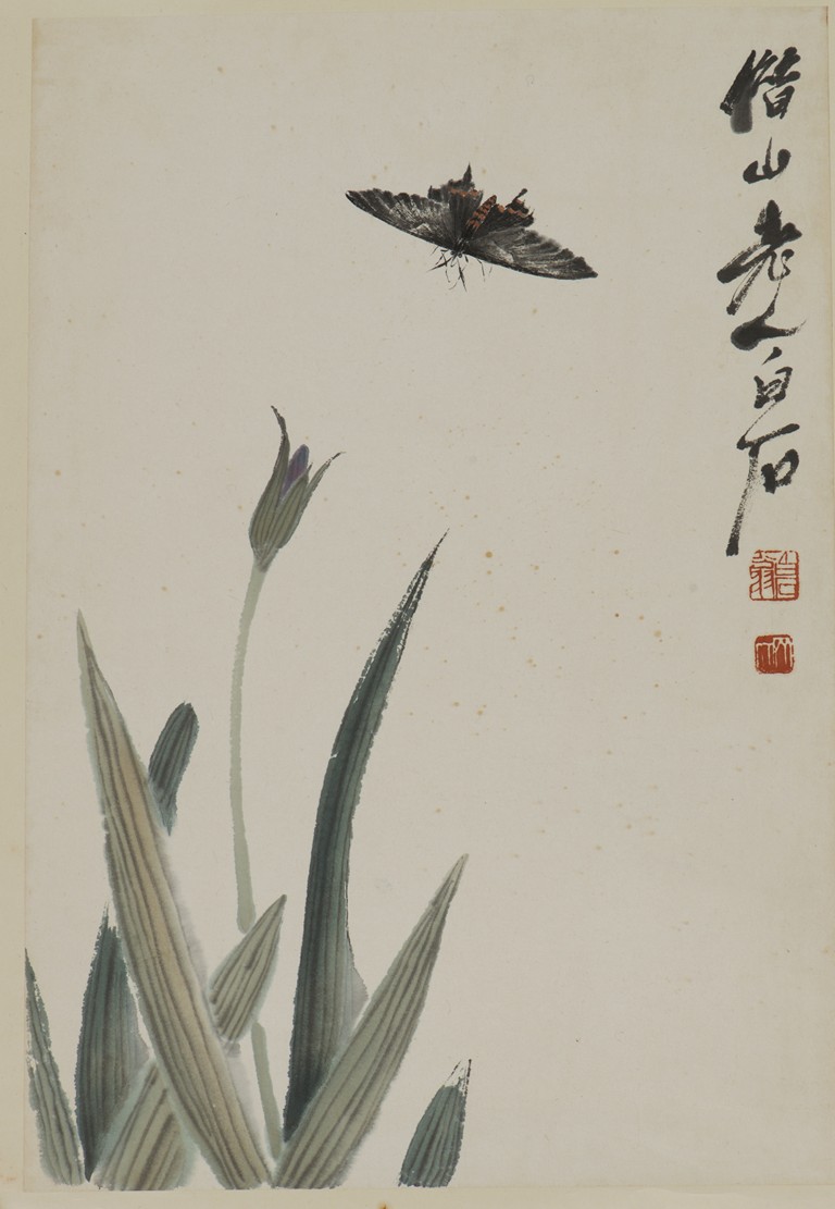 Color and ink on paper. Orchids and Butterfly. Mounted for framing. Signed Bai Shi with two seals of the artist.