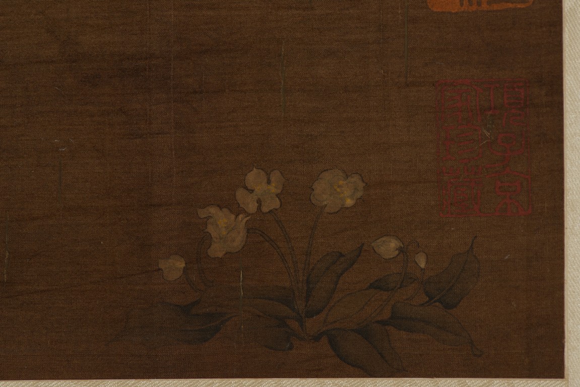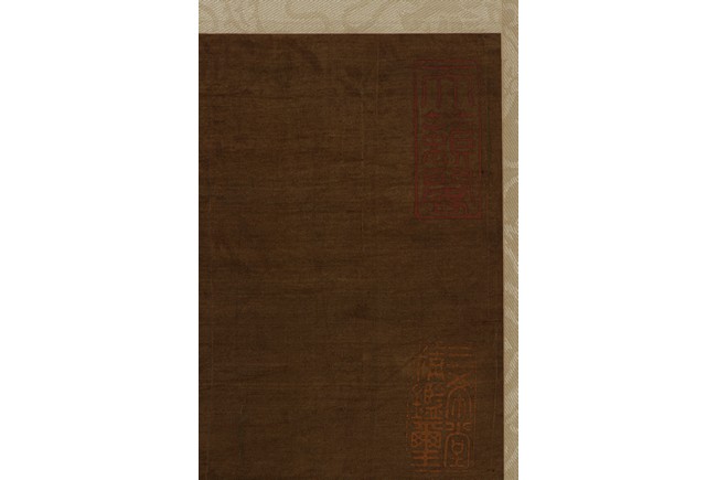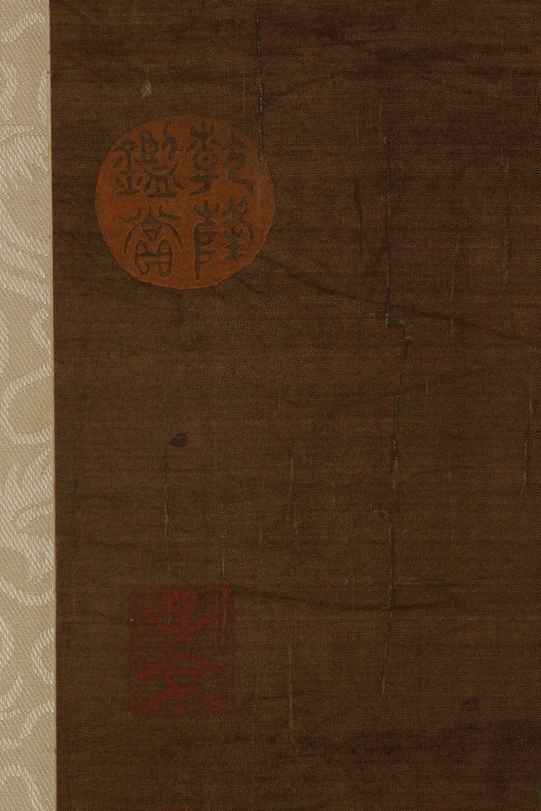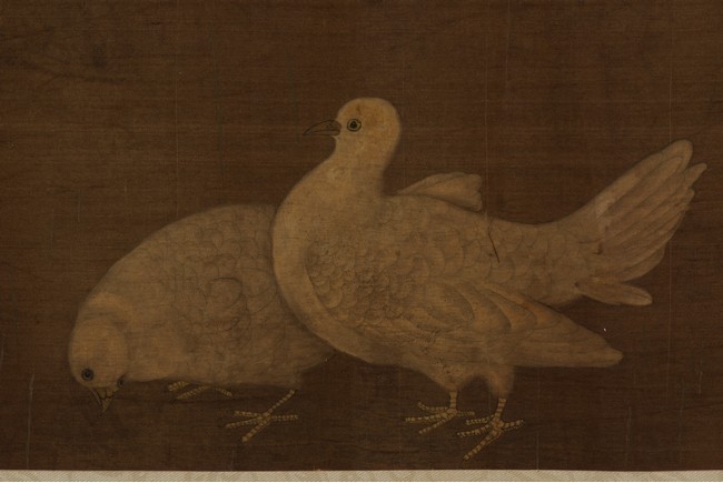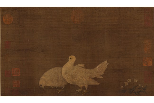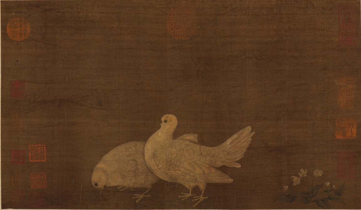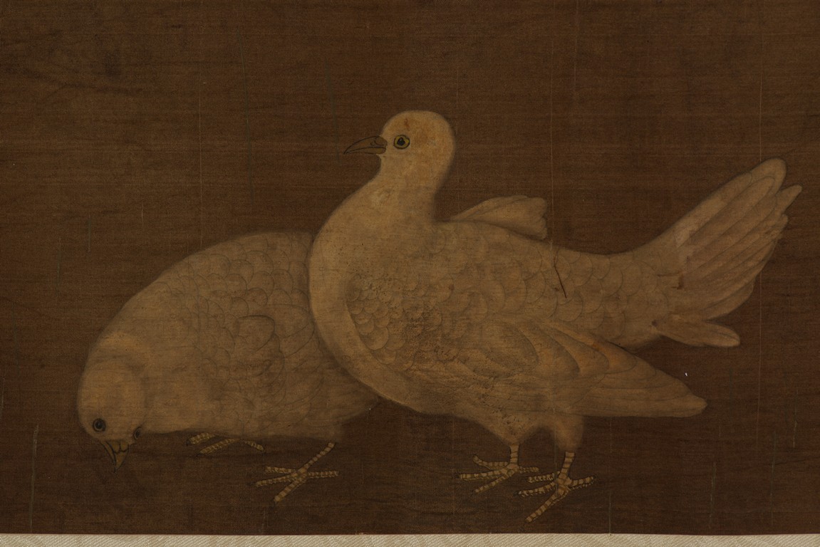 Color and ink on silk. Twin Pigeons. Mounted for framing. With total of fourteen seals of collectors.