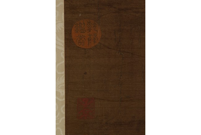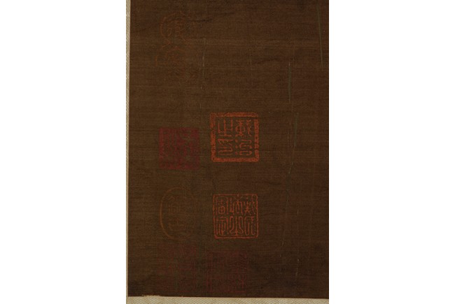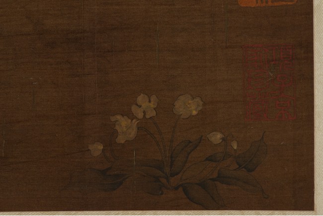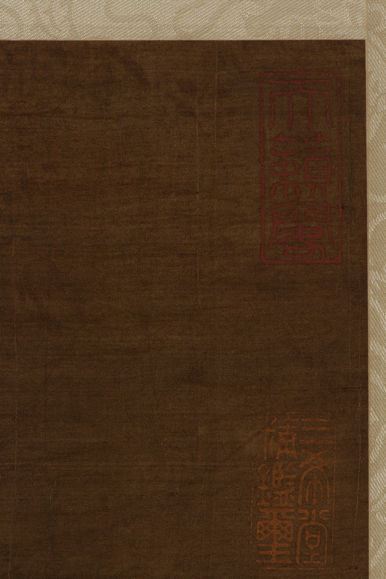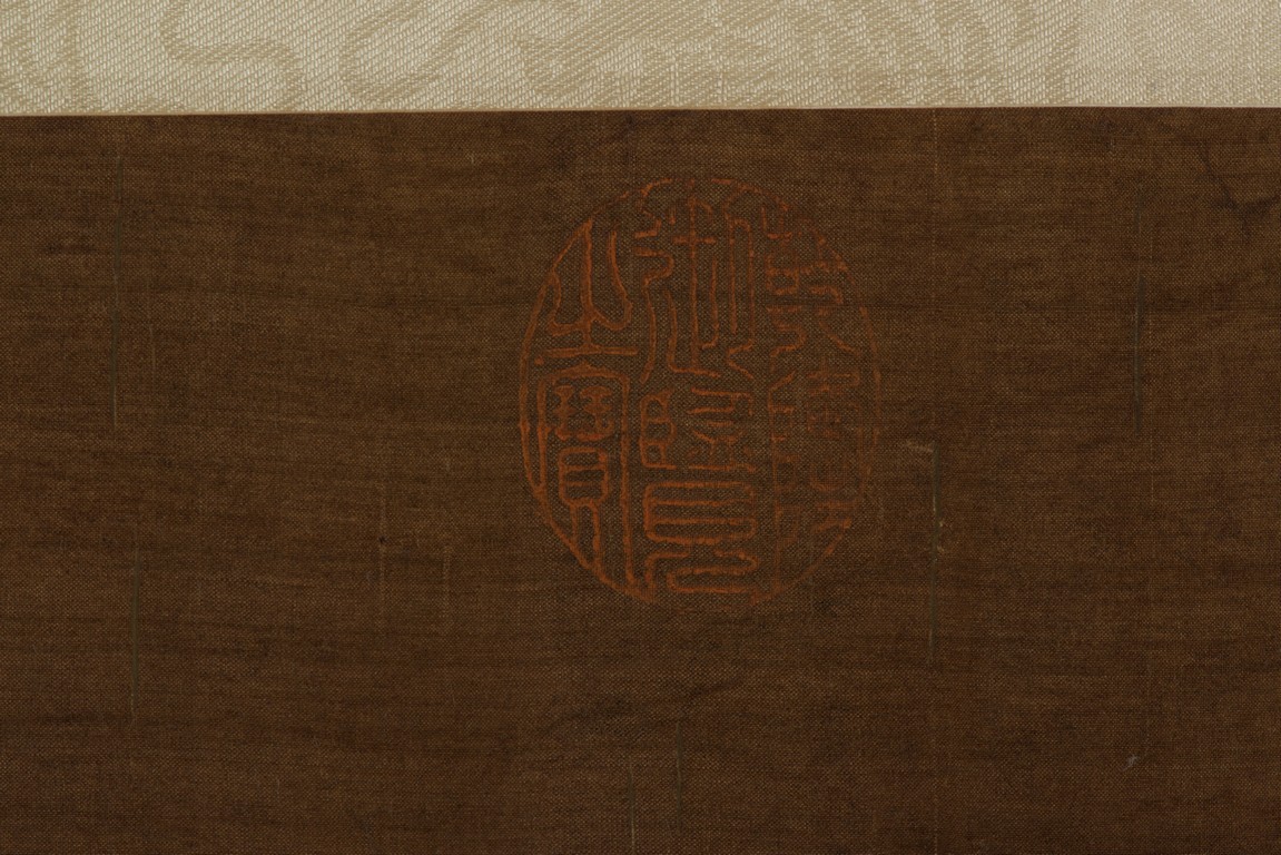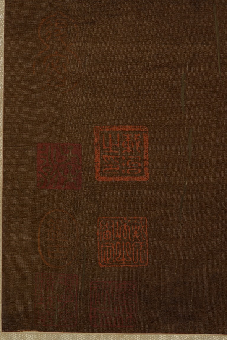 Color and ink on silk. Twin Pigeons. Mounted for framing. With total of fourteen seals of collectors.