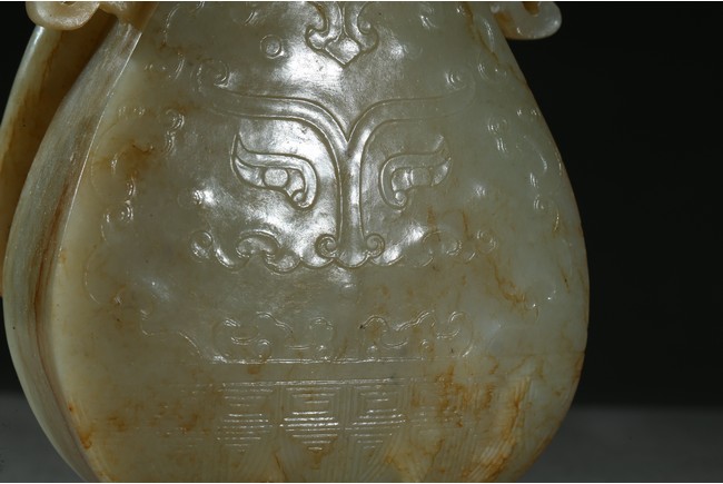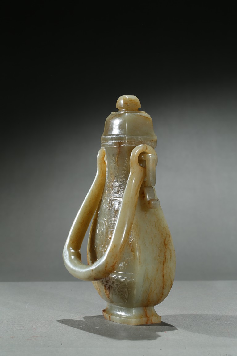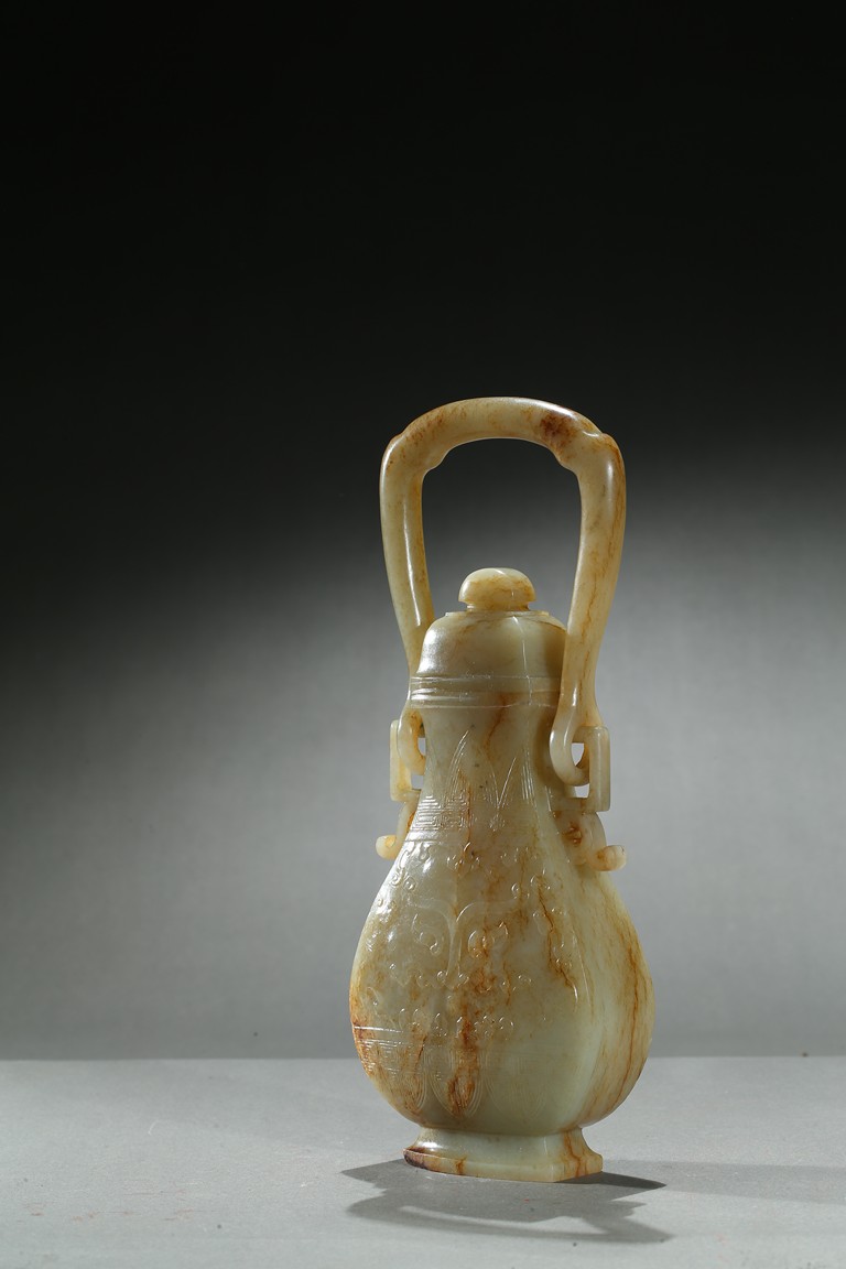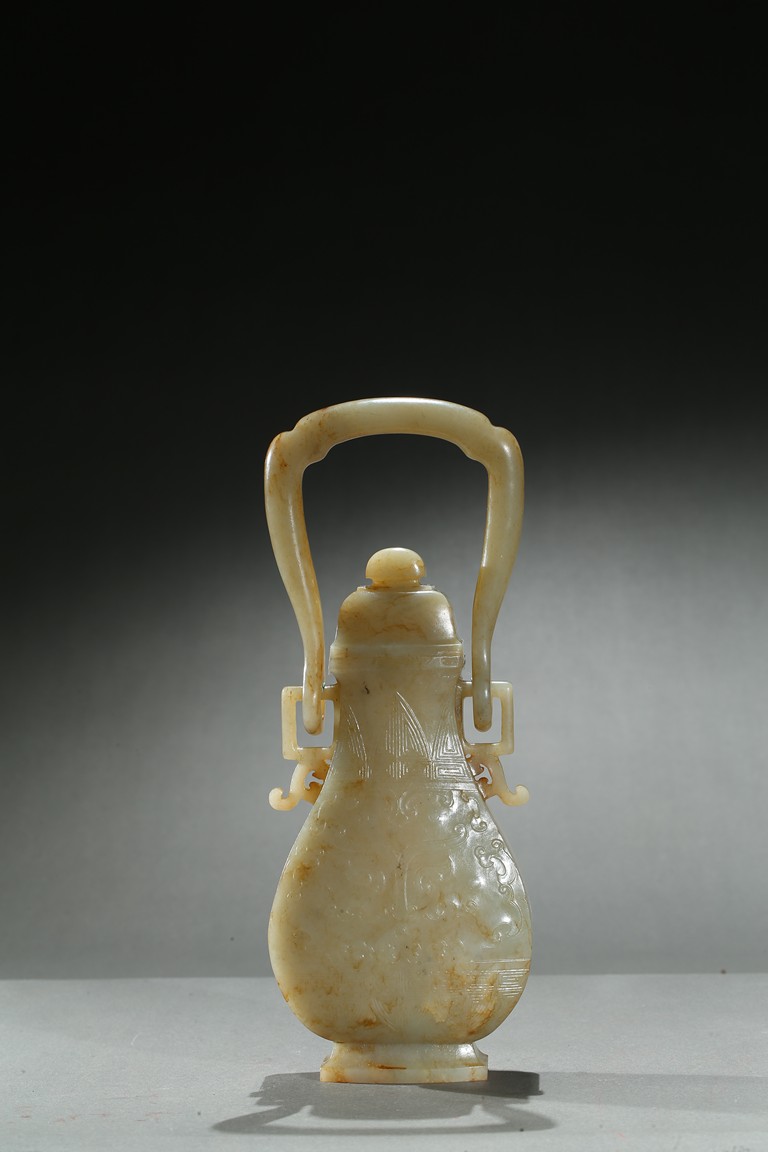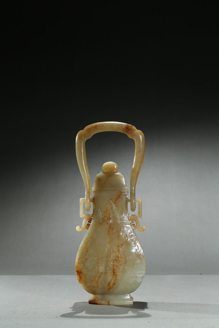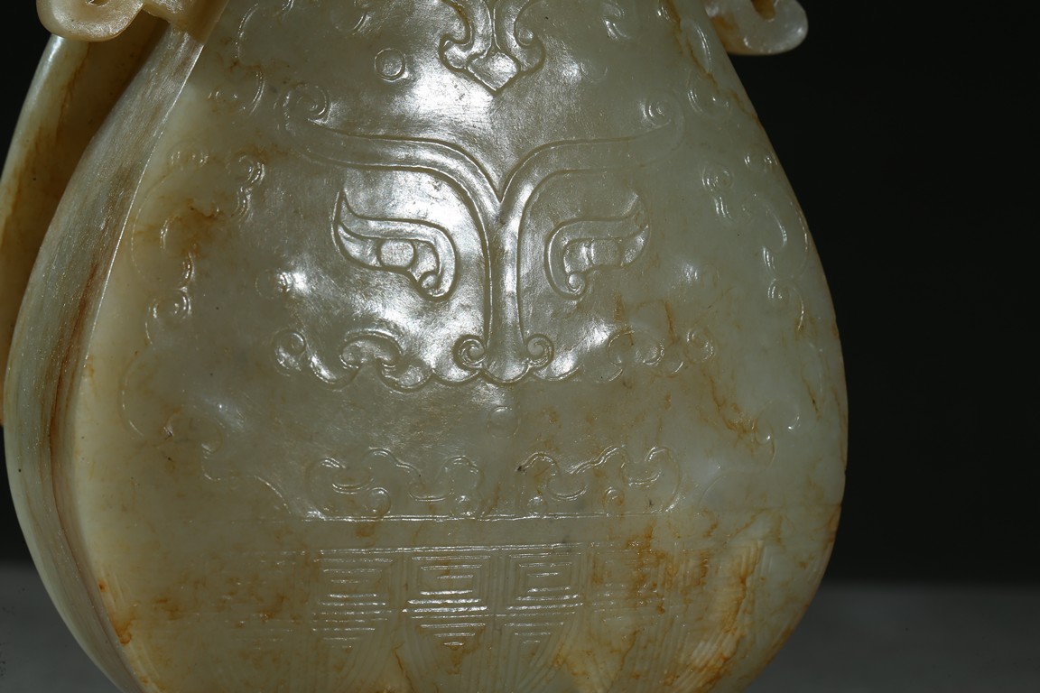 Modelled in the form of a flattened archaic bronze hu, carved in relief with archaistic mythical beast designs to the body, the waisted neck with leave lappet bands, the shoulders set with a large handle across the cover, the stone of a mottle russet and greenish-white tone. Qing Dynasty period.