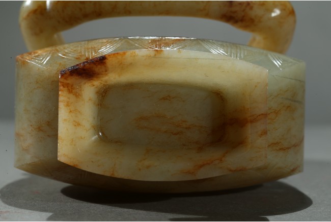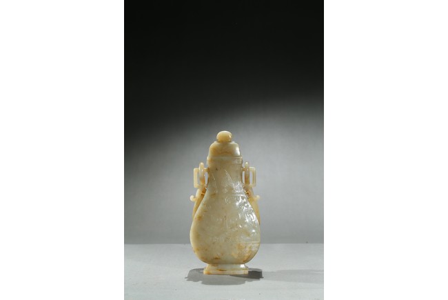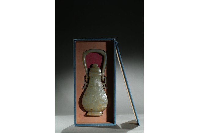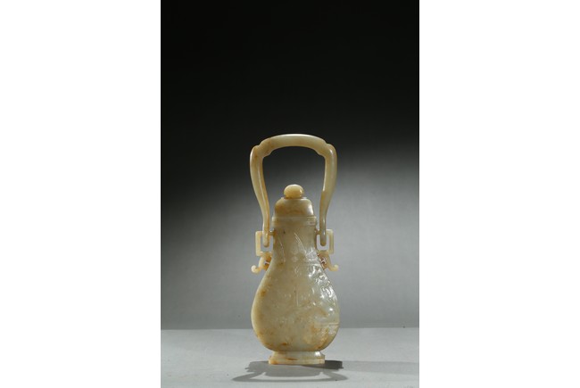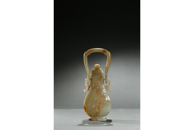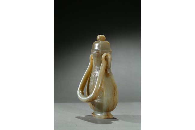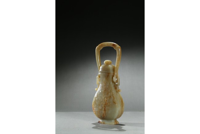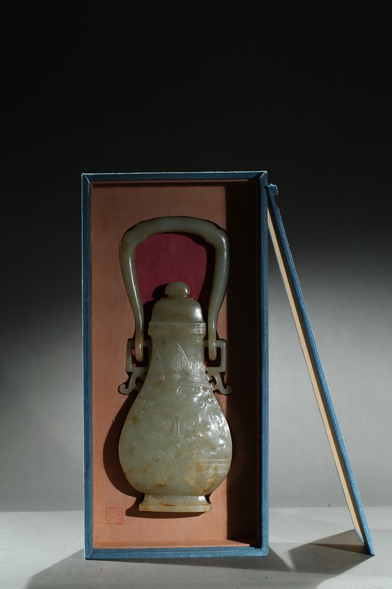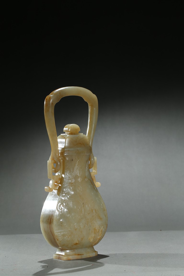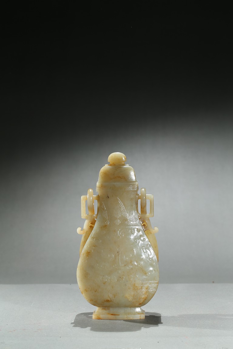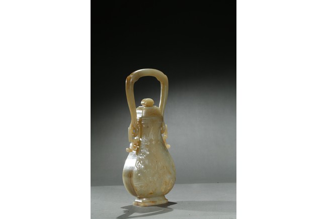 Modelled in the form of a flattened archaic bronze hu, carved in relief with archaistic mythical beast designs to the body, the waisted neck with leave lappet bands, the shoulders set with a large handle across the cover, the stone of a mottle russet and greenish-white tone. Qing Dynasty period.