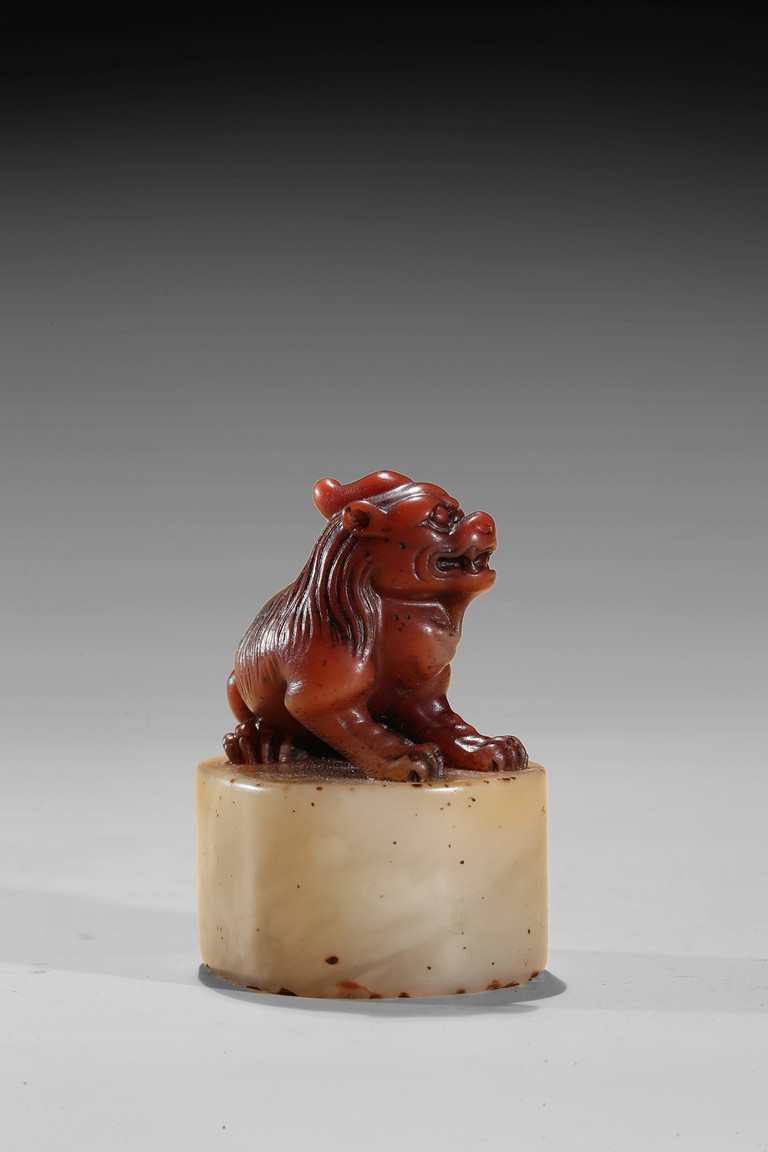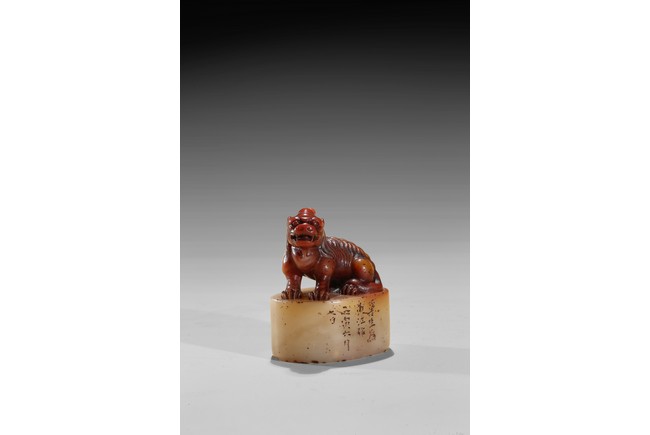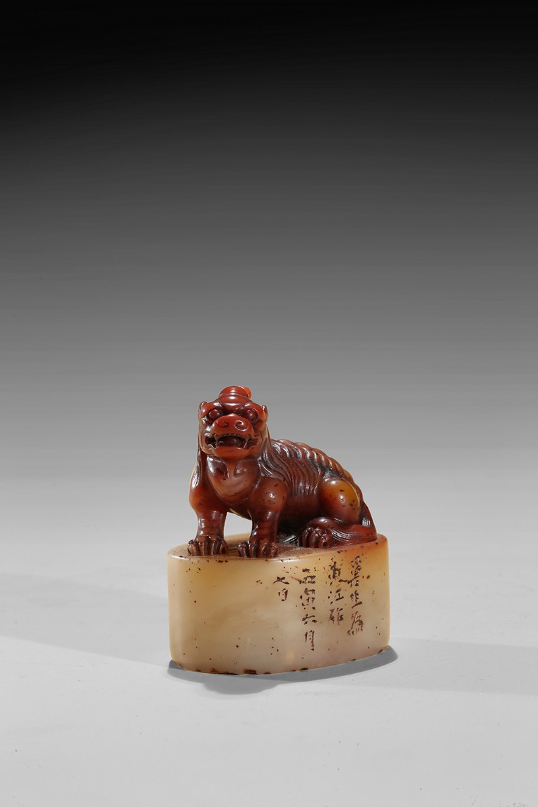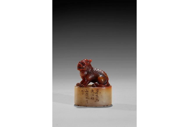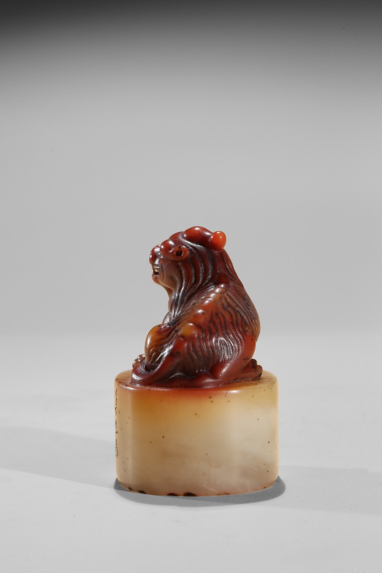 The seal is of oval section, one side carved with inscription of artist signature and date; the seal top surmounted with a recumbent buddhist lion with mouth agape revealing fangs, its mane finely detailed. The stone is of semi-translucent red tone cleverly carved for the lion top, the seal body with translucent yellowish caramel-white tone. Qing Dynasty period.