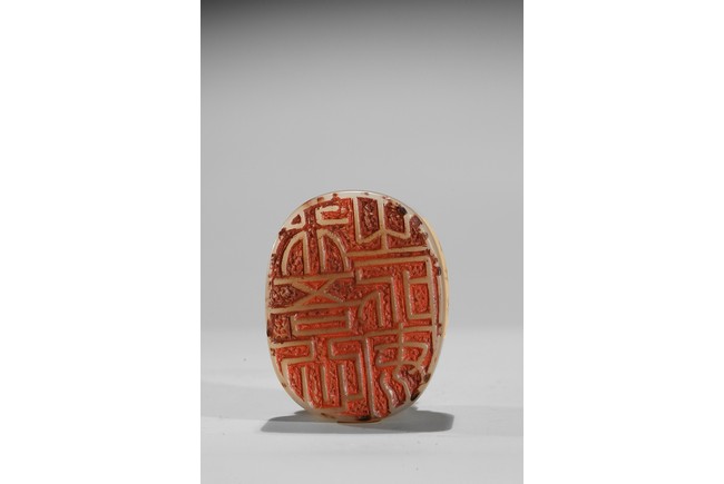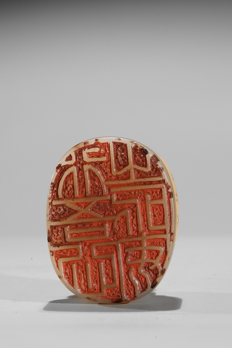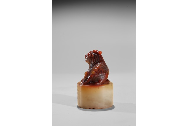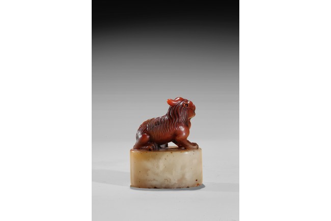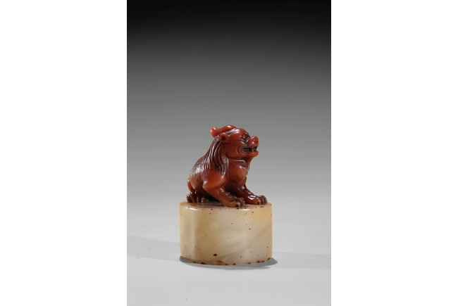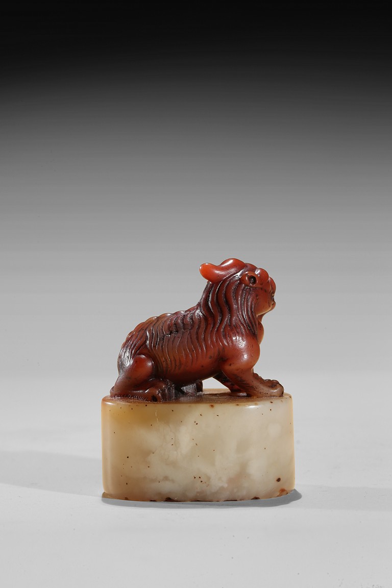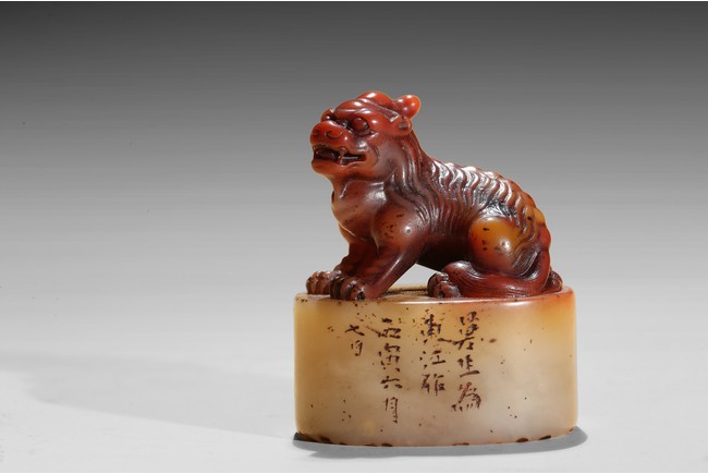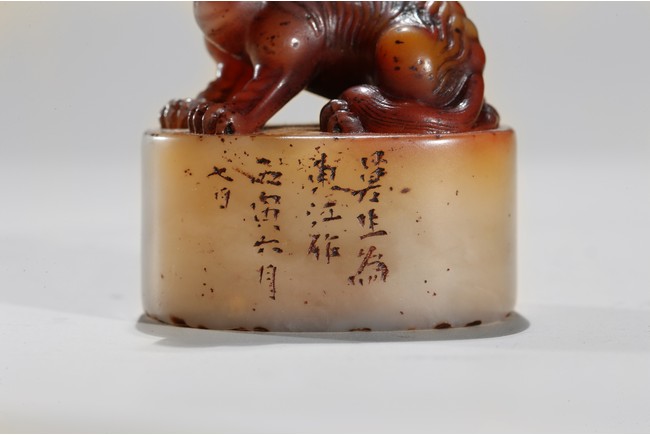 The seal is of oval section, one side carved with inscription of artist signature and date; the seal top surmounted with a recumbent buddhist lion with mouth agape revealing fangs, its mane finely detailed. The stone is of semi-translucent red tone cleverly carved for the lion top, the seal body with translucent yellowish caramel-white tone. Qing Dynasty period.