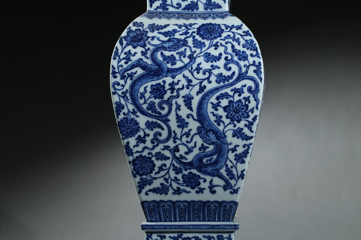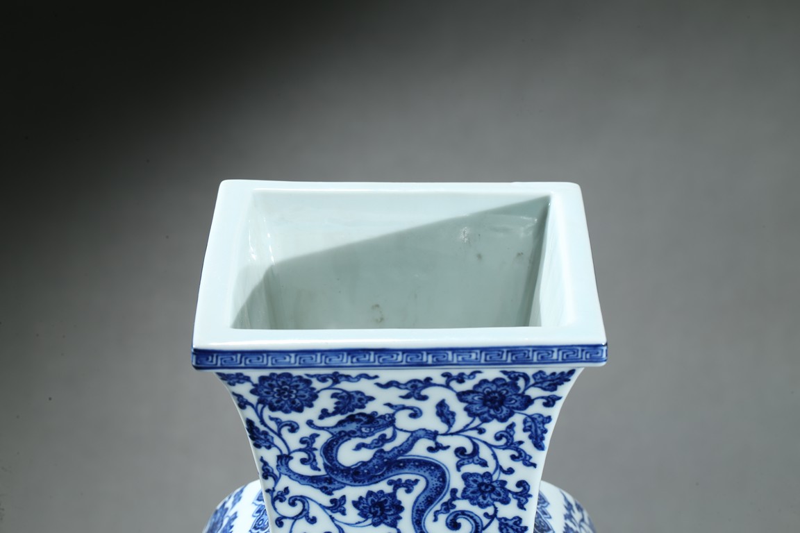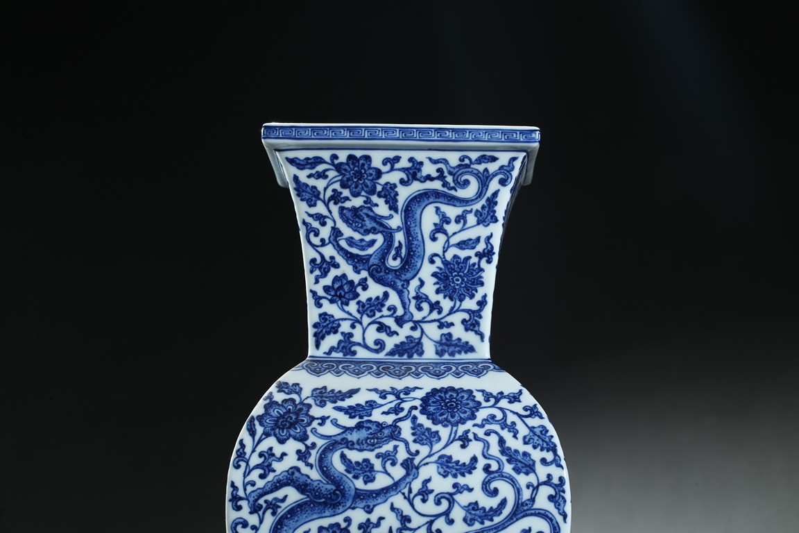 Of baluster form, the vase rises from a spreading foot to a flared mouth, body finely enamelled with writhing chilong amidst dense lotus foliate scrolls, the base with six character 'QIANLONG' mark. Qing Dynasty period.