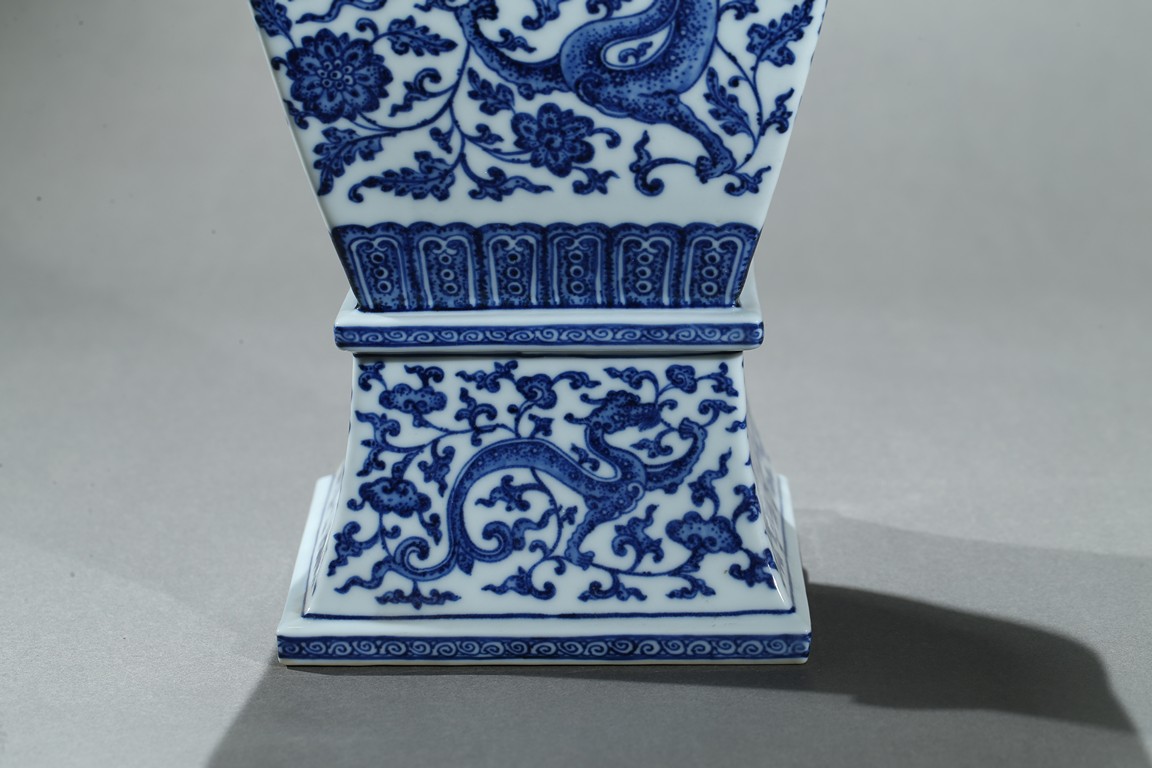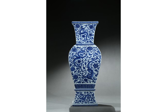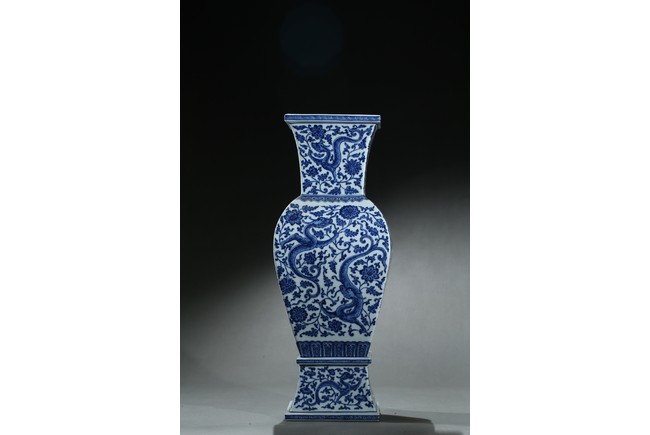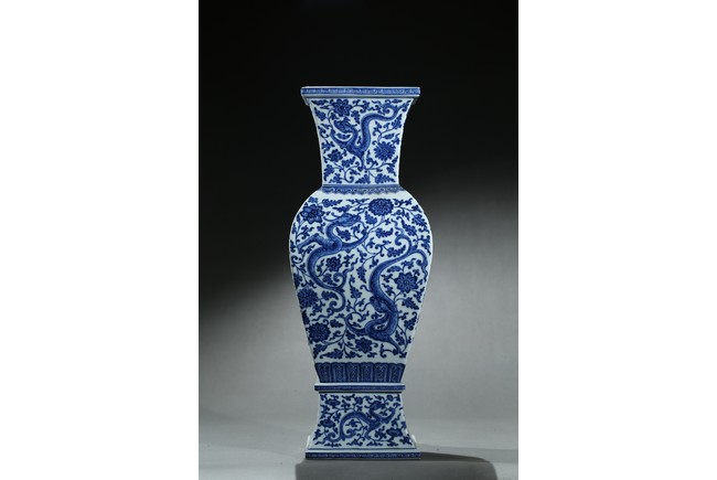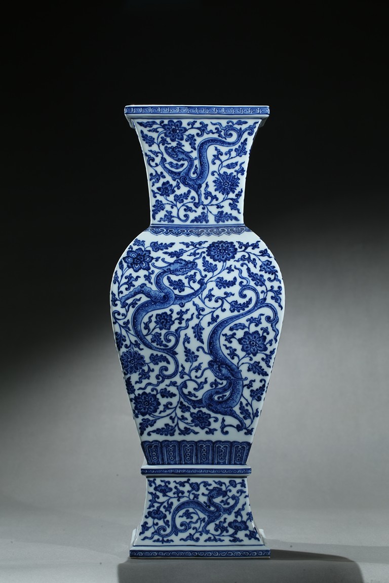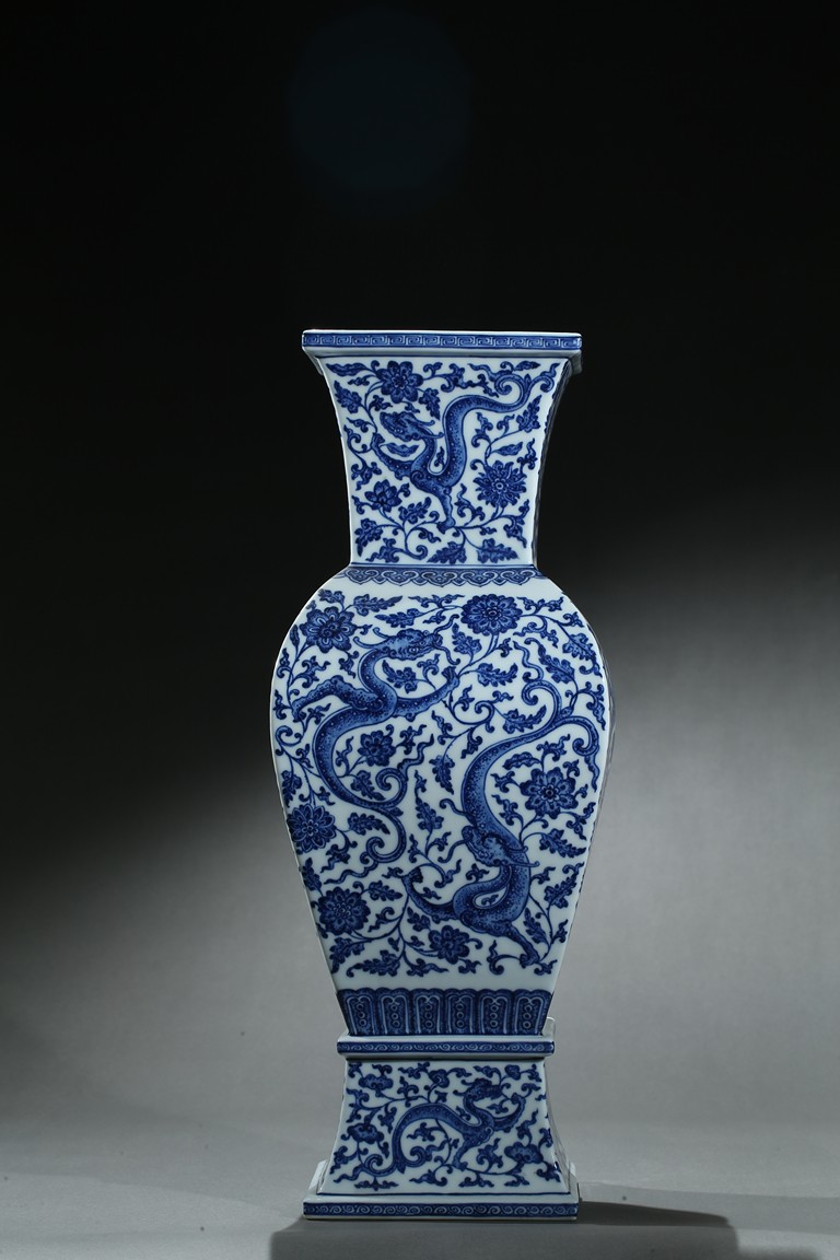 Of baluster form, the vase rises from a spreading foot to a flared mouth, body finely enamelled with writhing chilong amidst dense lotus foliate scrolls, the base with six character 'QIANLONG' mark. Qing Dynasty period.