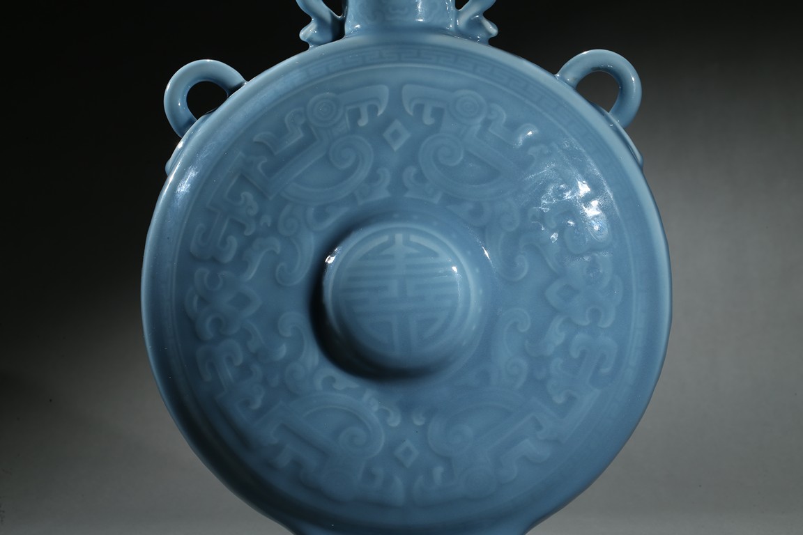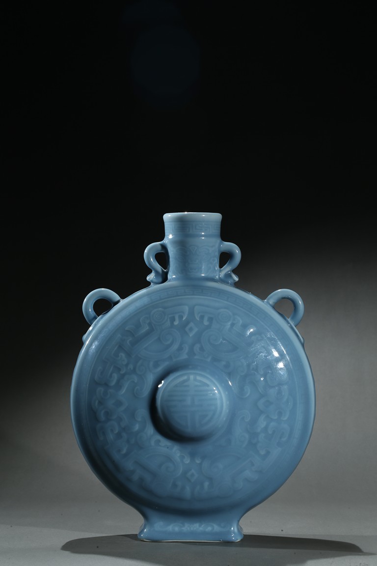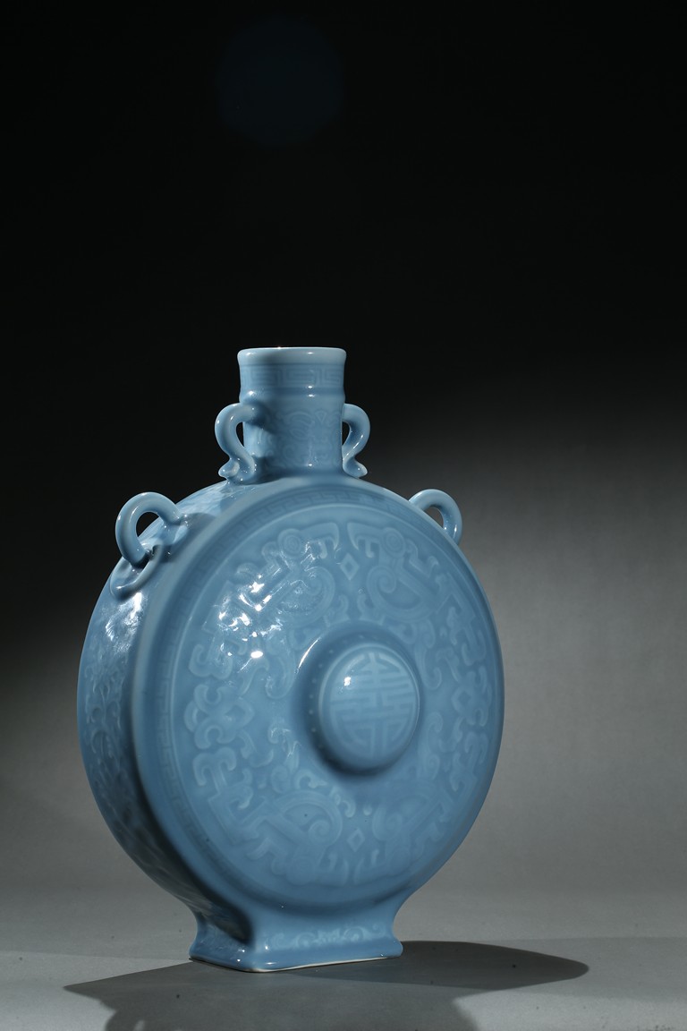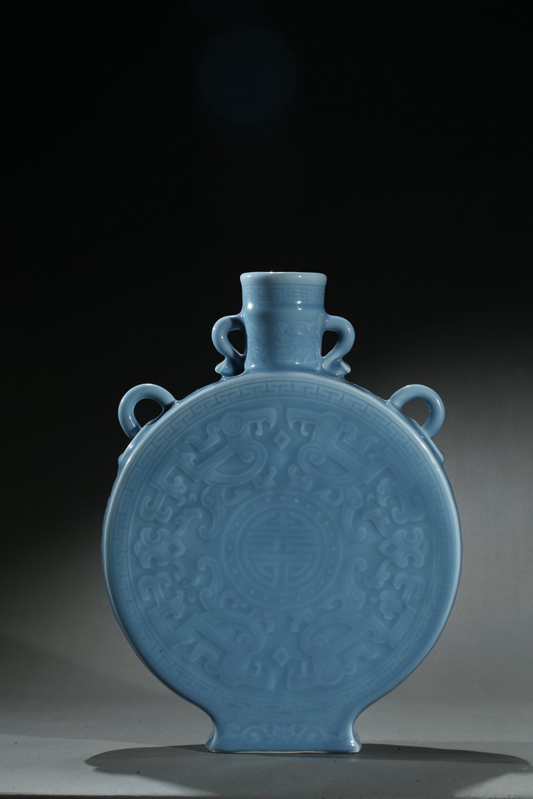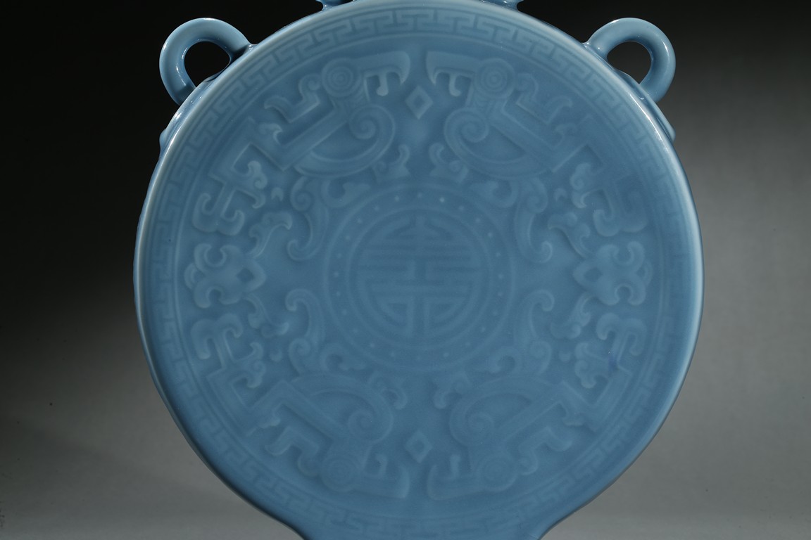 The stoutly potted flask-form body molded with raised shou character diagram on one side surrounded by archaistic pattern and to sides with foliate scrolls; with splayed foot and straight neck terminating in everted rim flanked by molded S handles; covered overall in an attractive sky blue tone, the base with six character 'QIANLONG' mark. Qing Dynasty period.