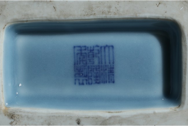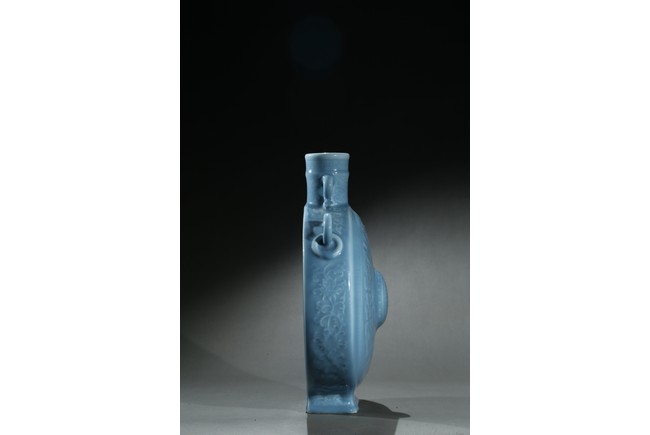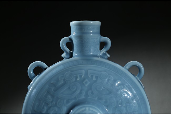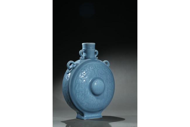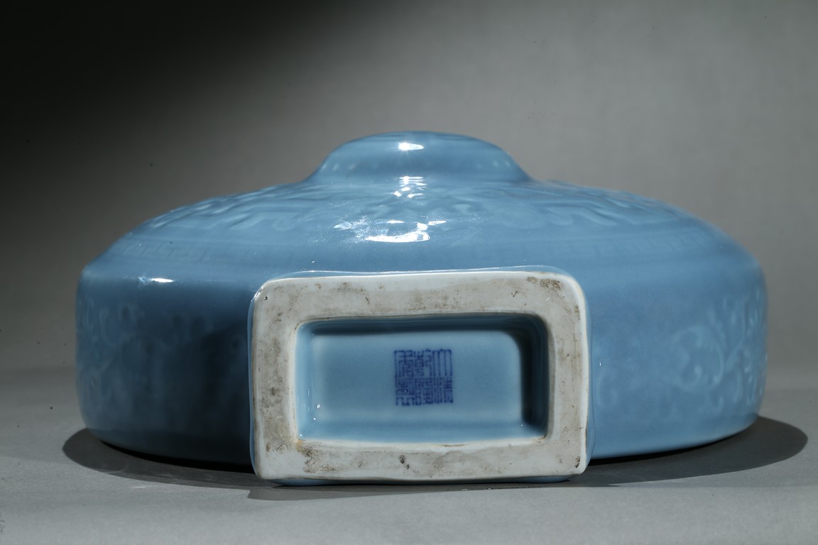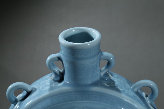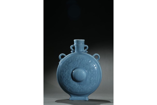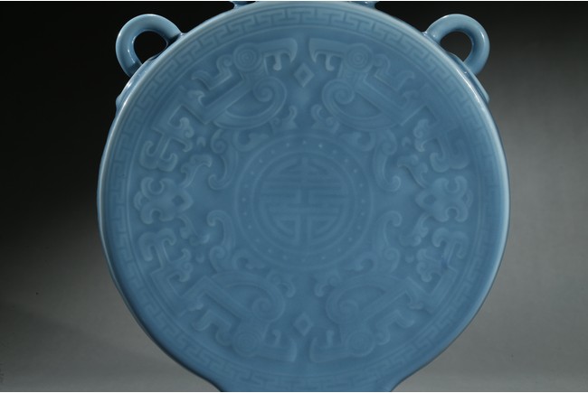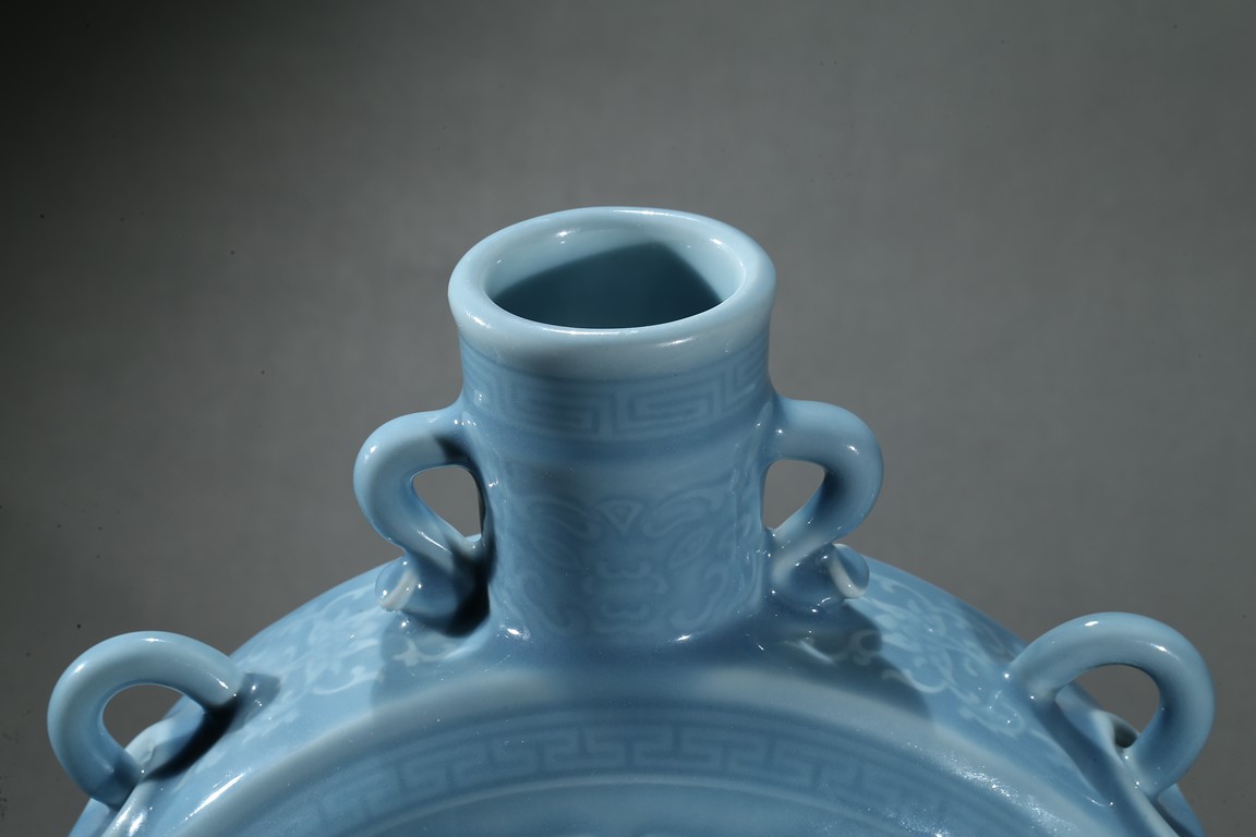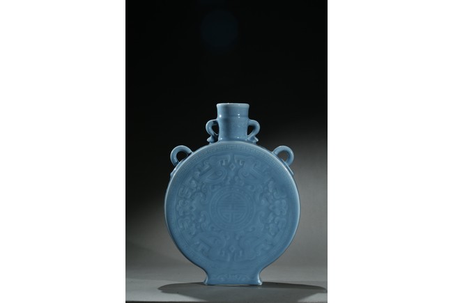 The stoutly potted flask-form body molded with raised shou character diagram on one side surrounded by archaistic pattern and to sides with foliate scrolls; with splayed foot and straight neck terminating in everted rim flanked by molded S handles; covered overall in an attractive sky blue tone, the base with six character 'QIANLONG' mark. Qing Dynasty period.