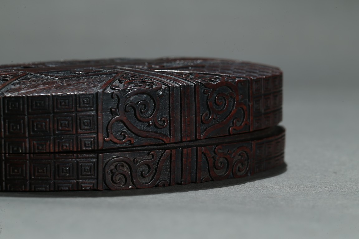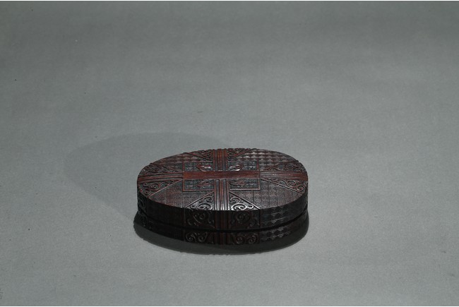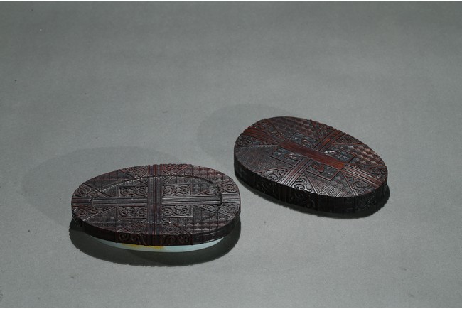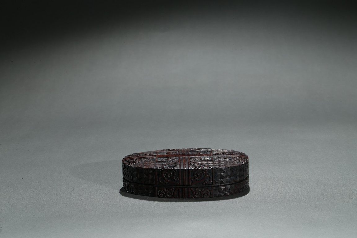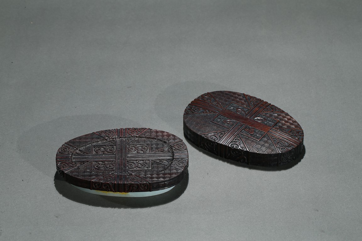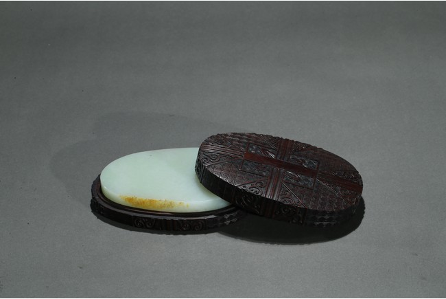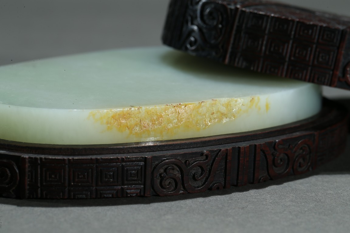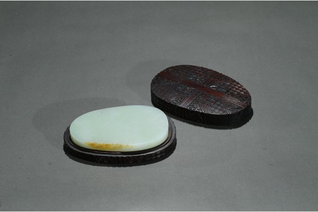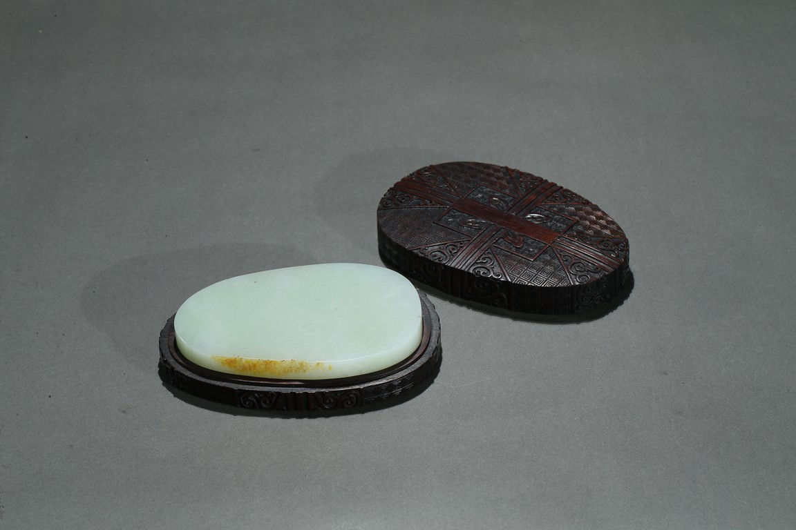 The oval ink stone left uncarved. It is of even white tone with slight russet skin to the side, accompanied with a finely carved hardwood box. Qing Dynasty period.