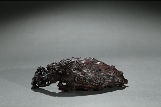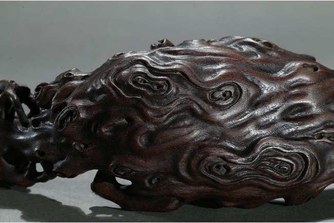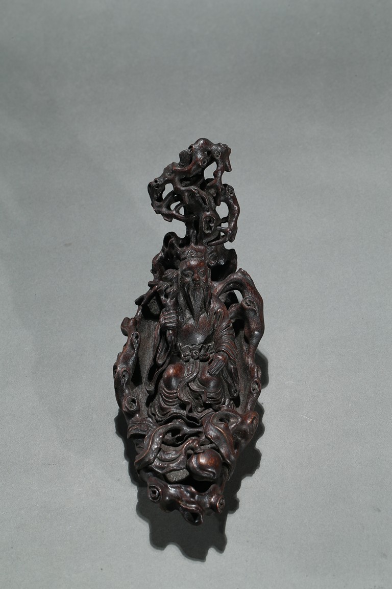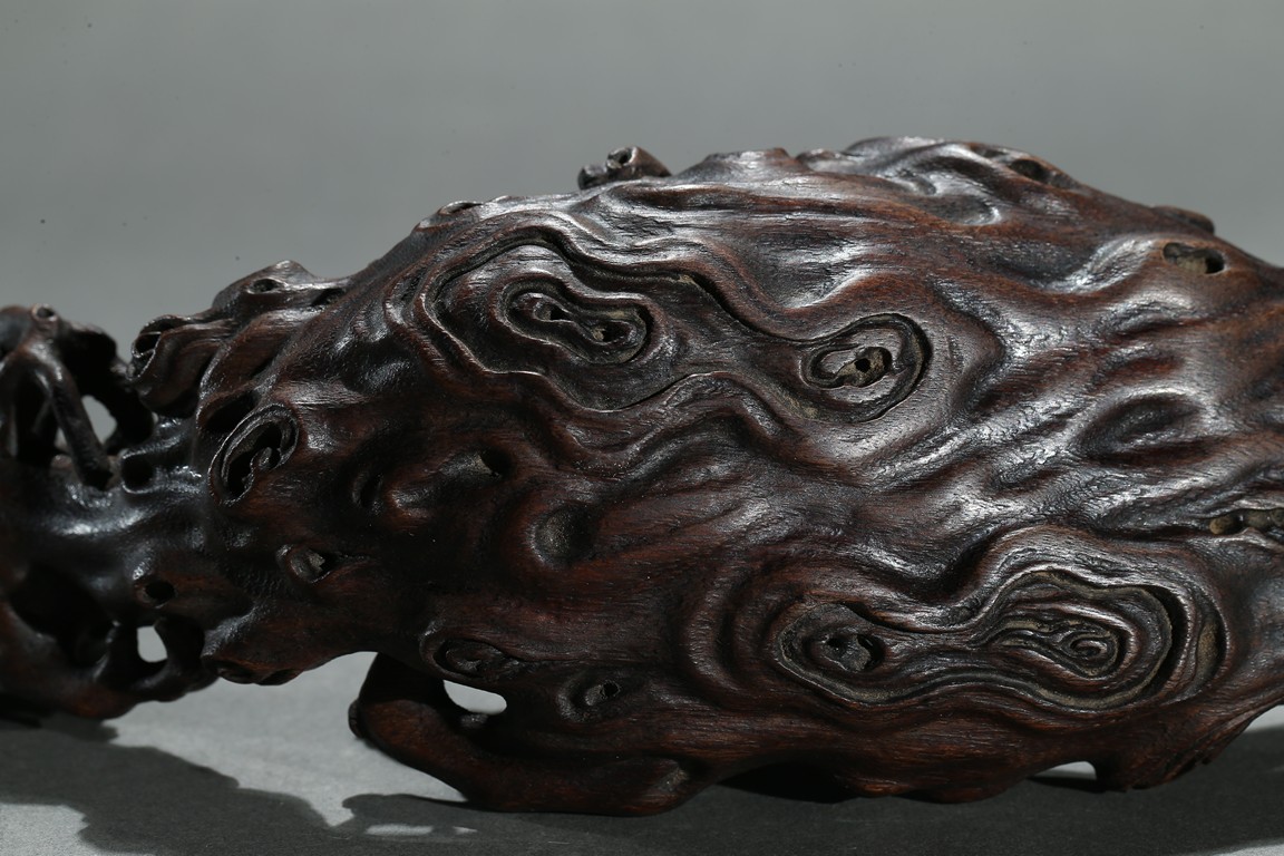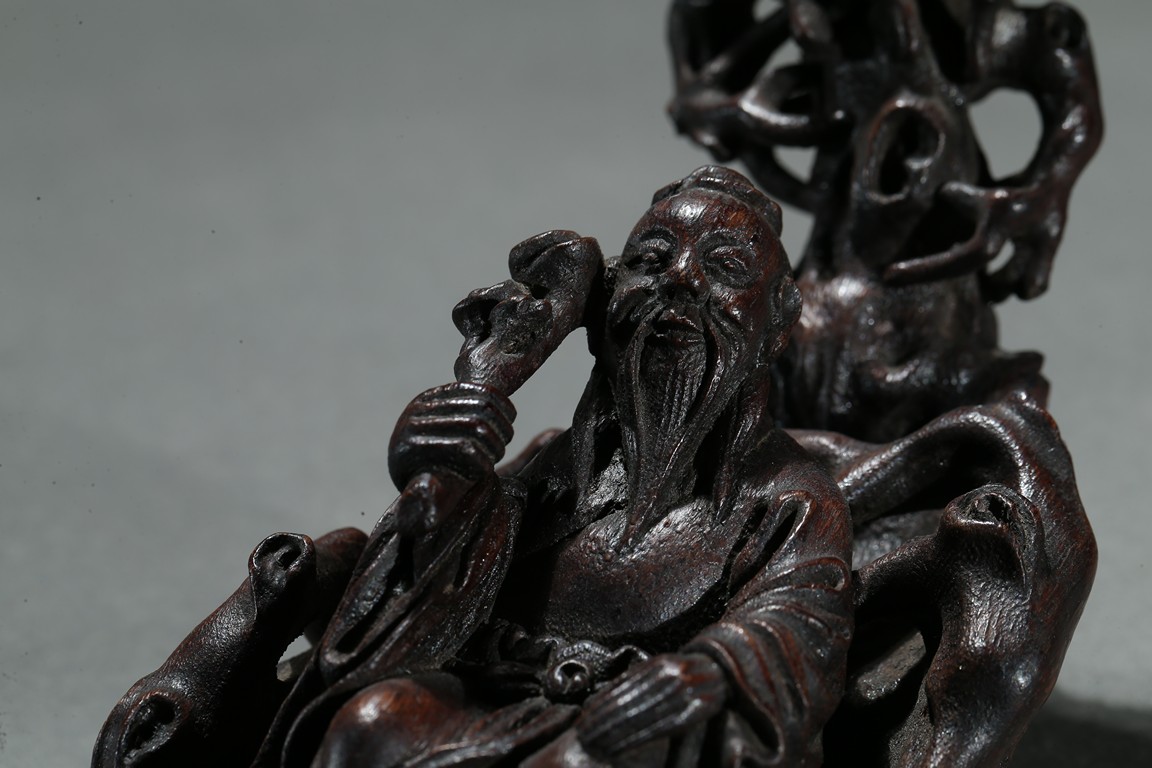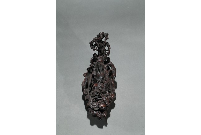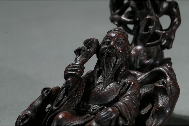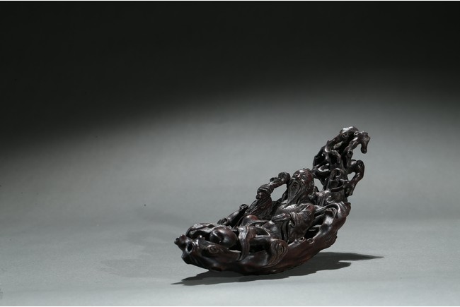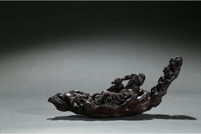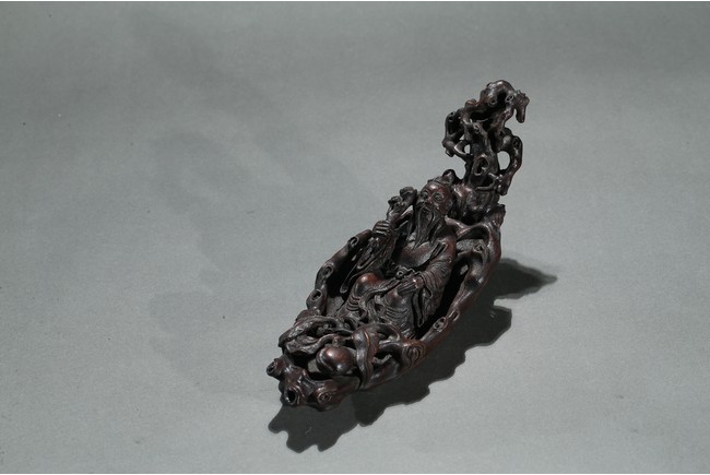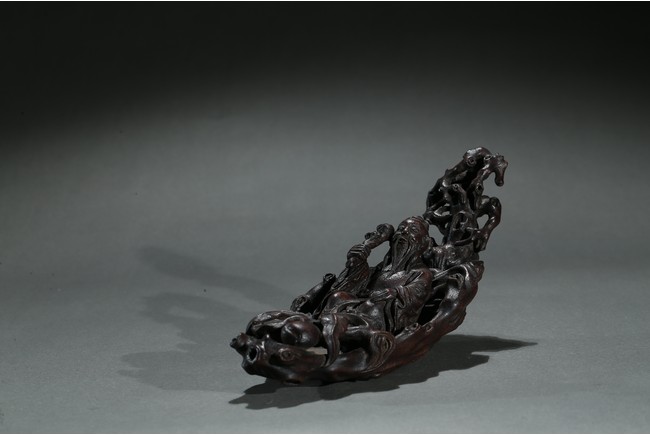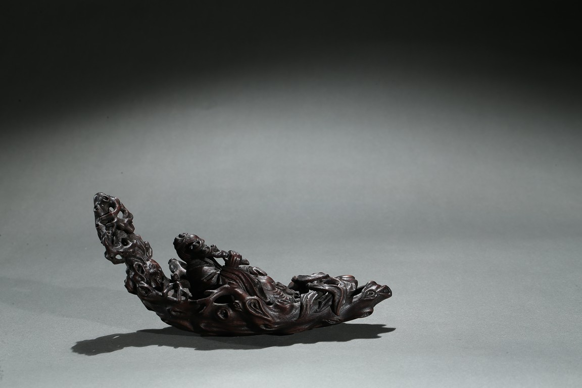 Finely carved as the Han dynasty statesman depicted seated inside a large hollowed log floating atop cresting waves carved along the sides and on the base, with a double-gourd flask tied to jutting branches at the other end. Qing Dynasty period.