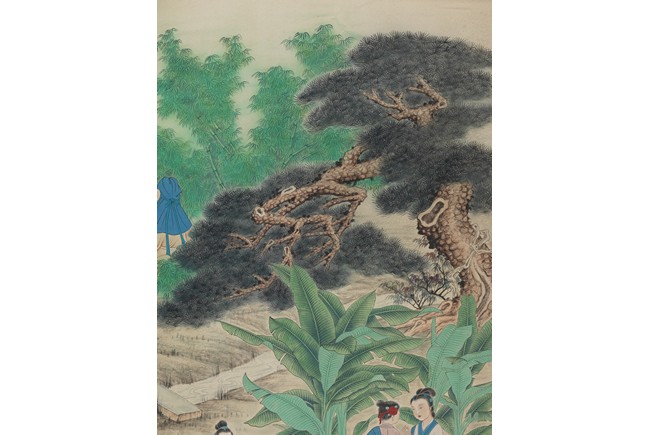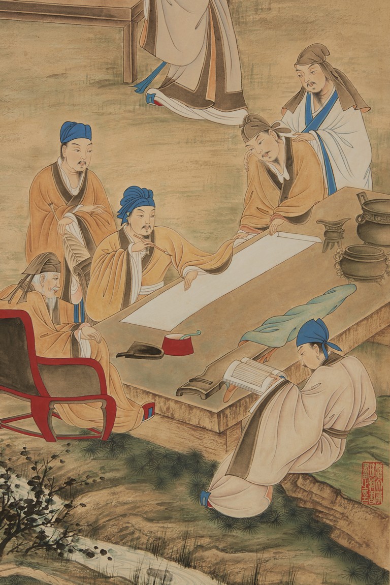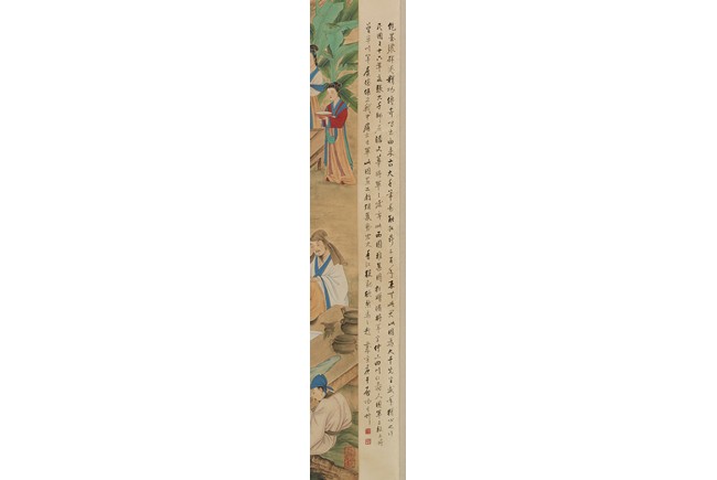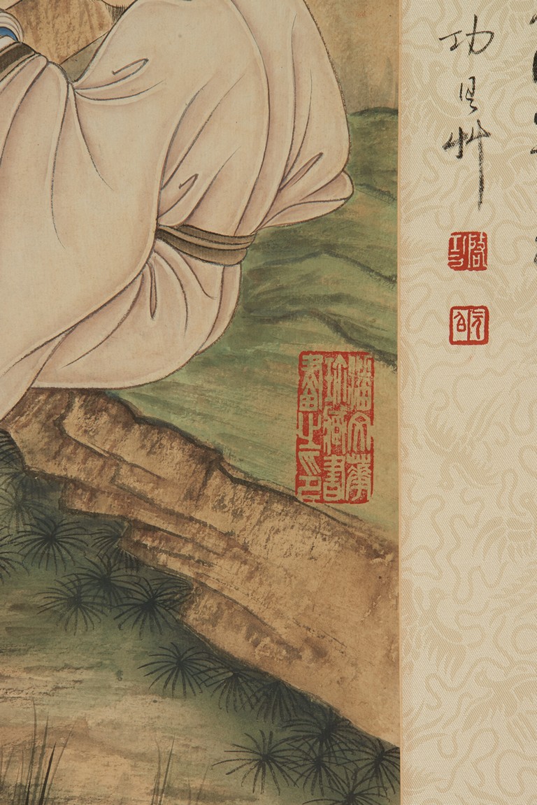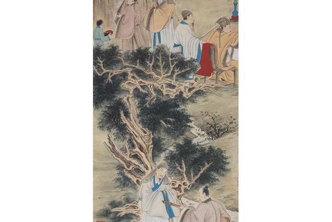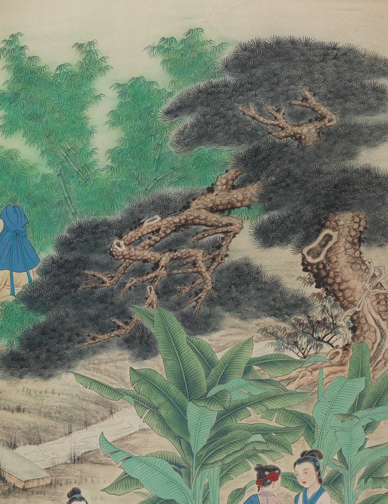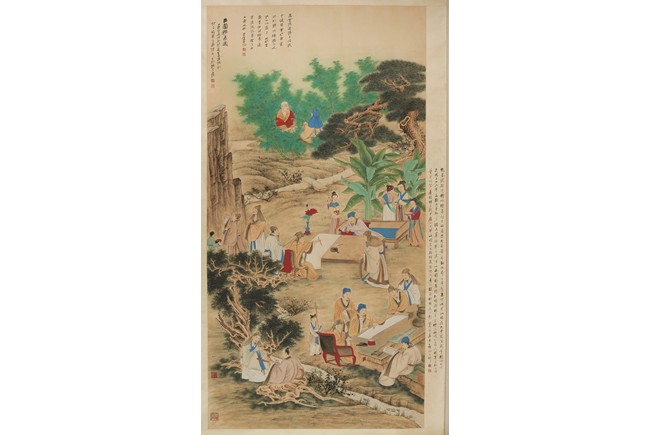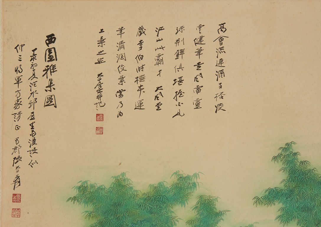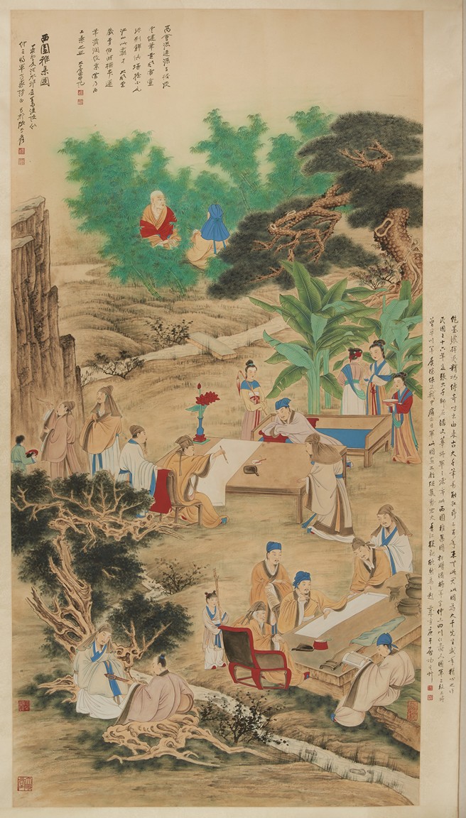 Color and ink on paper. Elegant Gathering in the Western Garden. Mounted. Inscribed and signed Daqian with two seals of the artist. Inscribed again with dedication to General Pan and signed Zhang Daqian with two seals of the artist. The lower right and left with additional three seal marks. Annotation by Qi Gong with two seals of the artist.