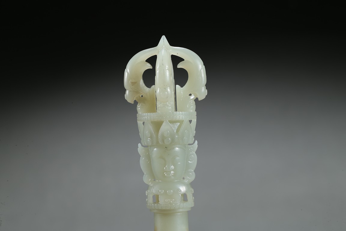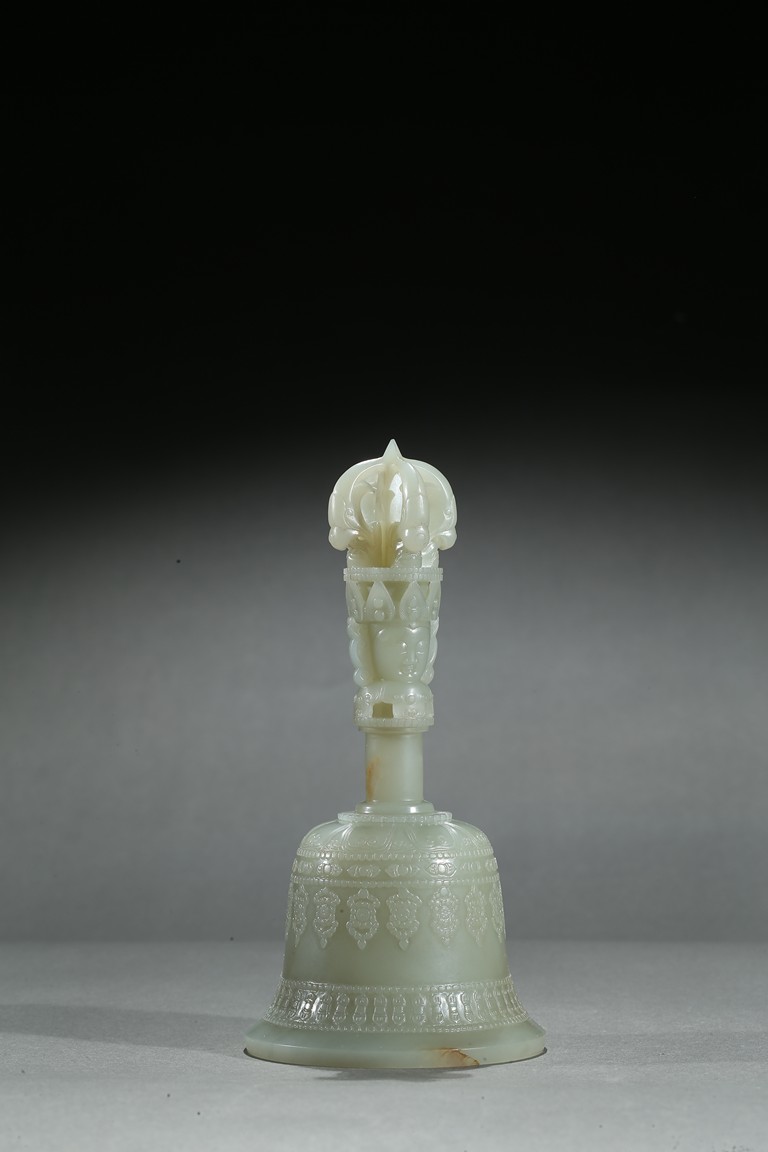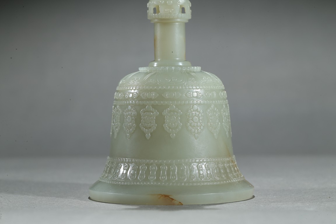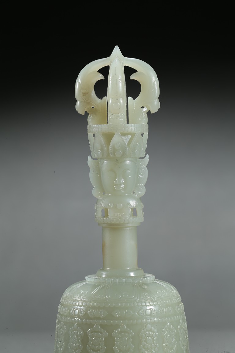 Delicately carved, the handle formed a central buddha head crowned with an eight-leaf diadem, with downcast eyes and a meditative expression, above the domed body finely carved with lotus petals and Tibetan bija syllables, vajra and dharmachakra motifs. The stone is of even greenish-white tone with minor russet inclusions. Mid-Qing Dynasty period.