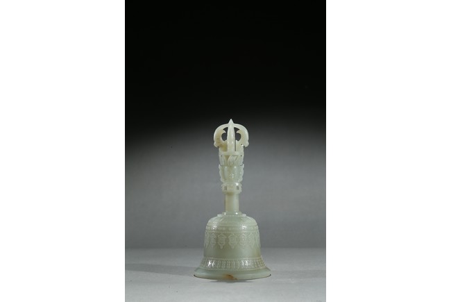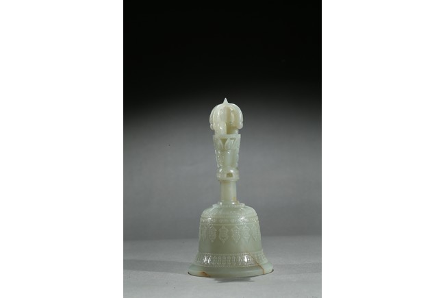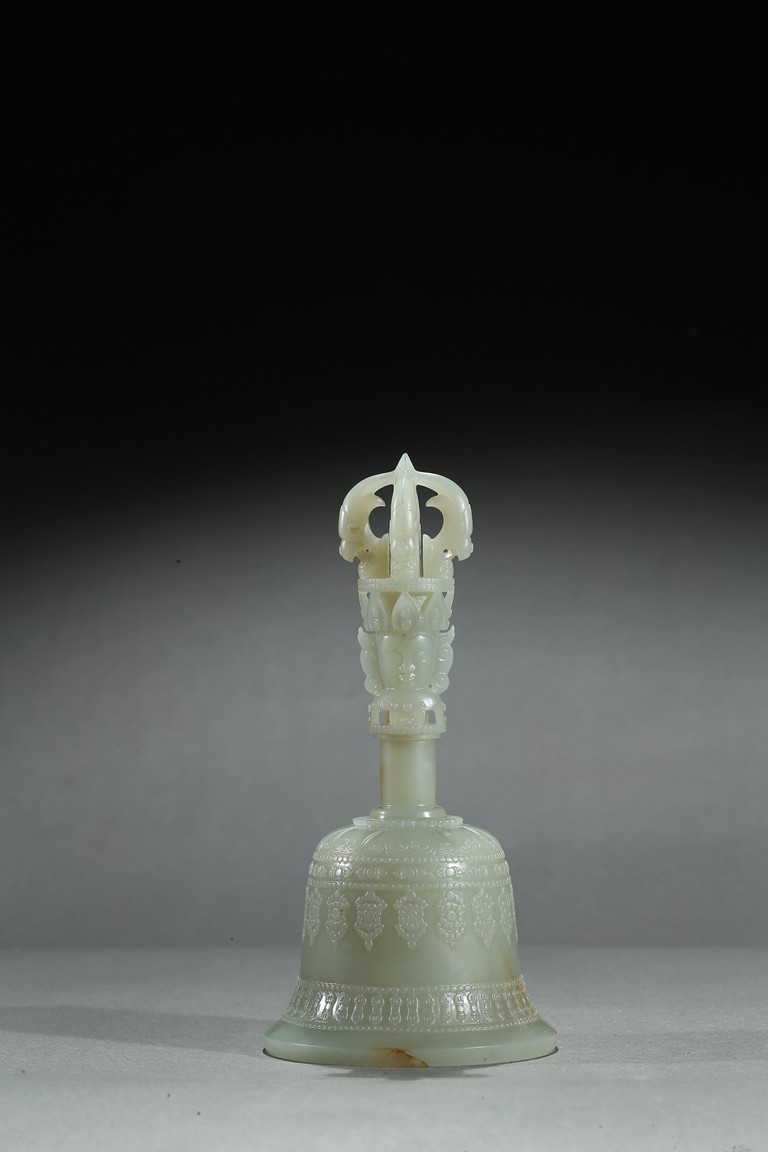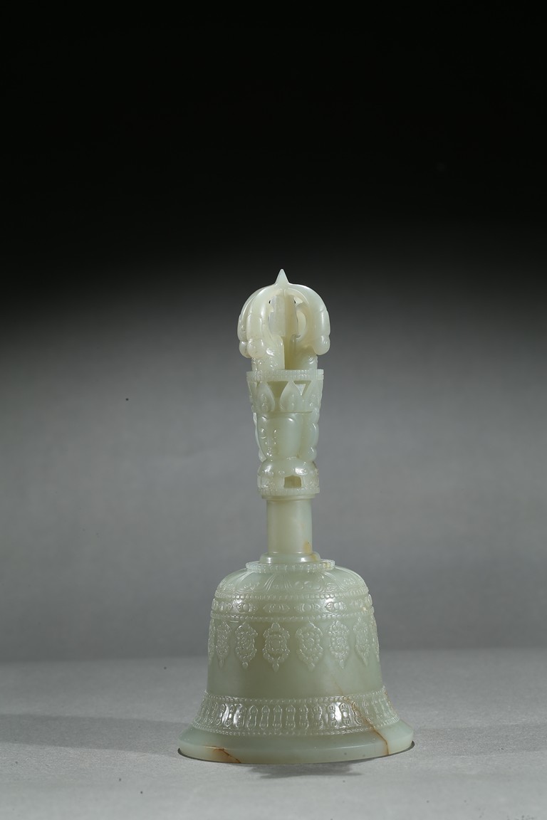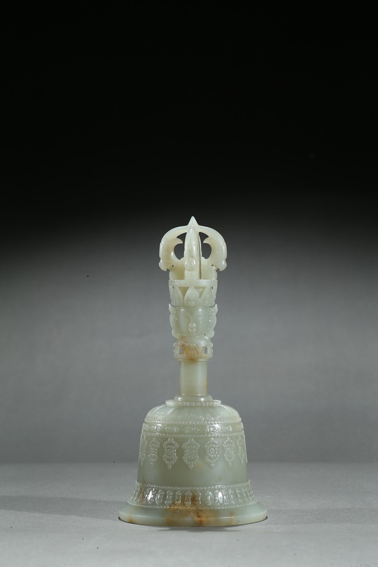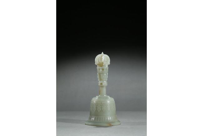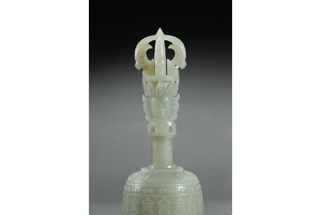 Delicately carved, the handle formed a central buddha head crowned with an eight-leaf diadem, with downcast eyes and a meditative expression, above the domed body finely carved with lotus petals and Tibetan bija syllables, vajra and dharmachakra motifs. The stone is of even greenish-white tone with minor russet inclusions. Mid-Qing Dynasty period.