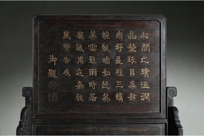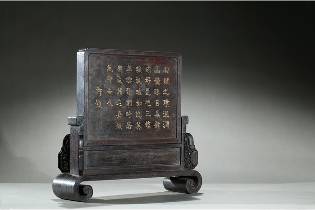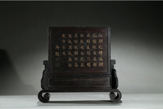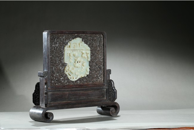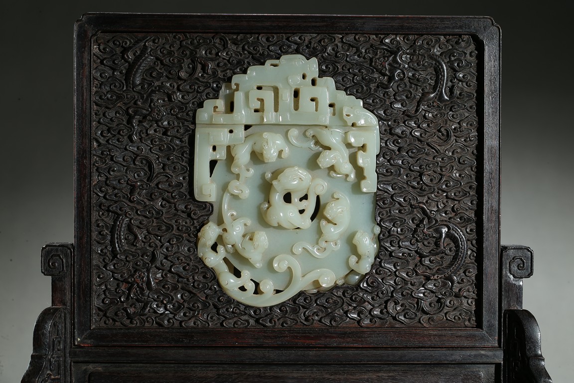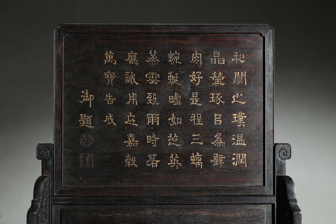 The jade bi of white tone finely carved in high relief with chilongs, mounted in a zitan stand delicately carved in low relief with writhing dragons emerging from dense auspicious clouds, the reverse with a gilt-painted imperial poem and seal marks, all supported by scroll-feet. Qing Dynasty period.