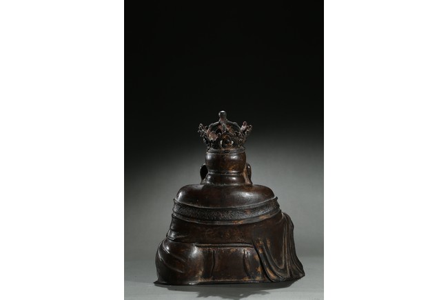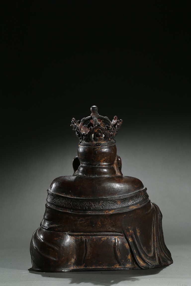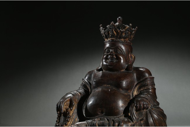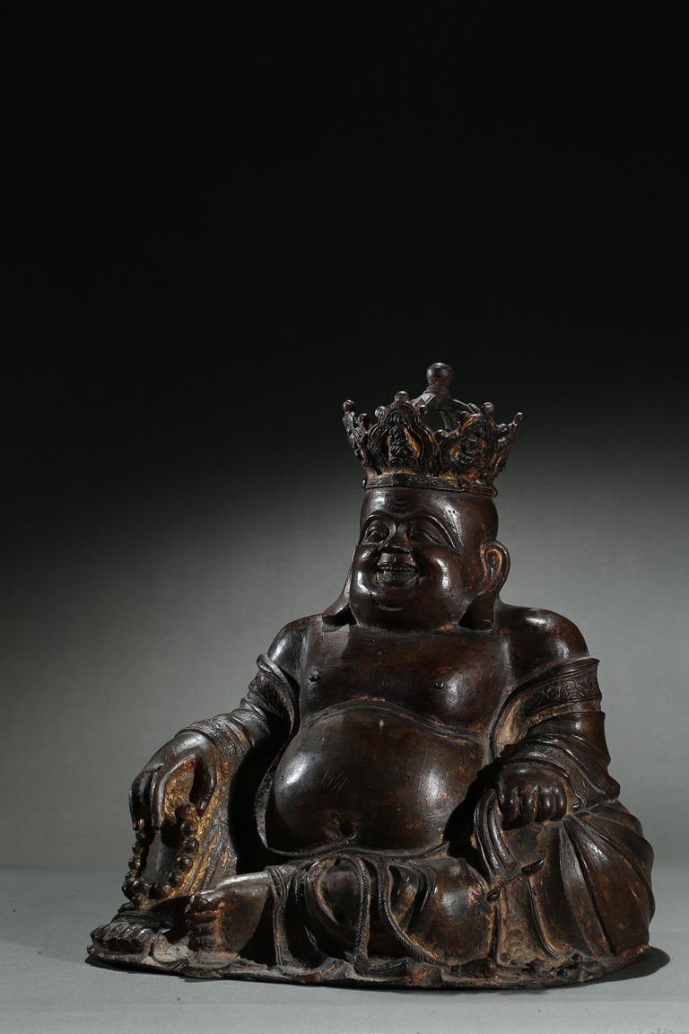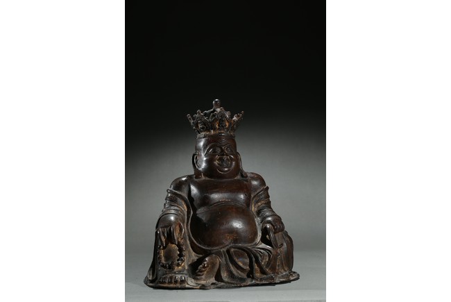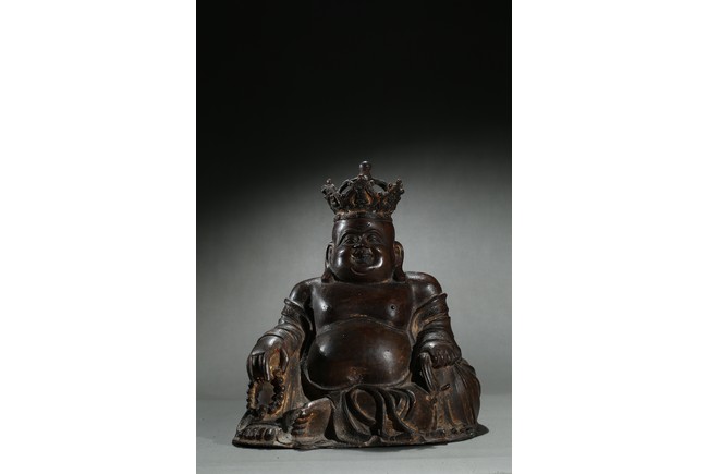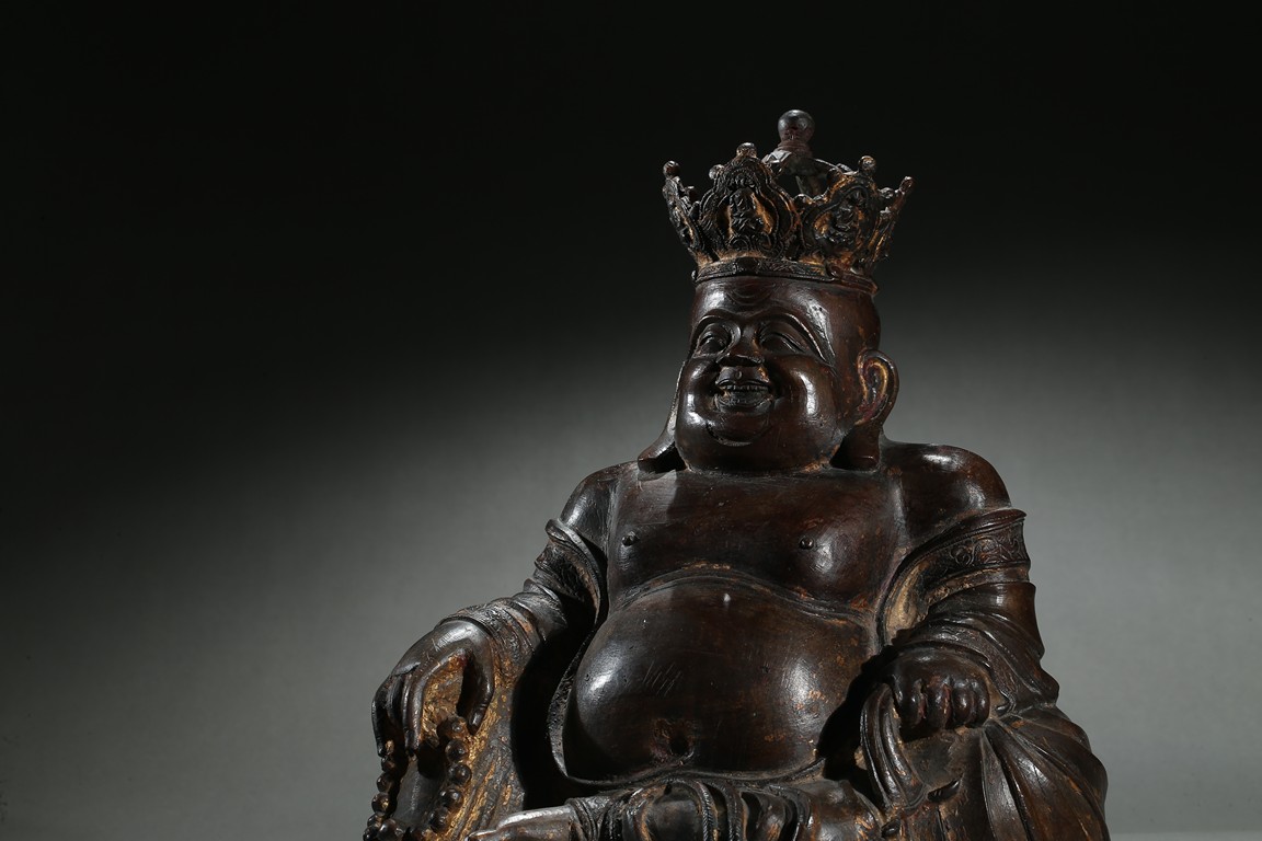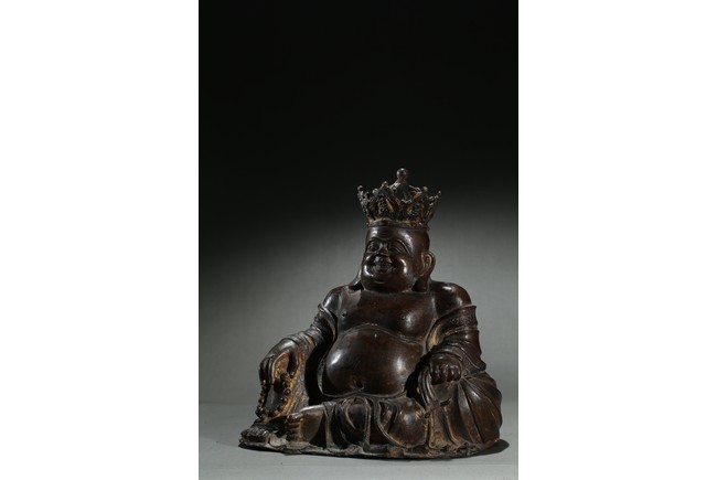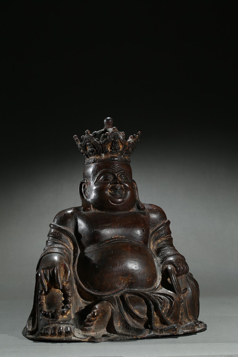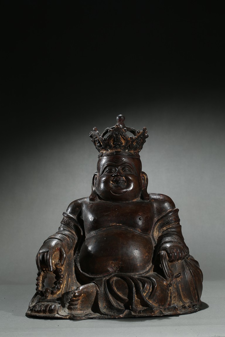 Parcel-gilt, shown seated with the right knee raised, holding a sack full of cash on the left hand and a strand of praying beads on the right, wearing a loose robe falling off the right shoulder and open to reveal his full belly, the head surmounted by a five-leaf diadem each enclosing a figure of Buddha Amitabha, the face with a hearty laughing expression. Early Qing Dynasty period.