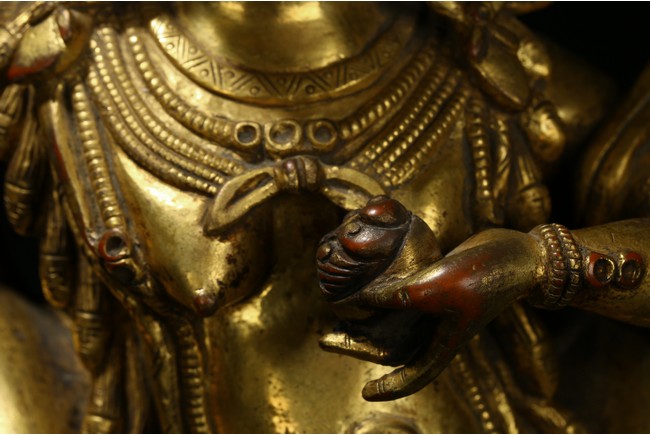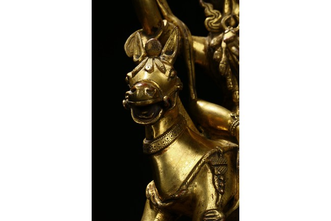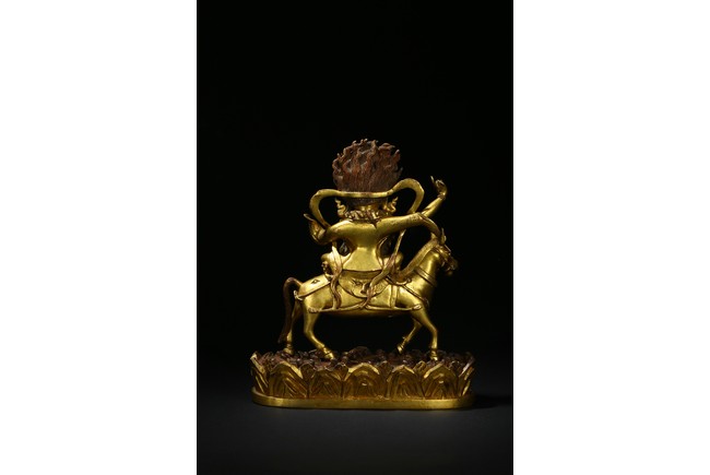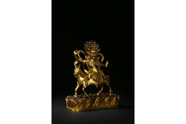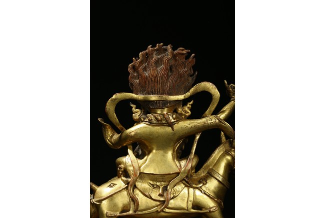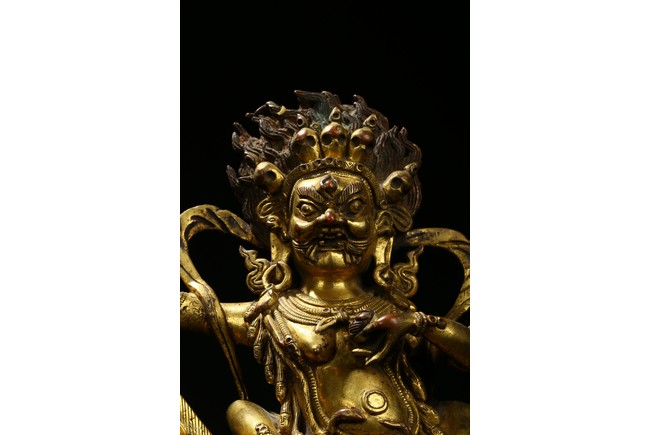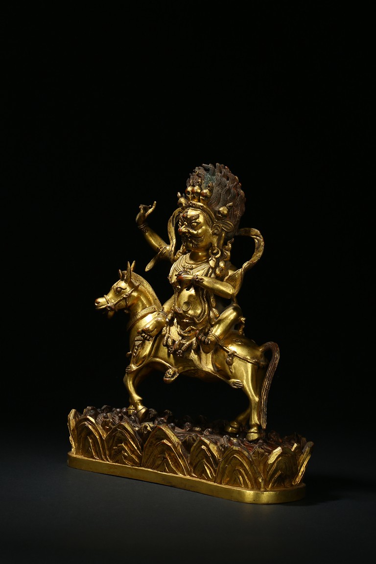 The deity seated on a galloping donkey, the left hand held to the chest and the right arm raised, wearing beaded jewels around the chest, the ferocious face with exaggerated features and pierced with a third eye between the eyebrows, the flaming hair surmounted by a five-skull crown, all striding through a sea of blood and body parts contained within a ring of mountains. Qing Dynasty period.