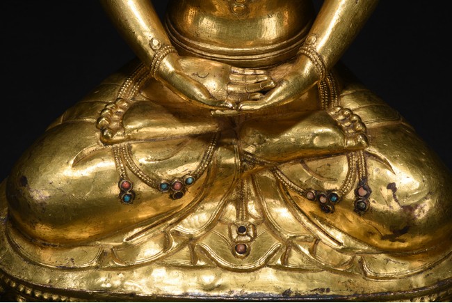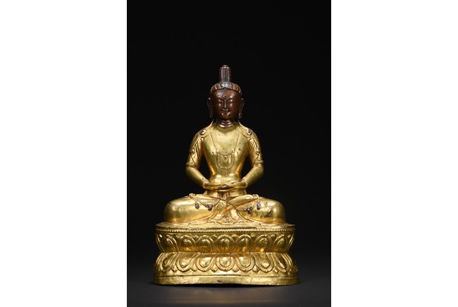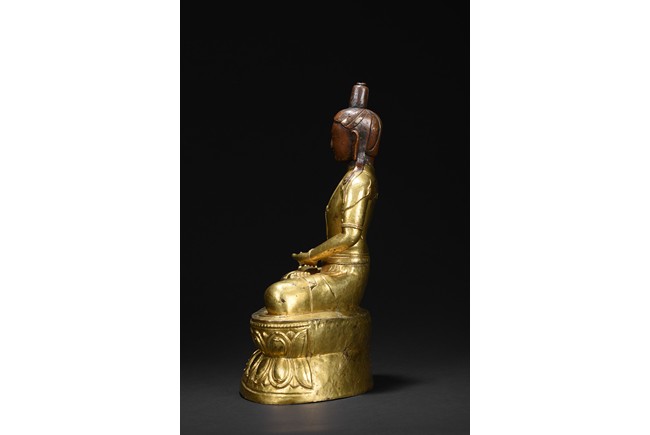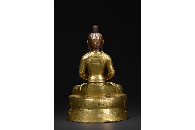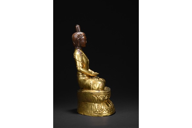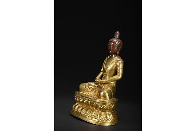 The bodhisattva is shown seated upon a double lotus throne in dhyanasana, hands in dhyana mudra, wearing loose robe and revealing the adorned chest, face with benevolent expression and topped tall ushnisha. Overall richly gilt except face. Early Qing Dynasty period.