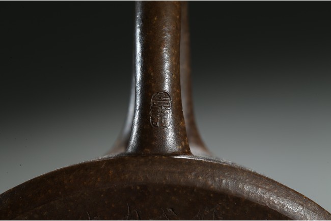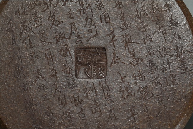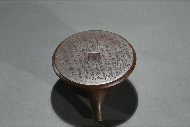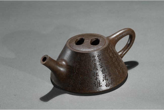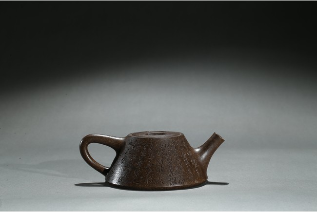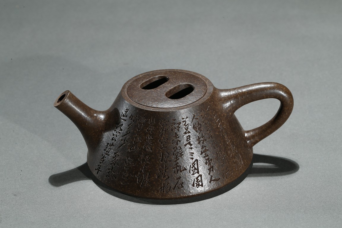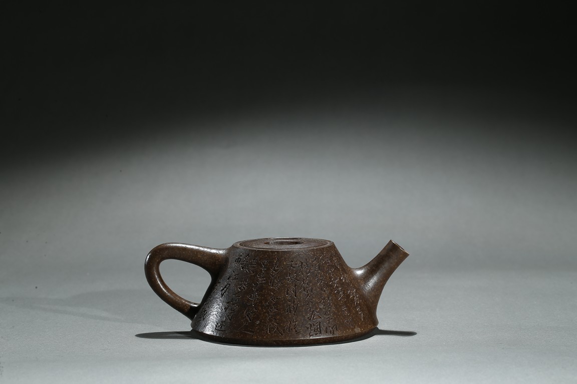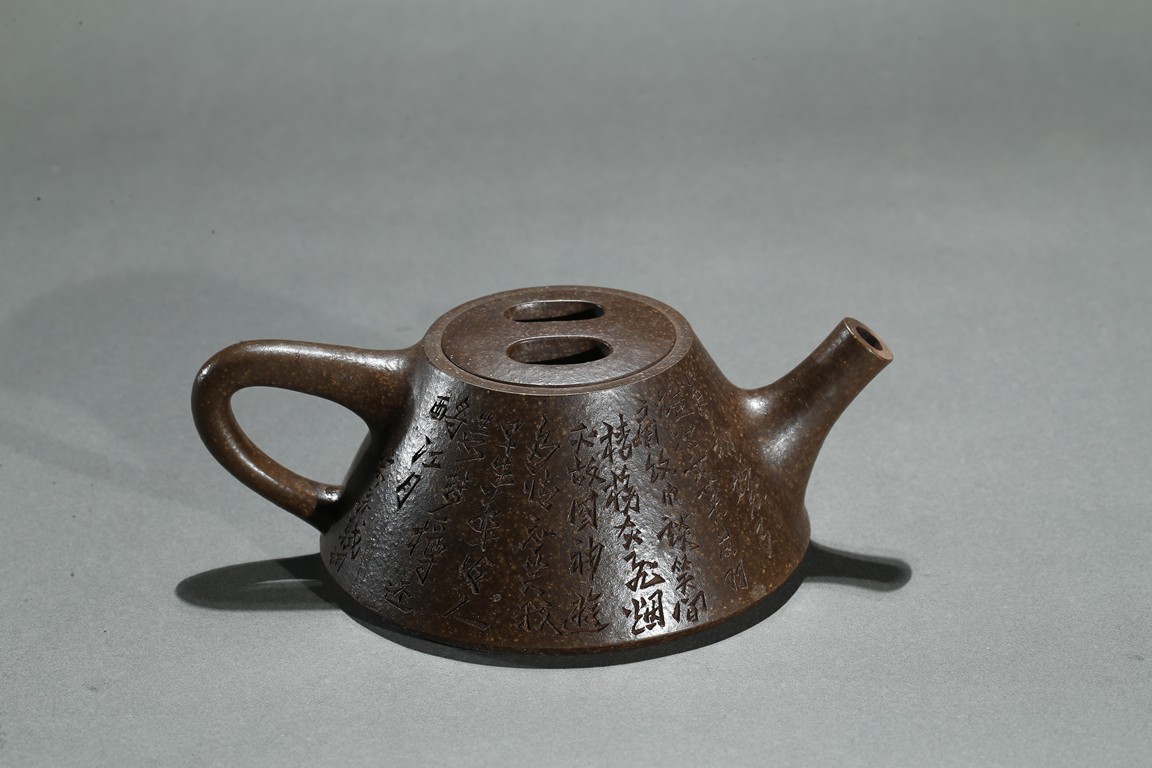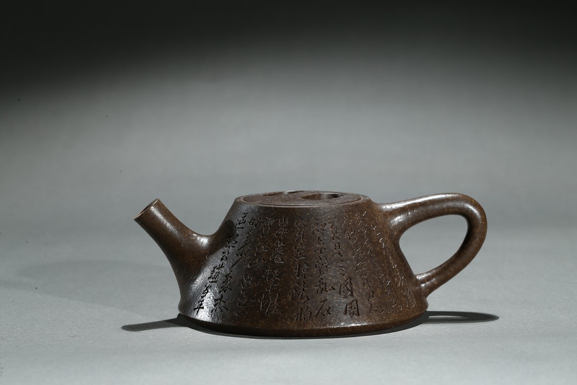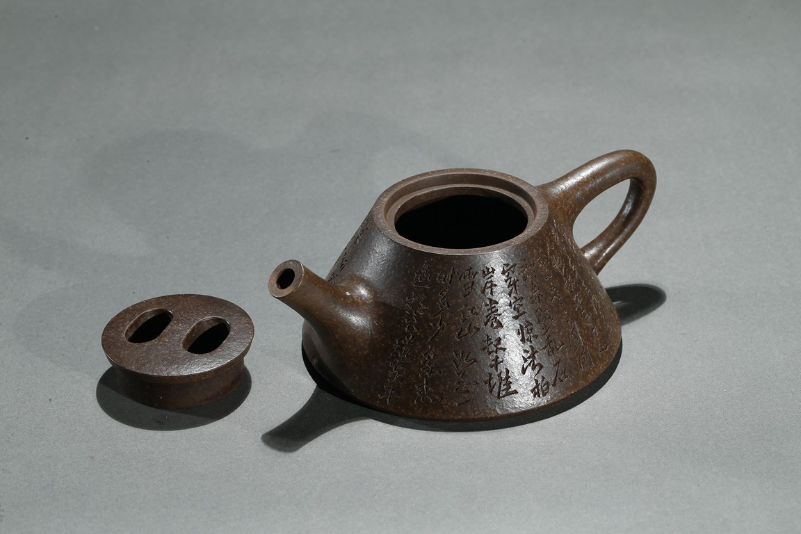 Of inverted conical shape, the body and base finely carved with inscription in running script, flanked by a curved v-shaped handle to one side and a pointed spout to the other side, fitted with a round cover with two oval shaped openings. The end of handle impressed with a two character mark, the base with a four character mark 'Wu Ling Yi Ren'. 20th Century.