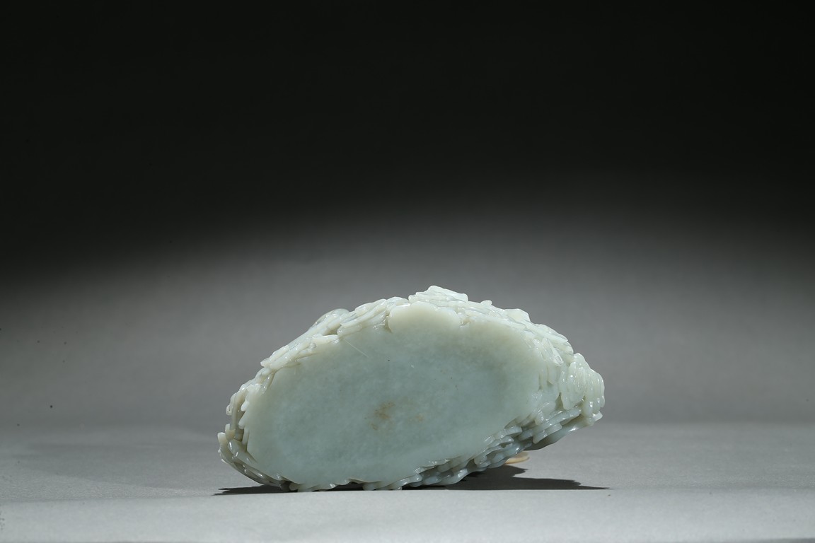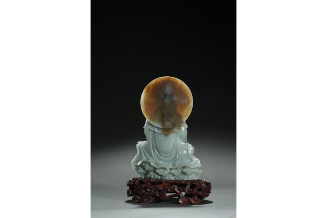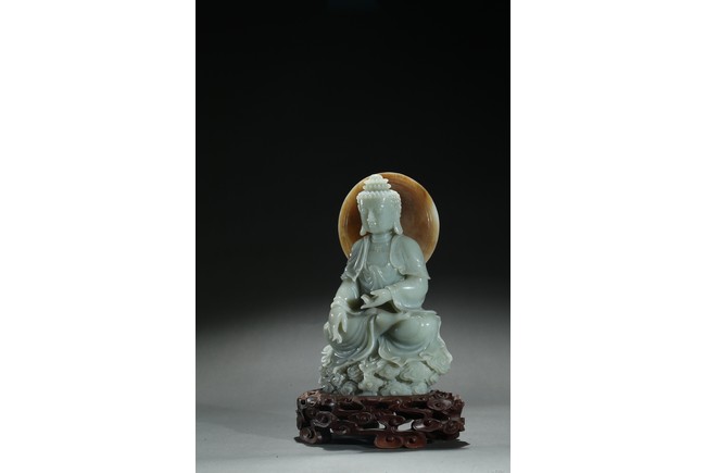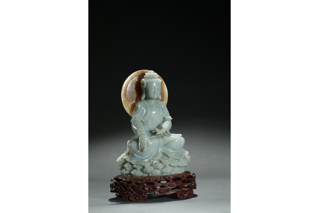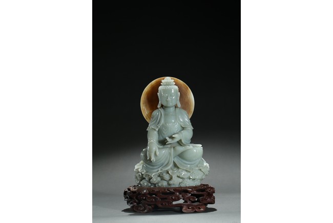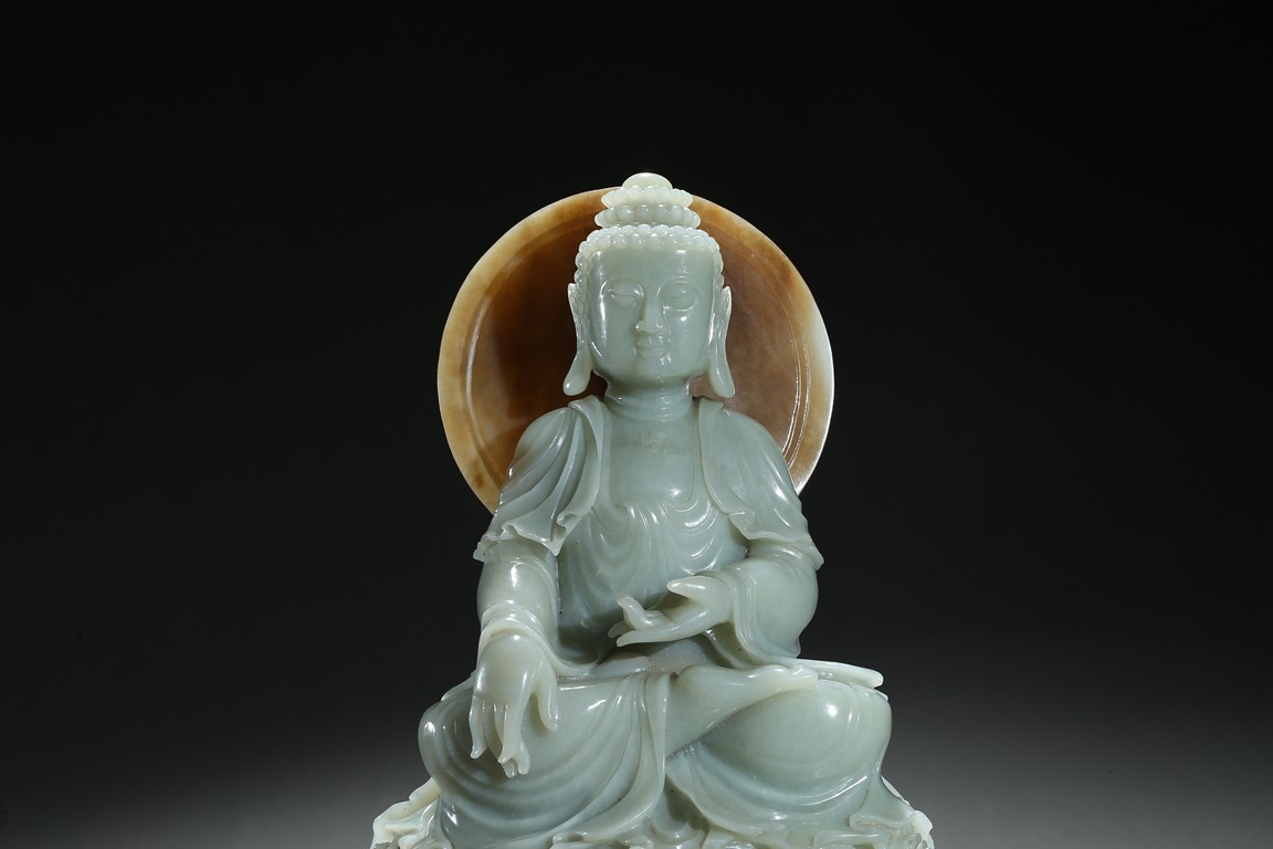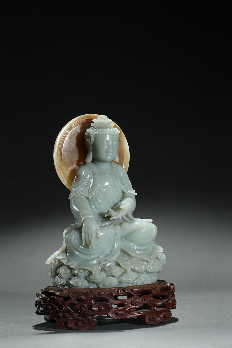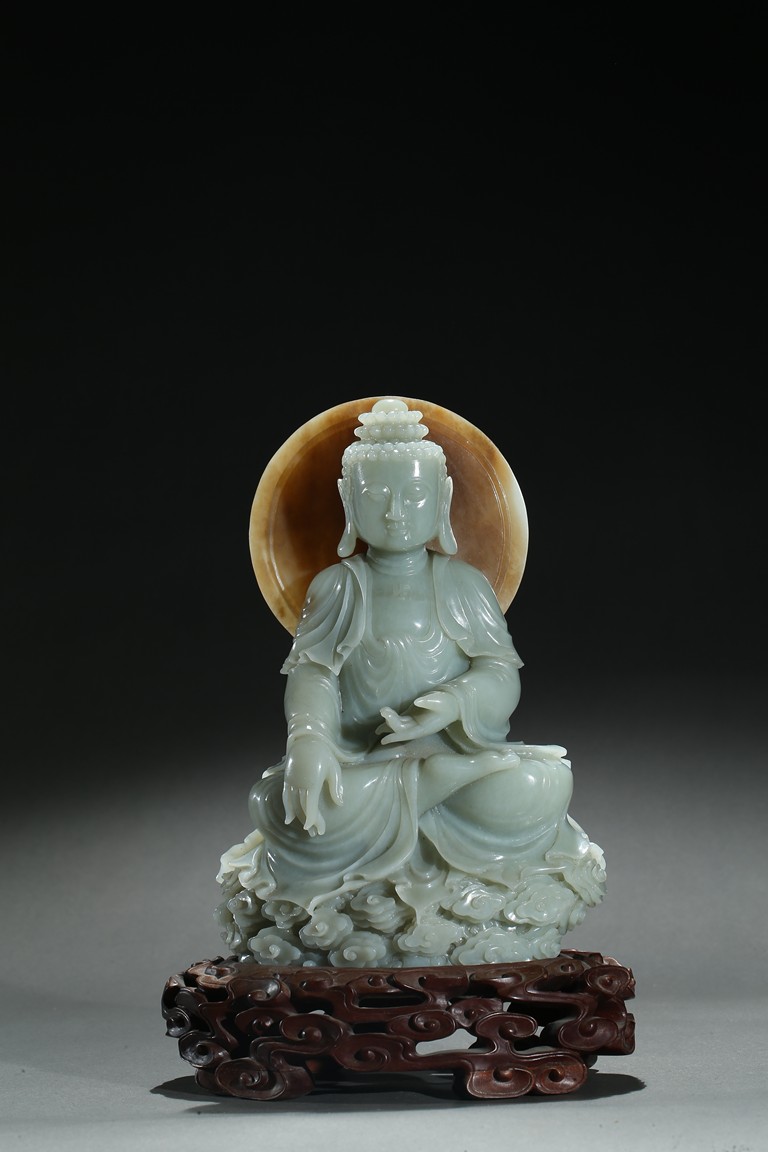 Seated in dhyanasana on auspicious cloud base, his hands in bhumisparsa mudra, clad in a diaphanous sanghati with the folds elegantly piled beneath the ankles, the face with serene expression flanked by pendulous earlobes and surmounted by a prominent ushnisha, backed by a russet jade carved roundel as nimbus, all supported on a hardwood carved cloud stand.