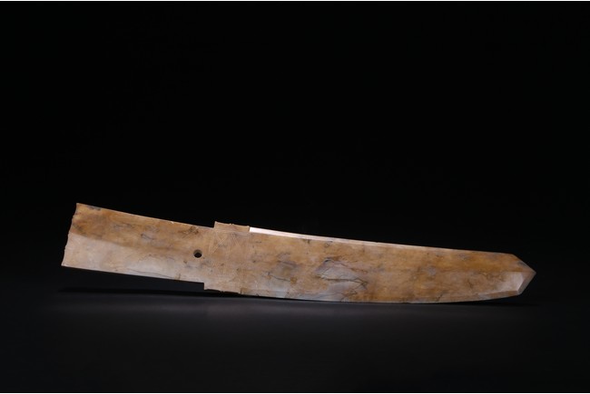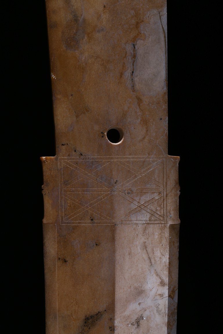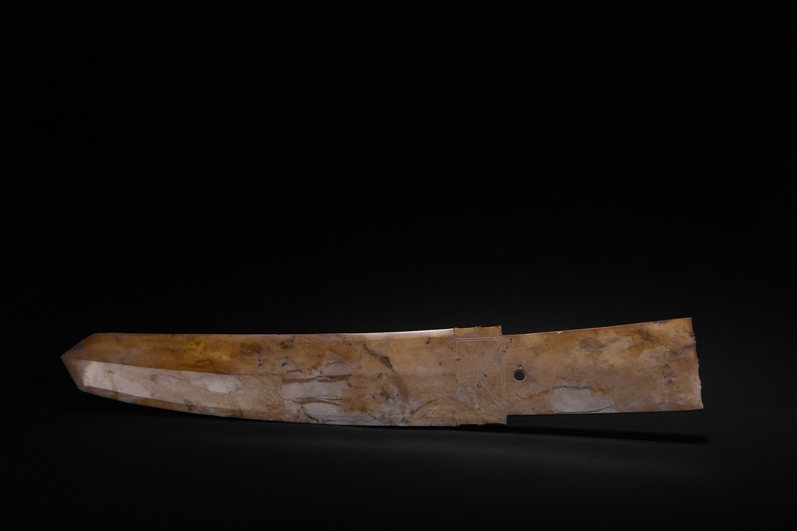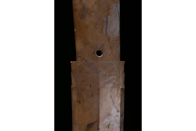 The elongated blade slightly curved, with median ridge on extending from one end to the tip, with holes drilled from both side near the lower end, in between incised with geometric pattern. Shang Dynasty period.